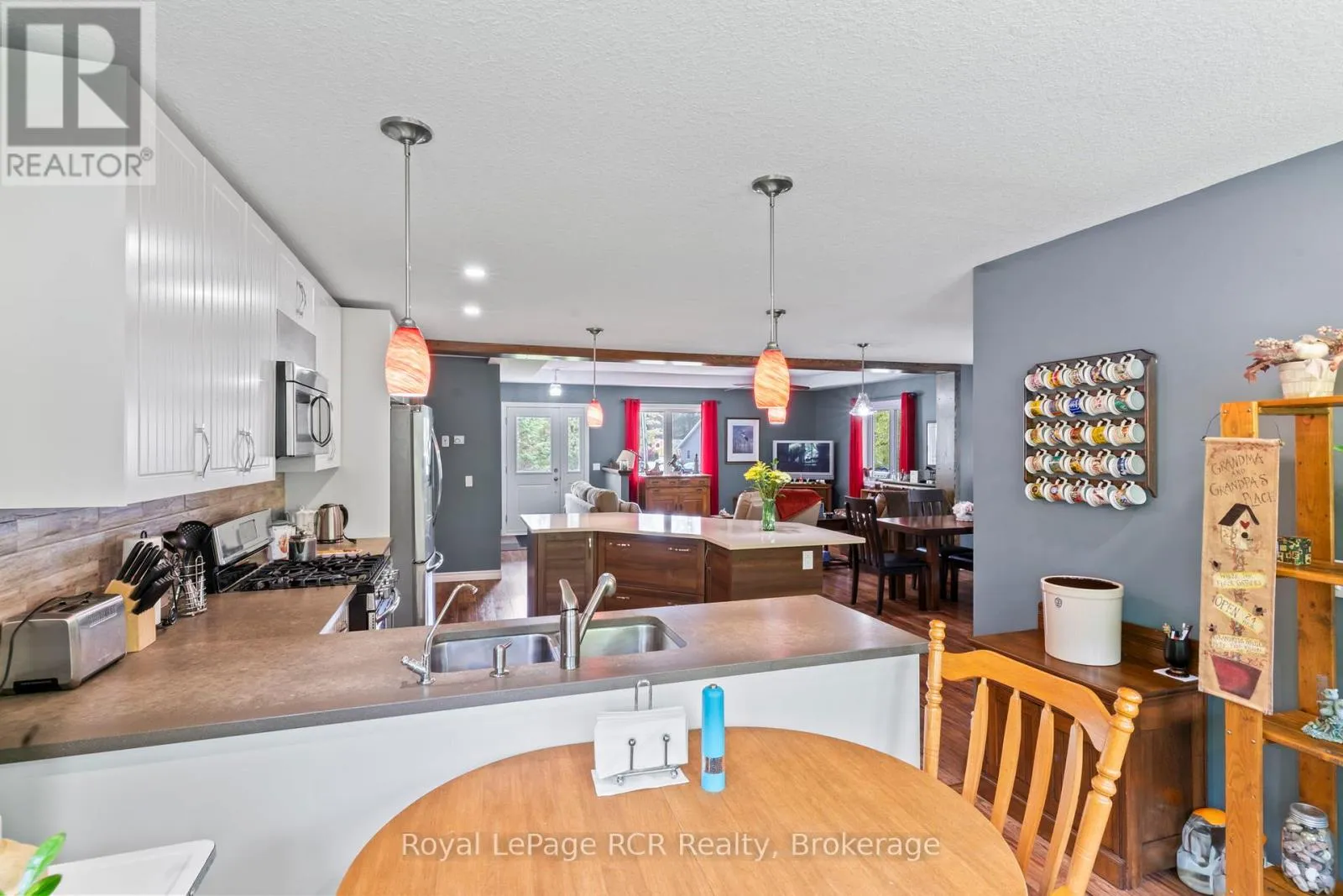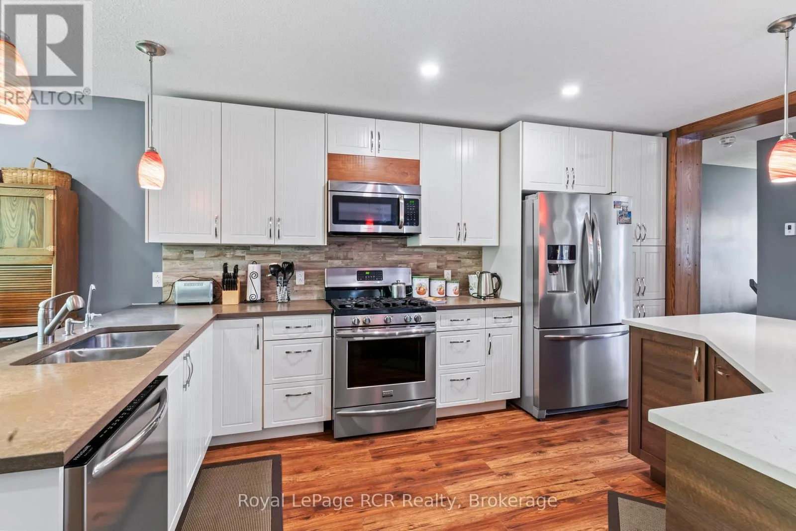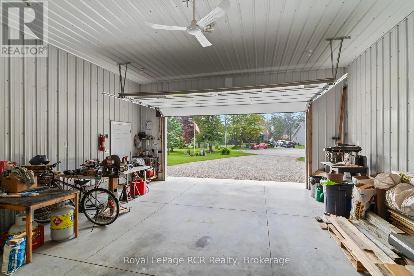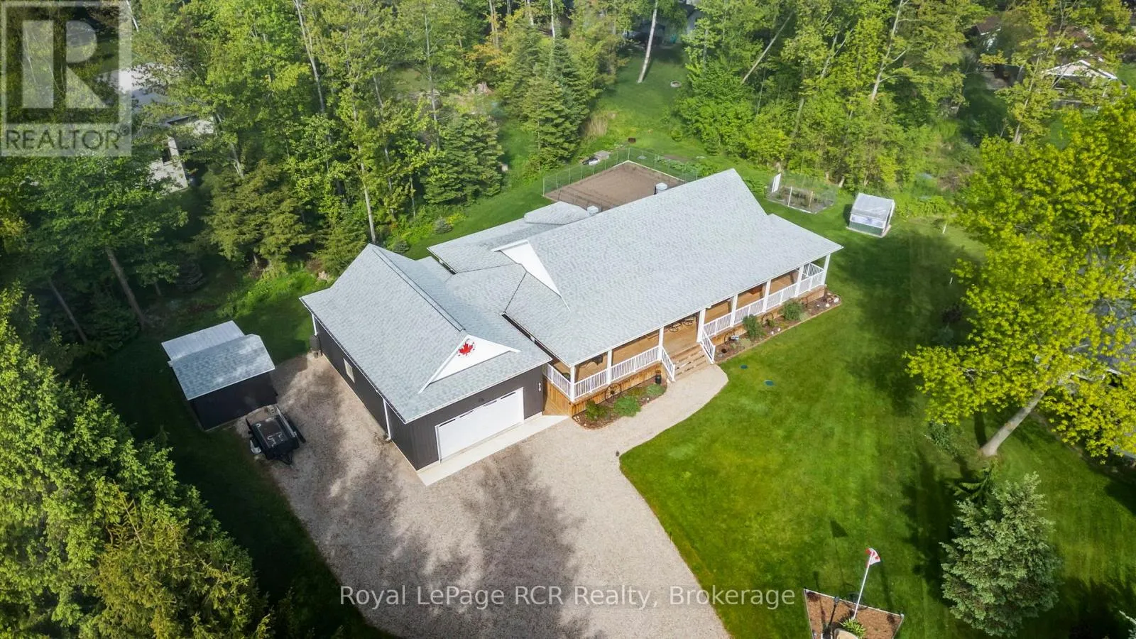 Cross Streets: Abenaki and Cayuga. ** Directions: Turn East off Huron Road, onto Abenaki then onto Cayuga Crescent. Welcome to this charming 3 bedroom bungalow located in the peaceful village setting of Point Clark. Situated on a dead-end cul-de-sac, this beautiful 8 year old home offers a serene and private setting, perfect for those seeking tranquility. Upon entering the home, imagine relaxing on the 130' of covered deck space, then you will be greeted by an open concept layout, creating a spacious & inviting atmosphere. The open kitchen, dining room, dinette and living room offer an entertainers delight. With an abundance of cabinetry, large working island with quartz and concrete countertops making it a chefs delight. Impressive ensuite bathroom with double sinks and large walk in shower, conveniently located off the primary bedroom with a large walk-in closet with custom made barn door. Added in 2025 was a split heat/air unit which will be a perfect for the summer heat. Whether you envision a home gym, a play area for the kids, or a cozy entertainment space, the full unspoiled basement provides ample room to bring creative ideas to life. For car or woodworking enthusiasts you will be pleased to know that this property includes a detached double car garage with an attached workshop. The home features in-floor heat throughout the main floor, basement and workshop. This additional space allows you to indulge in your hobbies or provides ample storage for your vehicles and equipment. The exterior of the house boasts immaculate landscaping, creating a visually appealing and well maintained curb appeal. The yard is thoughtfully designed, making it a perfect space for outdoor activities, gardening (which if fully fenced to avoid wild life) or simply to enjoy the fresh air. Another major bonus is the location to the beach/lighthouse and marina. Imagine taking leisurely strolls along the shoreline, enjoying the sunsets, and embracing the natural beauty mother nature surrounds you in. (id:27476)
