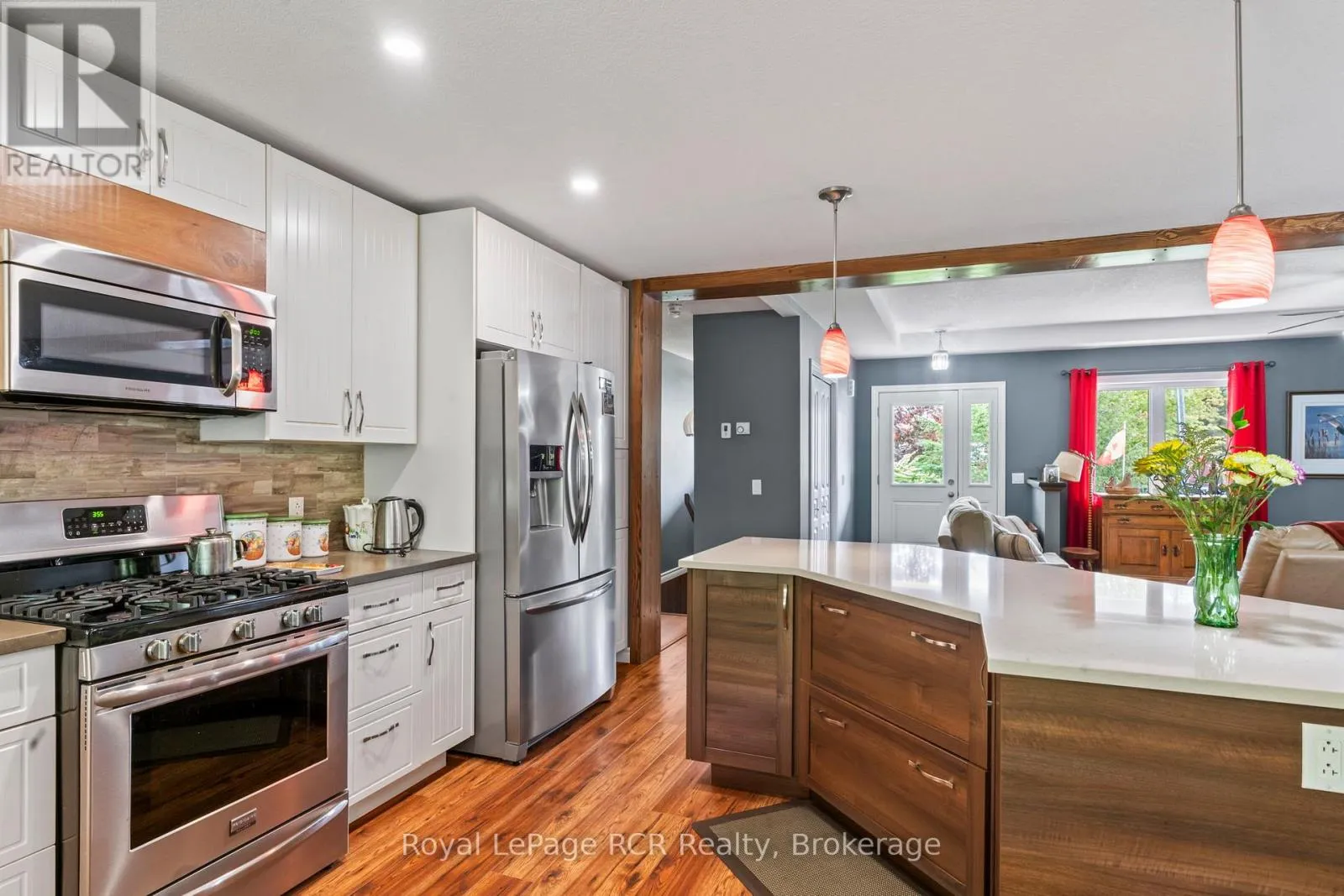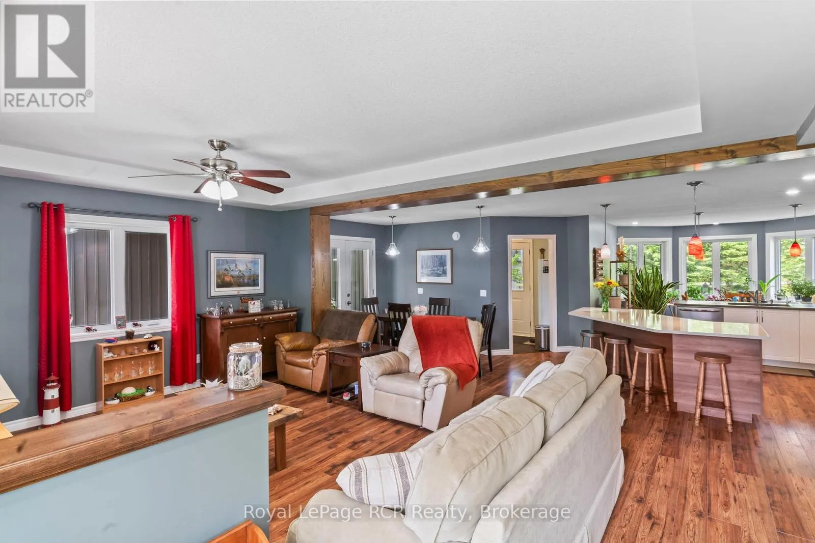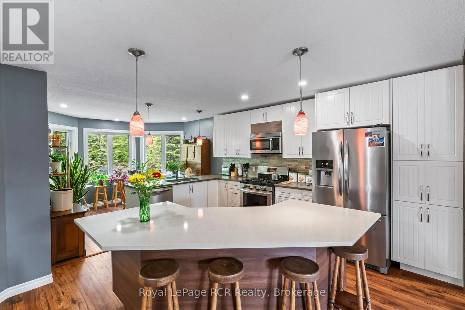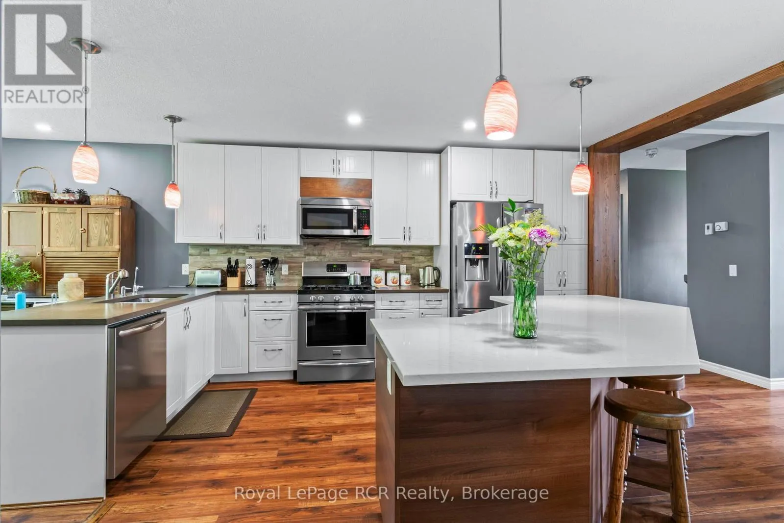Cross Streets: Abenaki and Cayuga. ** Directions: Turn East off Huron Road, onto Abenaki then onto Cayuga Crescent. Welcome to this charming 3 bedroom bungalow located in the peaceful village setting of Point Clark. Situated on a dead-end cul-de-sac, this beautiful 8 year old home offers a serene and private setting, perfect for those seeking tranquility. Upon entering the home, imagine relaxing on the 130' of covered deck space, then you will be greeted by an open concept layout, creating a spacious & inviting atmosphere. The open kitchen, dining room, dinette and living room offer an entertainers delight. With an abundance of cabinetry, large working island with quartz and concrete countertops making it a chefs delight. Impressive ensuite bathroom with double sinks and large walk in shower, conveniently located off the primary bedroom with a large walk-in closet with custom made barn door. Added in 2025 was a split heat/air unit which will be a perfect for the summer heat. Whether you envision a home gym, a play area for the kids, or a cozy entertainment space, the full unspoiled basement provides ample room to bring creative ideas to life. For car or woodworking enthusiasts you will be pleased to know that this property includes a detached double car garage with an attached workshop. The home features in-floor heat throughout the main floor, basement and workshop. This additional space allows you to indulge in your hobbies or provides ample storage for your vehicles and equipment. The exterior of the house boasts immaculate landscaping, creating a visually appealing and well maintained curb appeal. The yard is thoughtfully designed, making it a perfect space for outdoor activities, gardening (which if fully fenced to avoid wild life) or simply to enjoy the fresh air. Another major bonus is the location to the beach/lighthouse and marina. Imagine taking leisurely strolls along the shoreline, enjoying the sunsets, and embracing the natural beauty mother nature surrounds you in. (id:27476)