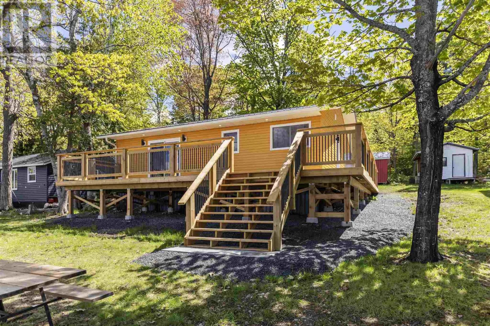 Highway 17 to Sunset Beach Rd Escape to an all season retreat on the shores of beautiful Bright Lake. This is a completely finished and extensively renovated cottage on a municipal maintained road, offering stunning westerly views, relax in comfort on your newer wrap around deck watching the sunset over the lake. Open concept with a warm natural charm, pine floors and walls. Large entrance mud room is perfect for storing your gear after lake adventures. All finishings are top of the line, beautiful custom kitchen, Large shed/ workshop. Heat pump offers heat & AC and is flush on the ceiling, blown insulation with R58 Value, upgraded construction to 2x6, 200 amp, 2000 gallon holding tank, spray foam insulation under, fresh gravel drive, main fl laundry, peaceful year round Residence or your vaca getaway! (id:27476)