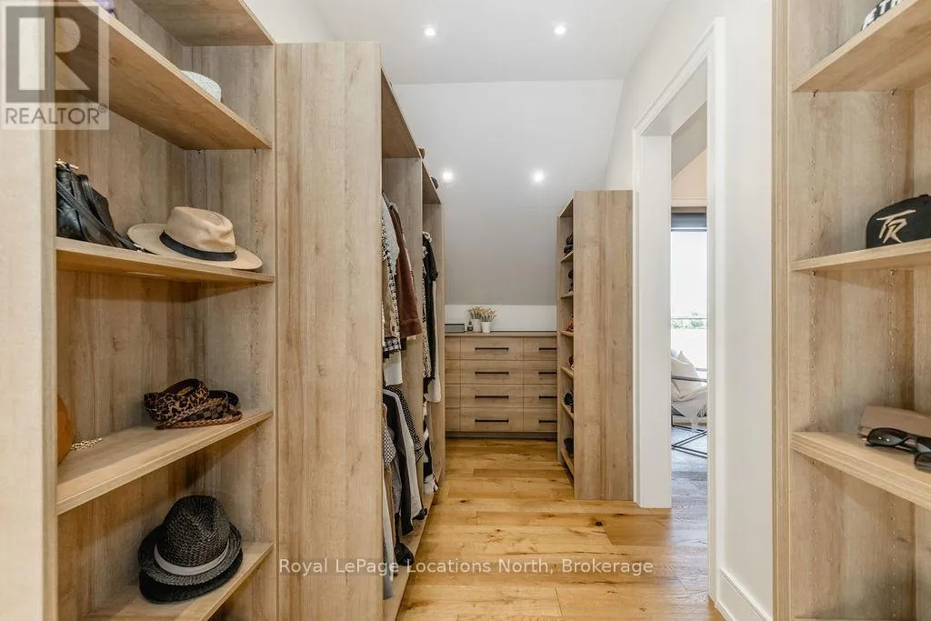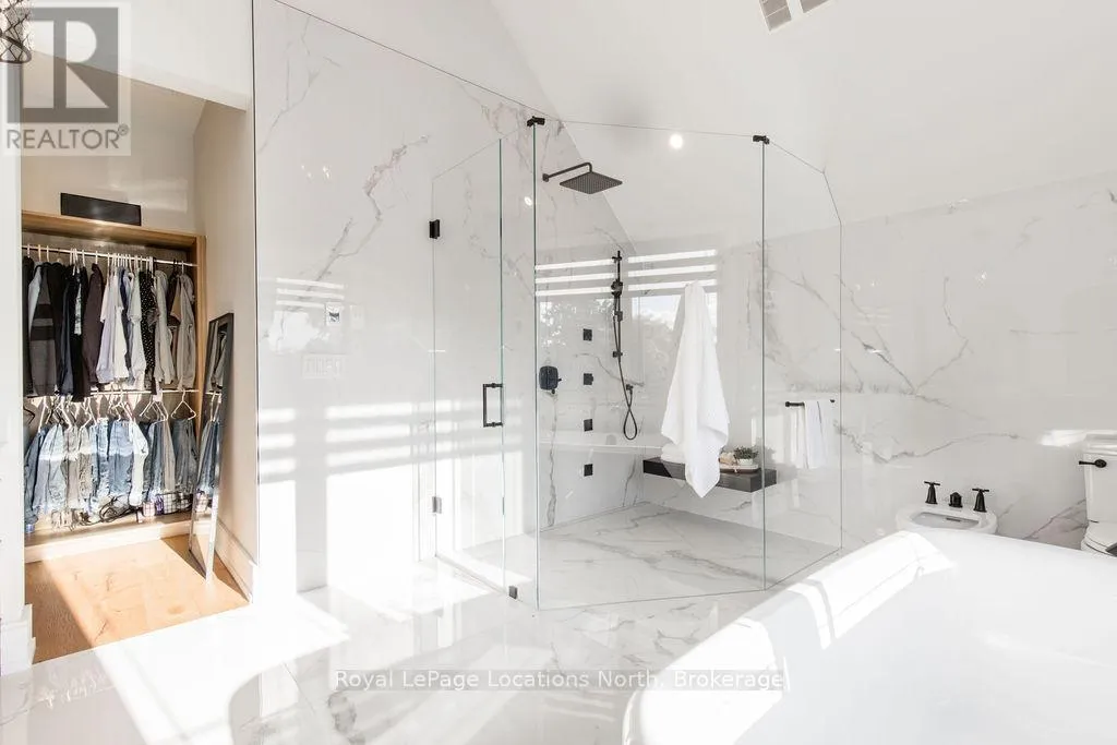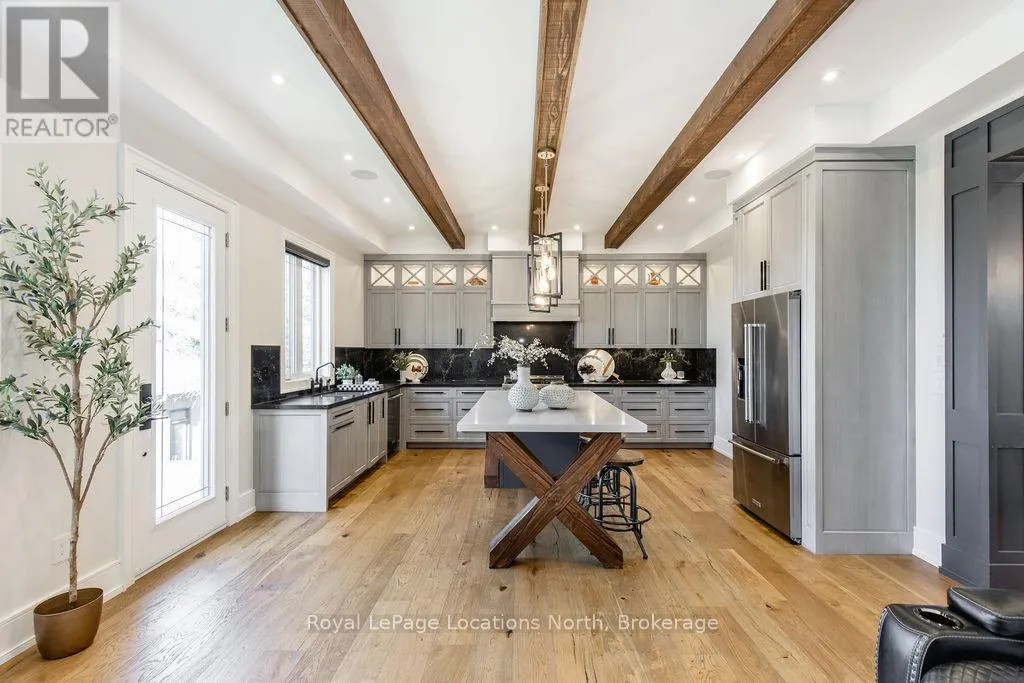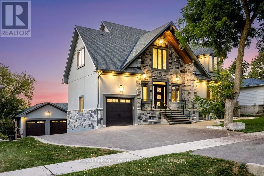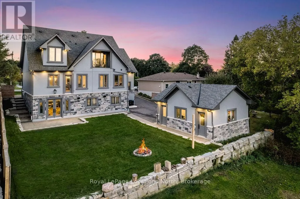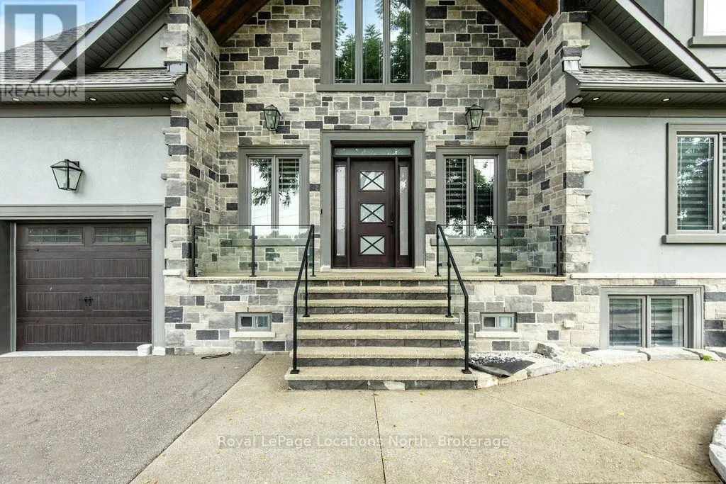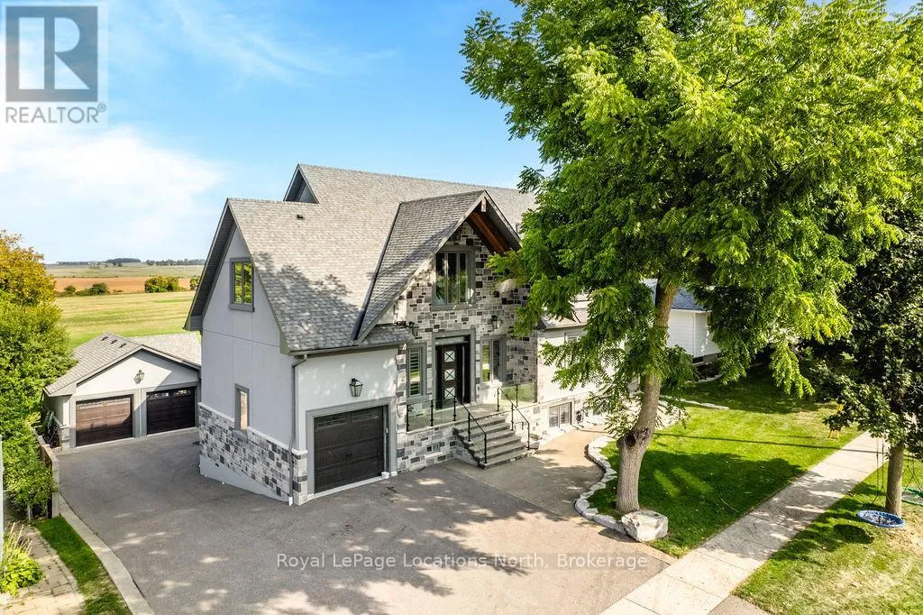 King St N/E John St or 89-Elizabeth St to East John St BACKS ONTO PROTECTED LAND. This stunning luxury home is situated on a quiet dead-end st, w/views of the countryside, + steps from park/rink/courts/library. This thoughtfully designed home offers an elegant, vibe, w/high end craftsmanship, featuring a stone + stucco exterior w/exceptional curb appeal. Upon entering, you are greeted by a grand entrance w/ heated porcelain tile floors, a custom wood staircase w/glass railing, + vaulted ceilings that create an inviting ambiance. The main level showcases engineered white oak flooring + exposed beam accents. The spacious living room offers custom-built cabinetry, a tiled feature wall with a built-in electric f/pl, + space for a TV. Adjacent is the elegant dining room, equipped w/ built-in cabinetry, dry bar, quartz counters, backsplash, +under-mount lighting perfect for entertaining. The family room flows directly from the dining room, offering a 2nd tiled wall w/ built-in electric f/pl, lg windows + seamless transition. The gourmet kitchen is classy, featuring an oversized island, quartz countertops, high-end s/s appliances, incl a gas range w/ a custom range hood + walk-in pantry. A private office w/views + a mud/laundry room w/heated tile floors, inside entry to garage w/ epoxy floors + w/up from basement. 25 ft ceilings impress, flowing into 2nd flr w/white oak flooring that continues throughout, leading to the luxurious primary suite. This retreat incl access to private balcony, a walk-through closet w/ built-in organizers, + 6PC ensuite w/ dbl sinks, soaker tub, + large glass shower. Two additional bedrooms each have their own 3PC bathrooms w/ tiled showers + heated floors. The basement offers versatility, featuring expansive rec room + walk-out French doors leading to the patio, providing in-law potential. This bright space offers luxury plank floor, full kitchen, 2 bedrooms, + a 3PC bathroom. Outside, enjoy an add. detached,heated 2-car garage w/ gas + water lines for future pool installation. (id:27476)