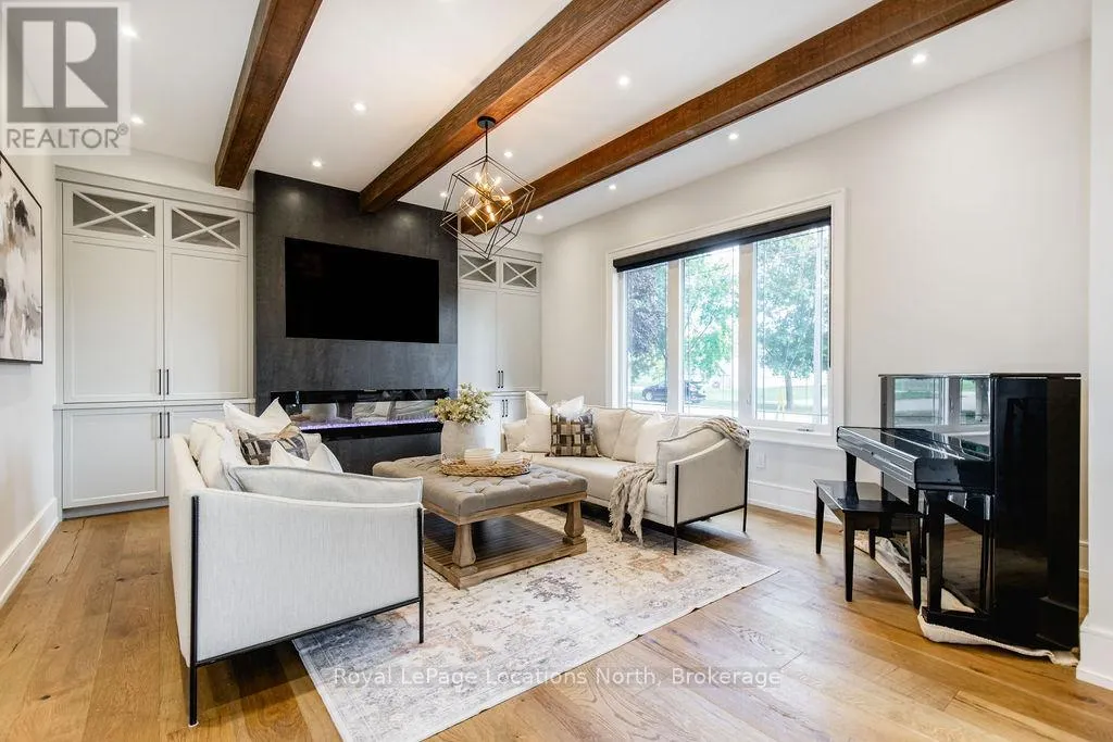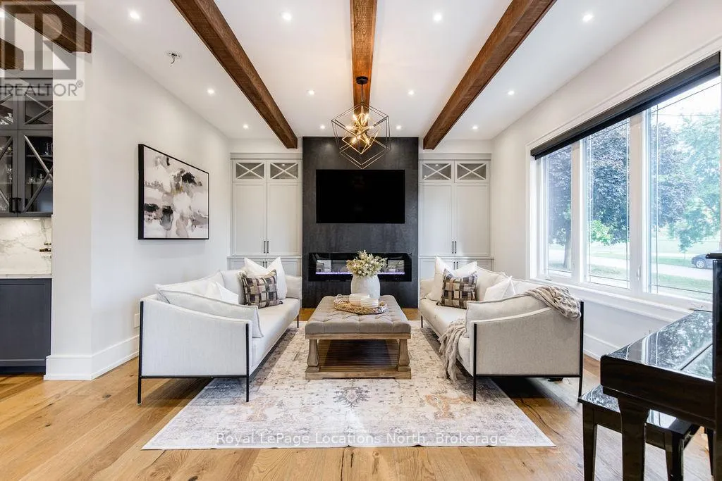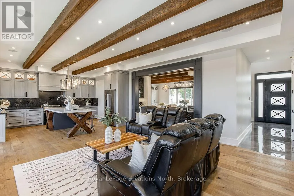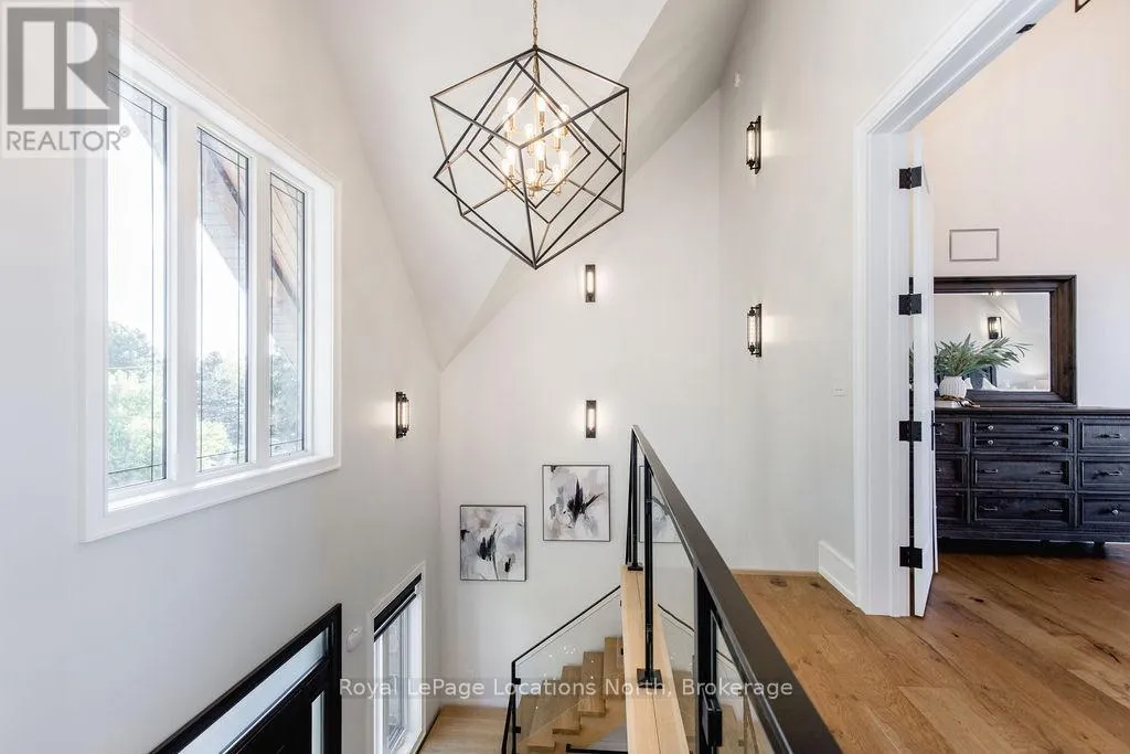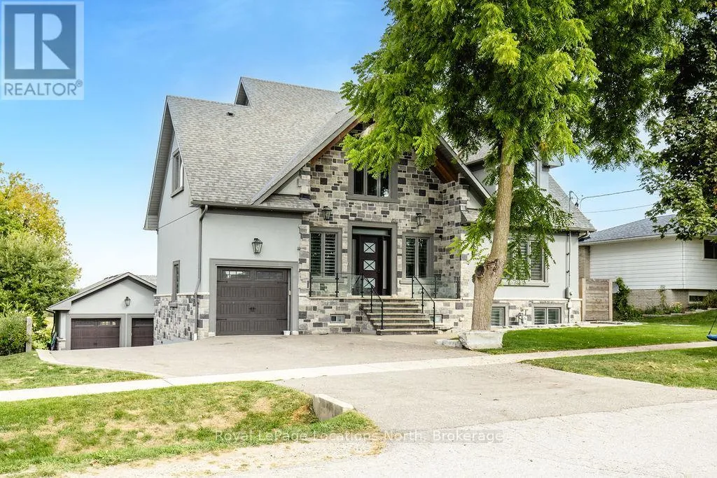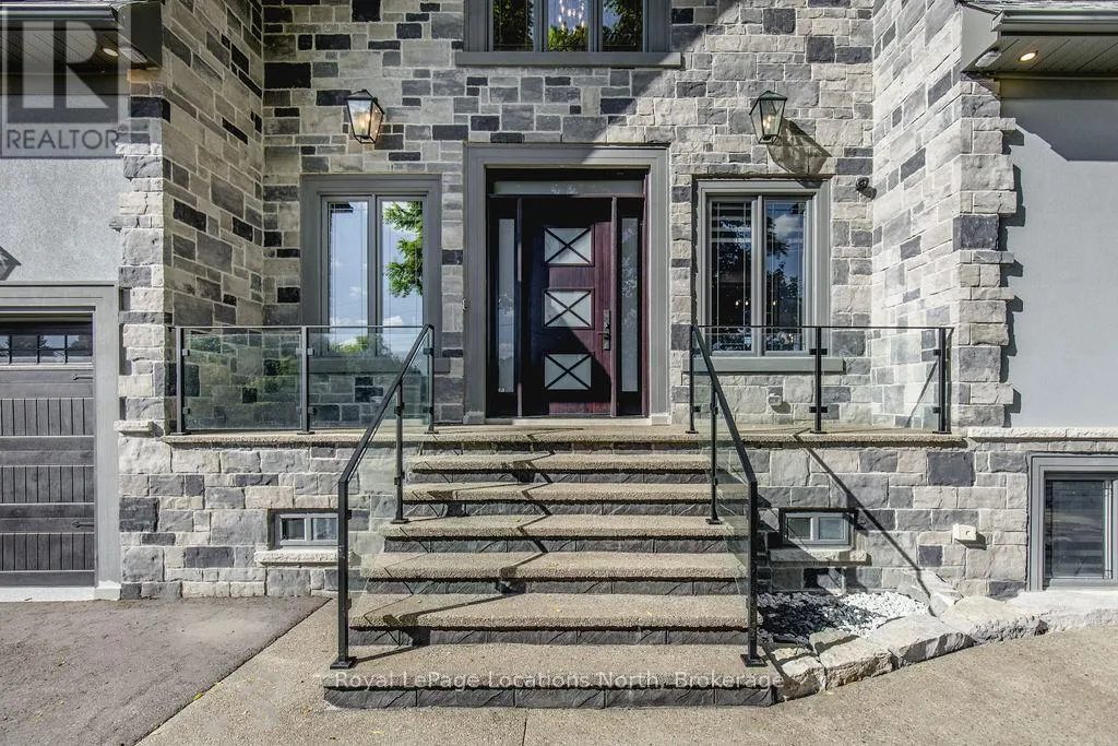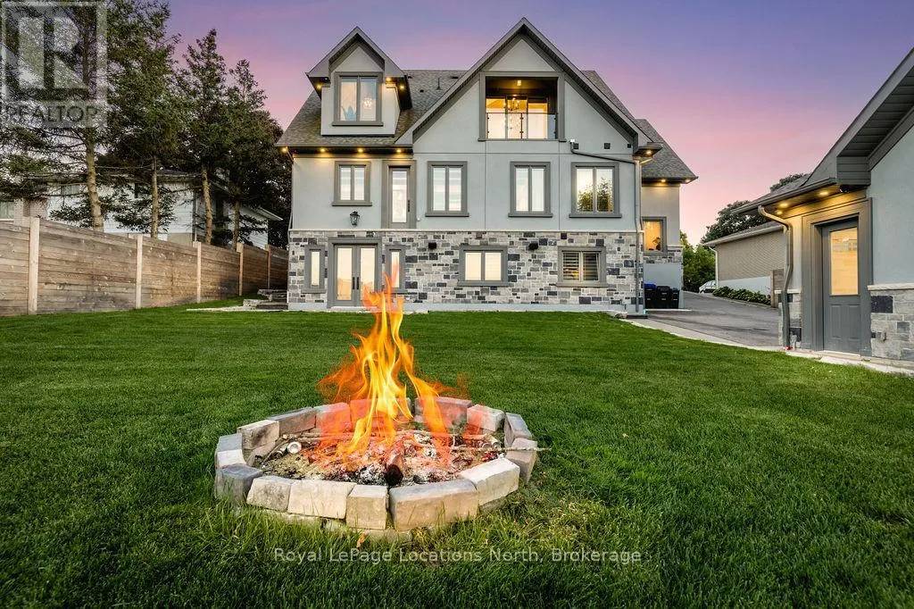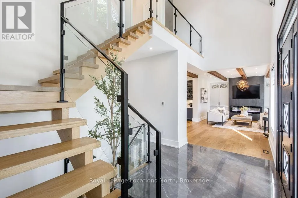 King St N/E John St or 89-Elizabeth St to East John St BACKS ONTO PROTECTED LAND. This stunning luxury home is situated on a quiet dead-end st, w/views of the countryside, + steps from park/rink/courts/library. This thoughtfully designed home offers an elegant, vibe, w/high end craftsmanship, featuring a stone + stucco exterior w/exceptional curb appeal. Upon entering, you are greeted by a grand entrance w/ heated porcelain tile floors, a custom wood staircase w/glass railing, + vaulted ceilings that create an inviting ambiance. The main level showcases engineered white oak flooring + exposed beam accents. The spacious living room offers custom-built cabinetry, a tiled feature wall with a built-in electric f/pl, + space for a TV. Adjacent is the elegant dining room, equipped w/ built-in cabinetry, dry bar, quartz counters, backsplash, +under-mount lighting perfect for entertaining. The family room flows directly from the dining room, offering a 2nd tiled wall w/ built-in electric f/pl, lg windows + seamless transition. The gourmet kitchen is classy, featuring an oversized island, quartz countertops, high-end s/s appliances, incl a gas range w/ a custom range hood + walk-in pantry. A private office w/views + a mud/laundry room w/heated tile floors, inside entry to garage w/ epoxy floors + w/up from basement. 25 ft ceilings impress, flowing into 2nd flr w/white oak flooring that continues throughout, leading to the luxurious primary suite. This retreat incl access to private balcony, a walk-through closet w/ built-in organizers, + 6PC ensuite w/ dbl sinks, soaker tub, + large glass shower. Two additional bedrooms each have their own 3PC bathrooms w/ tiled showers + heated floors. The basement offers versatility, featuring expansive rec room + walk-out French doors leading to the patio, providing in-law potential. This bright space offers luxury plank floor, full kitchen, 2 bedrooms, + a 3PC bathroom. Outside, enjoy an add. detached,heated 2-car garage w/ gas + water lines for future pool installation. (id:27476)