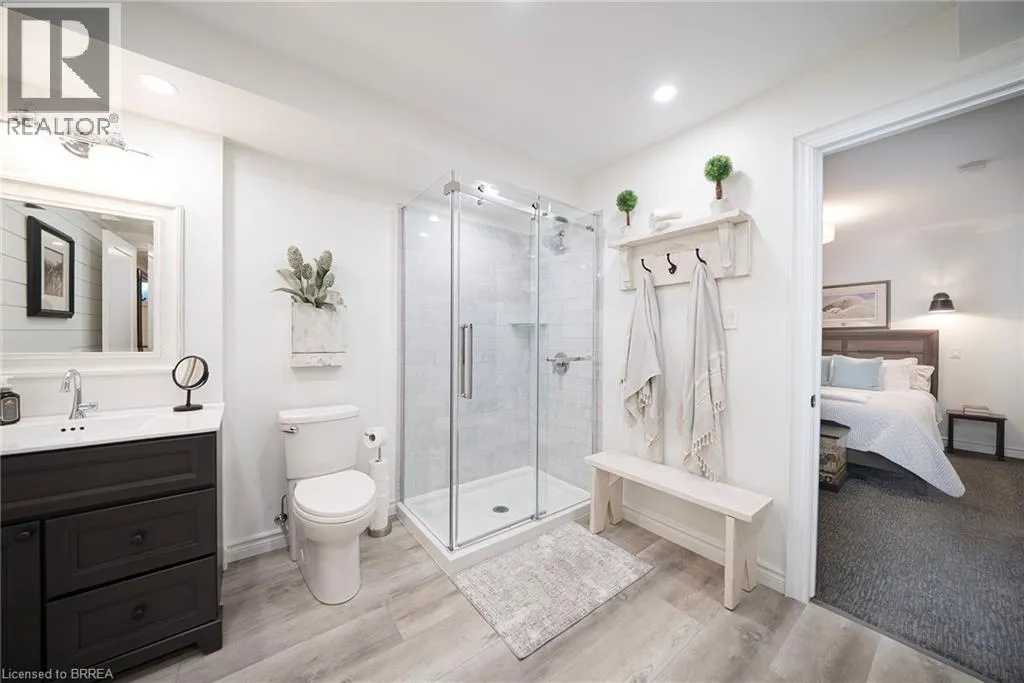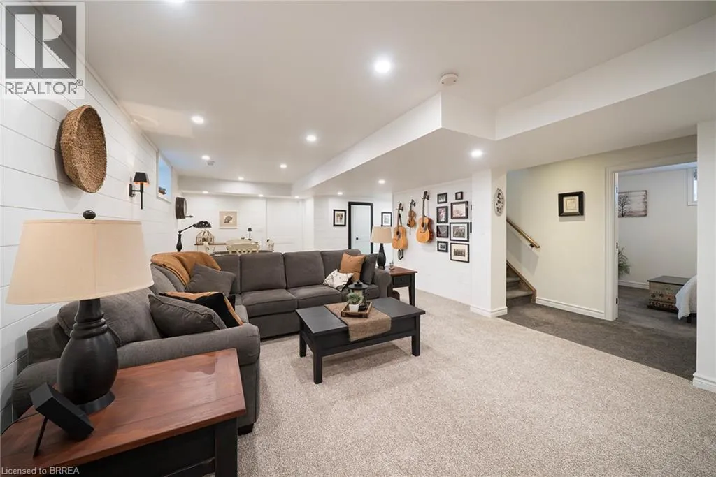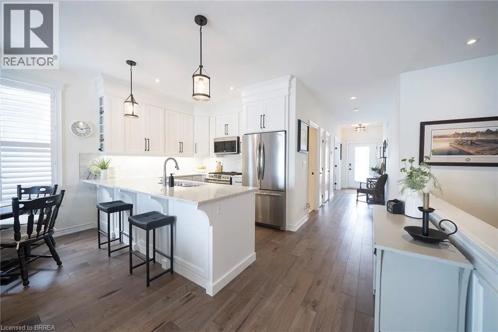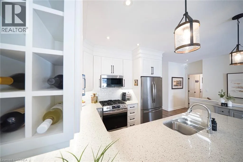 Highway 3 to Craddock Boulevard Welcome to this beautifully maintained 2+1 bedroom, 3 bathroom bungalow in the charming small town of Jarvis- voted as Canada's Kindest Community and just a short drive to the beaches and amenities of Port Dover. Nestled within a quiet, welcoming neighbourhood that still fosters a strong sense of community, this common elements condominium offers a thoughtful layout, modern finishes, and comfortable one-floor living with a fully finished basement-ideal for downsizers, professionals, or those seeking low-maintenance living. The main floor boasts engineered oak hardwood in the principal rooms, a versatile front bedroom/den with double doors, and a 4-piece guest bathroom with tiled floors and tub/shower combo. The bright kitchen offers white shaker cabinetry, quartz countertops, subway tile backsplash, peninsula, and stainless steel Frigidaire appliances. The open living/dining area includes a natural gas fireplace and patio doors that lead out to the backyard. The primary suite features a walk-in closet and a 3-piece glass shower ensuite, plus convenient main-floor laundry with garage access. The fully renovated (2022) basement provides a spacious recreation room with shiplap accent walls, sconce lighting, and an electric fireplace-ideal for relaxing or entertaining-along with a large bedroom featuring a proper egress window and generous closet, plus ensuite privilege to a stylish 3-piece bathroom with glass shower. Step outside to the covered backyard patio, a perfect space to enjoy your morning coffee, host summer dinners, or unwind in any season. Thoughtfully designed, move-in ready, and located in a welcoming community that offers small-town charm with nearby lakeside access, this home delivers comfort, style, and easy living-an excellent opportunity in Jarvis. (id:27476)