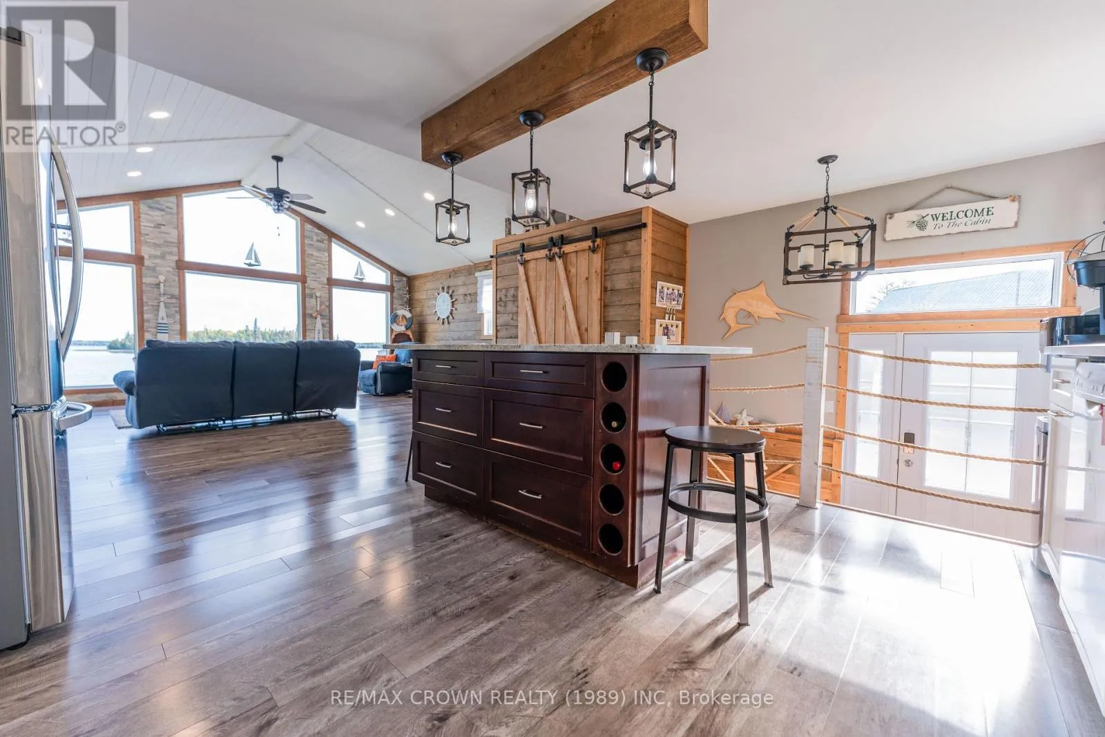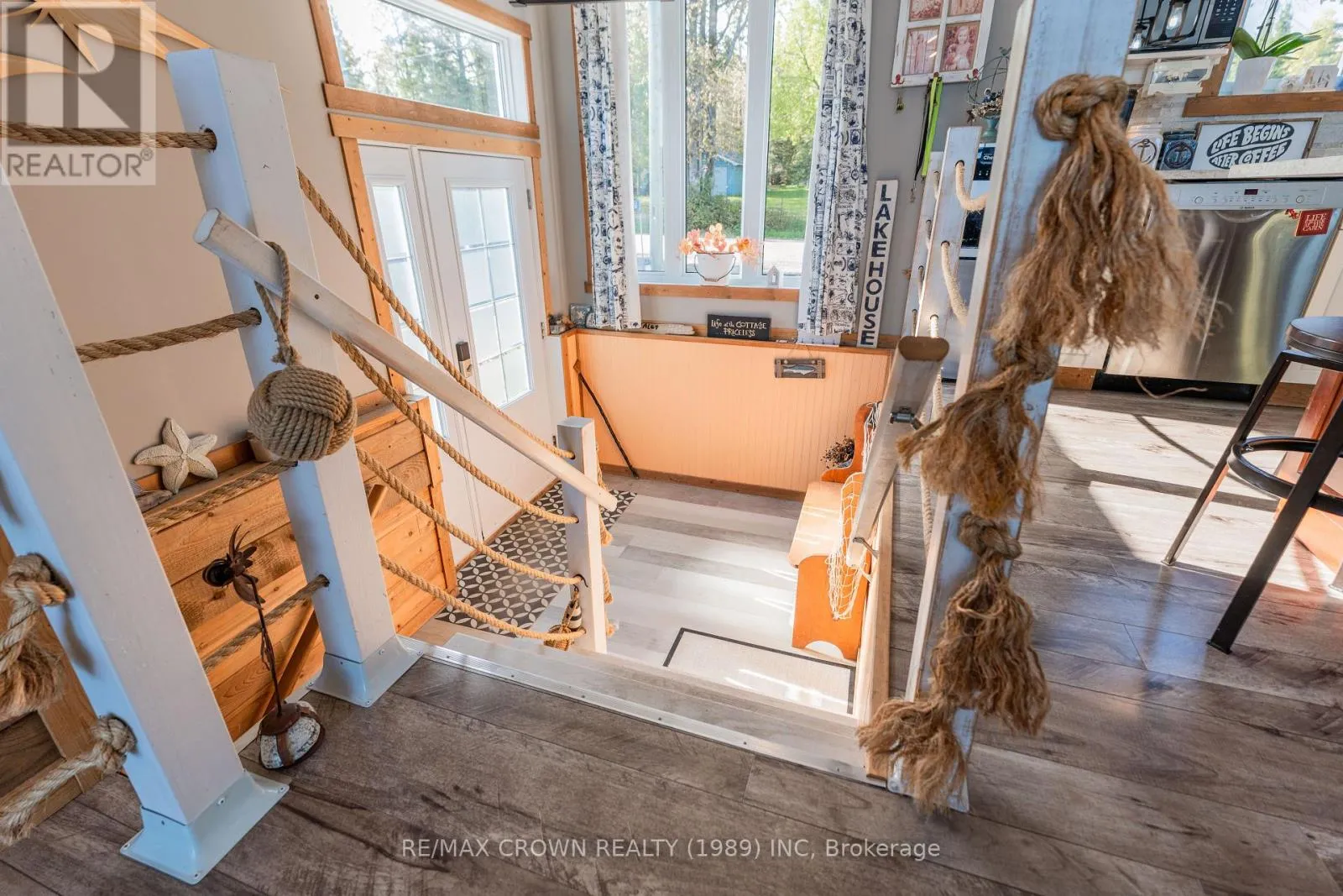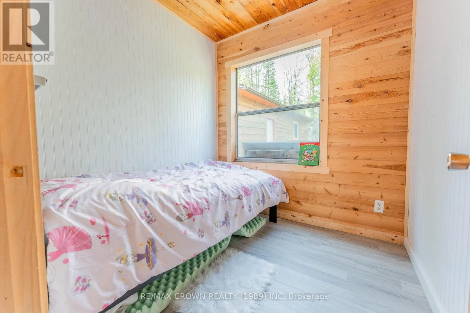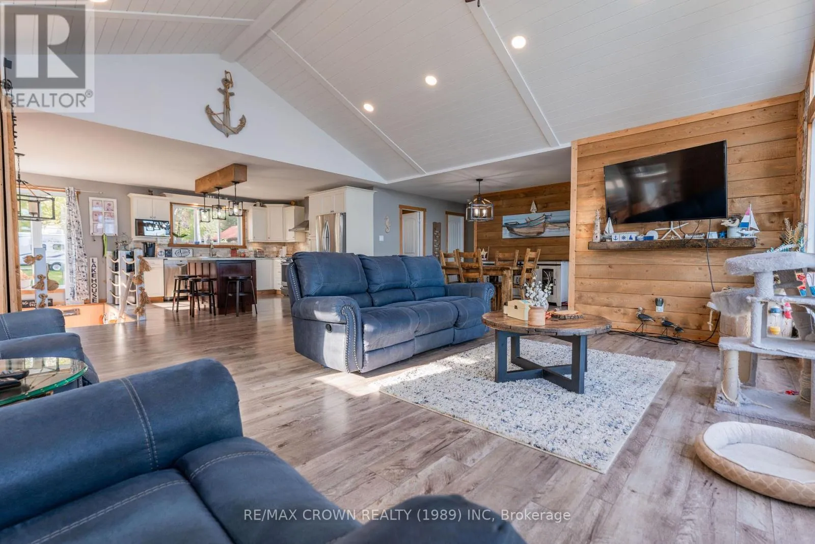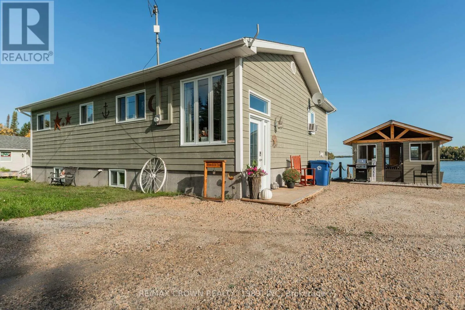 From Ouellette Bay Rd and Lefebvre Peninsula Rd Enjoy year-round waterfront living on Remi Lake with this renovated home on a rare double waterfront lot, offering views and direct lake access. A bonus lot across the road includes a guest summer cottage and a garage, creating a multi-functional property for every season.The 1,254 sq. ft. main floor offers a bright, open-concept layout with natural light and finishes. The kitchen features granite countertops, stone backsplash and an island flowing into the living and dining areas, ideal for entertaining with lake views. The living room highlights a vaulted ceiling with spruce wood finishes. Two bedrooms are located on this level, including a primary bedroom with pine wood finishes and balcony access overlooking Remi Lake, plus a second bedroom. A spacious 4-piece bathroom with cedar finishes, soaker tub and shower completes the main floor.The walk-out basement adds living space with waterfront-facing windows and direct outdoor access. It includes an open recreation room with cedar finishes and patio doors leading to a wood pathway straight to the lake. A third bedroom is roughed in, with the option to add a basement bathroom.Designed for outdoor enjoyment, this double-lot property features a gazebo and firepit area. The home was fully renovated between 2014 and 2019 and includes a newly approved septic holding tank installed in 2025.Across the road, the 24' x 32' garage provides ample storage. The 536 sq. ft. cottage offers an open-concept kitchen, dining and living area with a propane fireplace (ready to be hooked up), two bedrooms and a 3-piece bathroom. Both buildings feature metal roofs. The property includes lake water intake and a 500-gallon plastic sewage holding tank.Located in the heart of Moonbeam, this property is minutes from Bay Ouellette beach, boat launches, campgrounds, Twin Lakes Waterpark, snowmobile and ATV trails, nature trails, ski hill, 9-hole golf course, sports fields, school, grocery store, hardware store, restaurants and church. (id:27476)