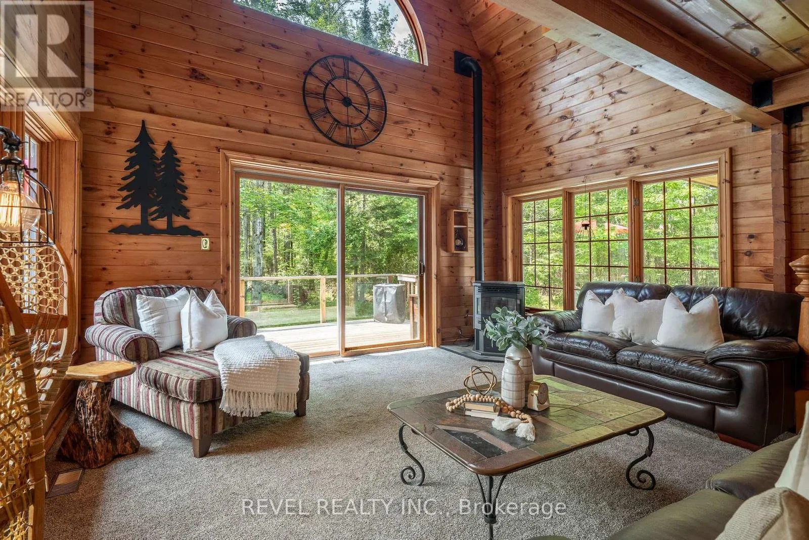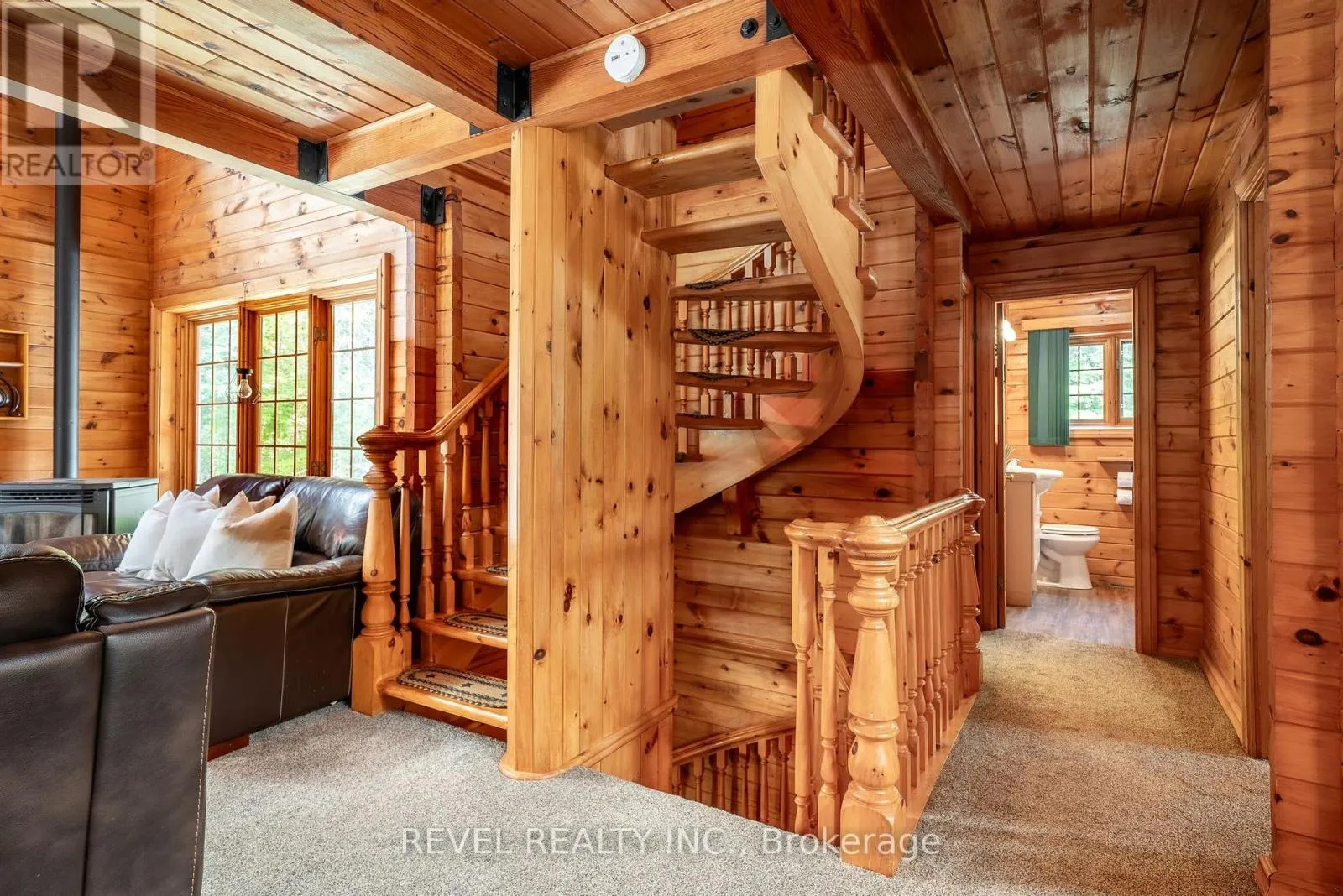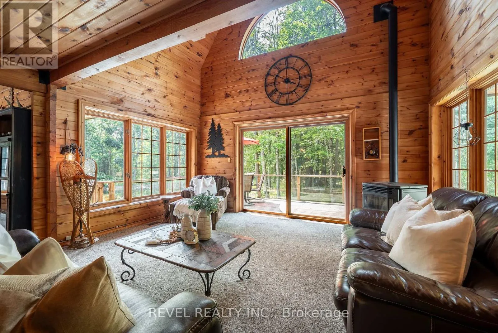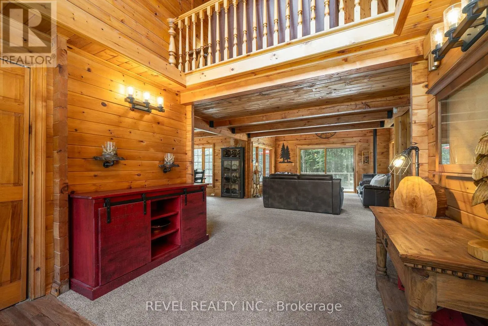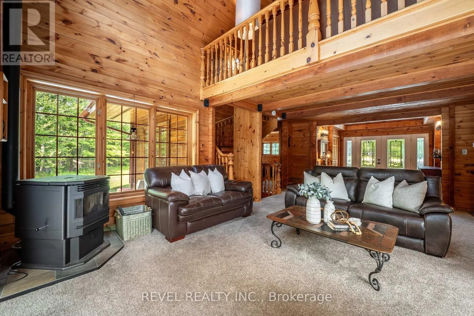 Galway/County Rd 121 Welcome to 3515 County Rd 121, this stunning 4+1 bedroom 3 bathroom log home with metal roof, offers the perfect balance of rustic charm and modern comfort. Walk in and be mesmerized by the grand foyer & living area, cathedral wood ceilings, cozy fireplace and abundant natural light from picturesque windows creating a warm and inviting atmosphere.The kitchen/dining combo is a cooking paradise, featuring newer appliances, propane stove, OTR microwave, pantry and ideal for both daily living and entertaining. Gorgeous spiral natural wood staircase leading you to the upper level of the home with additional bedrooms, full bathroom and sitting area loft. Primary Suite with walk out Juliet Deck. Lower level with full recreational room, laundry area, sauna, work out area, bathroom and walk out to yard. Perfect in law suite potential with separate entrance.Step outside to the expansive wraparound deck with breathtaking views of the pond and surrounding 1.89 acres of forest. Whether you're enjoying a quiet morning coffee watching the wildlife or hosting family and friends in the evening watching the fire flies having a bonfire, this outdoor space is sure to impress.This property has several uses, perfect as a year-round residence, seasonal retreat, multi family or income opportunity, this property offers a lifestyle of peace, beauty, and versatility. Bonus three car detached garage with hydro. Do not miss this opportunity to make this your next home. (id:27476)