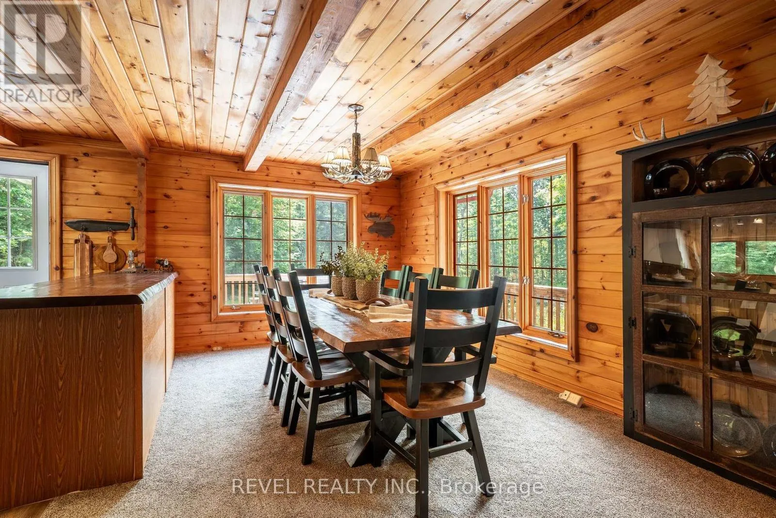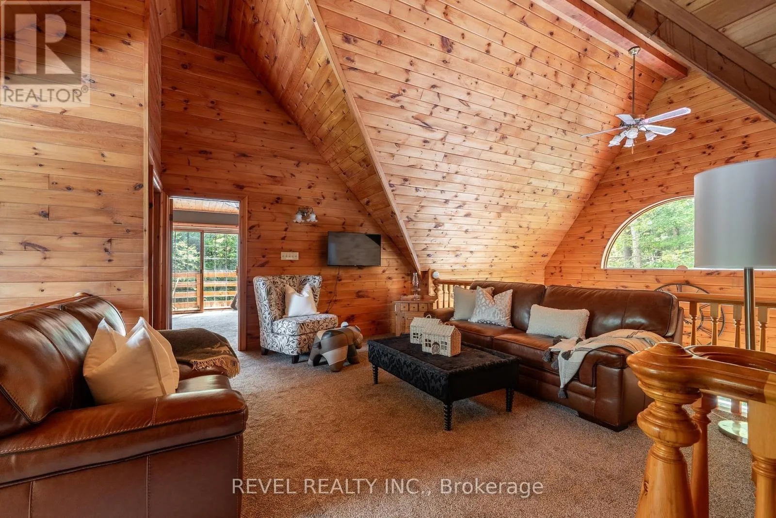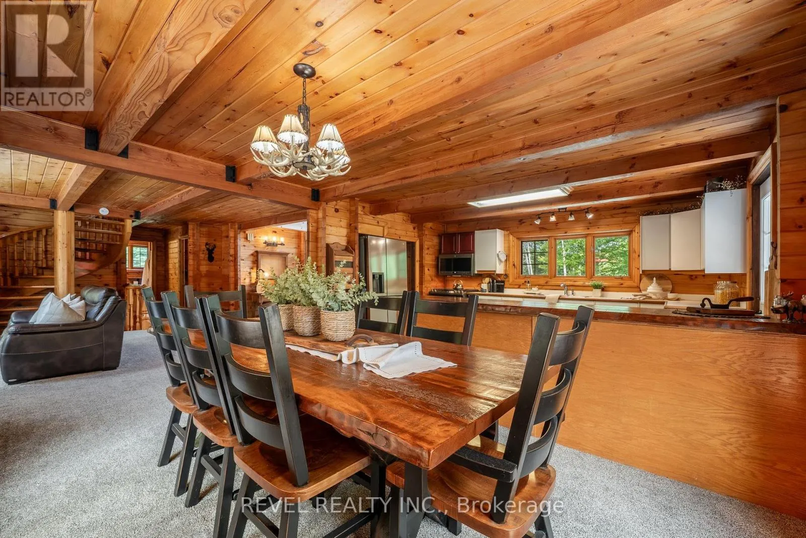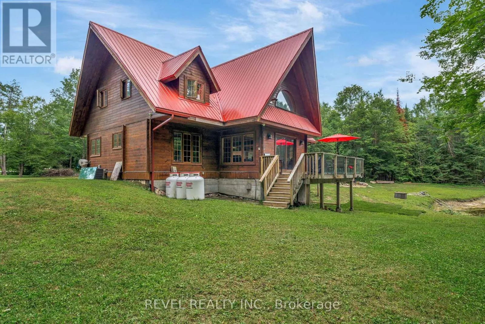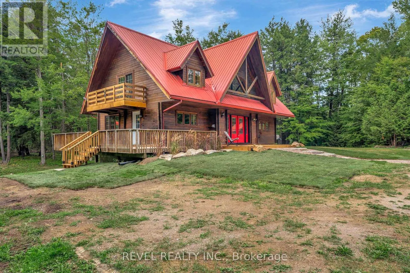 Galway/County Rd 121 Welcome to 3515 County Rd 121, this stunning 4+1 bedroom 3 bathroom log home with metal roof, offers the perfect balance of rustic charm and modern comfort. Walk in and be mesmerized by the grand foyer & living area, cathedral wood ceilings, cozy fireplace and abundant natural light from picturesque windows creating a warm and inviting atmosphere.The kitchen/dining combo is a cooking paradise, featuring newer appliances, propane stove, OTR microwave, pantry and ideal for both daily living and entertaining. Gorgeous spiral natural wood staircase leading you to the upper level of the home with additional bedrooms, full bathroom and sitting area loft. Primary Suite with walk out Juliet Deck. Lower level with full recreational room, laundry area, sauna, work out area, bathroom and walk out to yard. Perfect in law suite potential with separate entrance.Step outside to the expansive wraparound deck with breathtaking views of the pond and surrounding 1.89 acres of forest. Whether you're enjoying a quiet morning coffee watching the wildlife or hosting family and friends in the evening watching the fire flies having a bonfire, this outdoor space is sure to impress.This property has several uses, perfect as a year-round residence, seasonal retreat, multi family or income opportunity, this property offers a lifestyle of peace, beauty, and versatility. Bonus three car detached garage with hydro. Do not miss this opportunity to make this your next home. (id:27476)