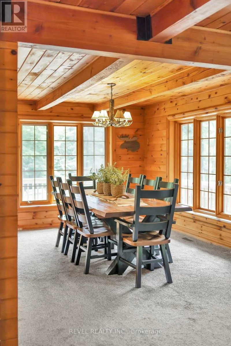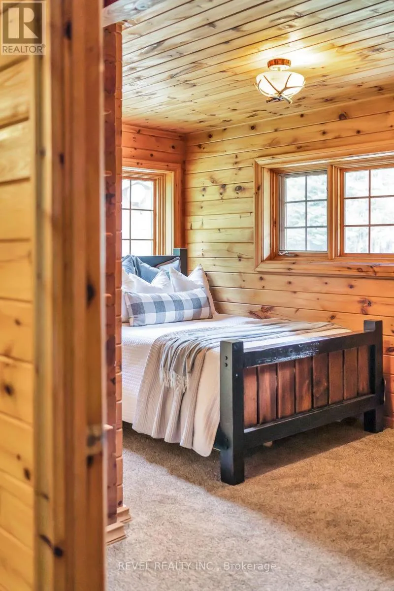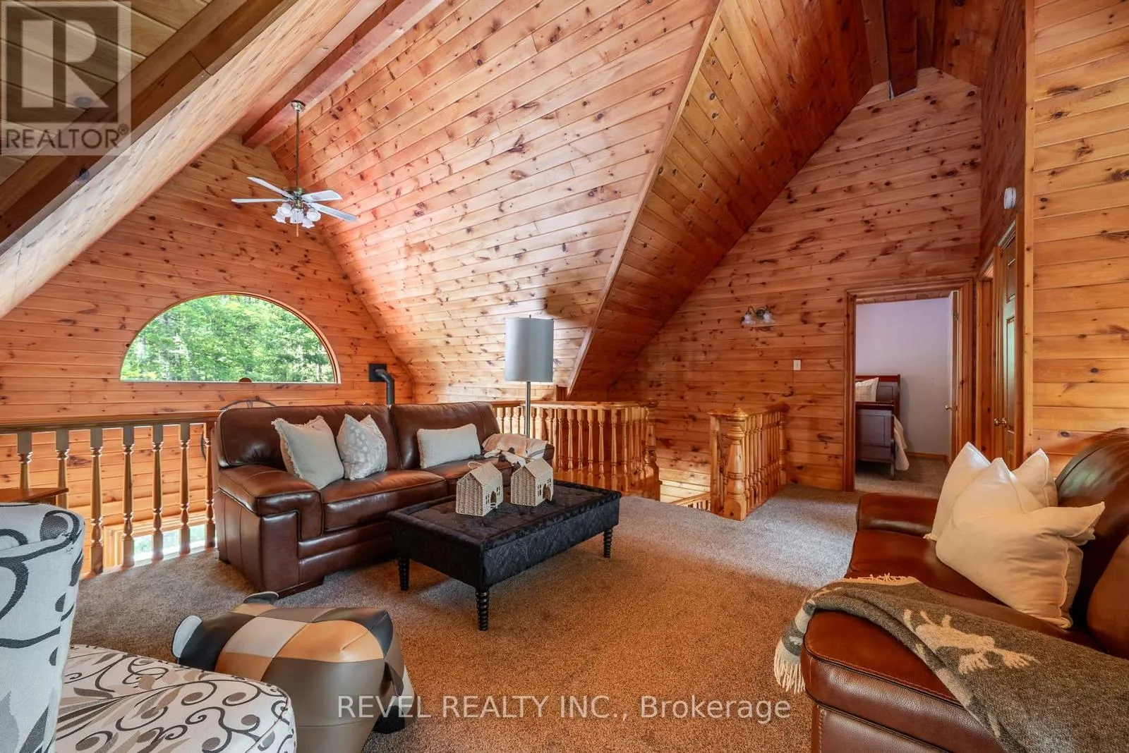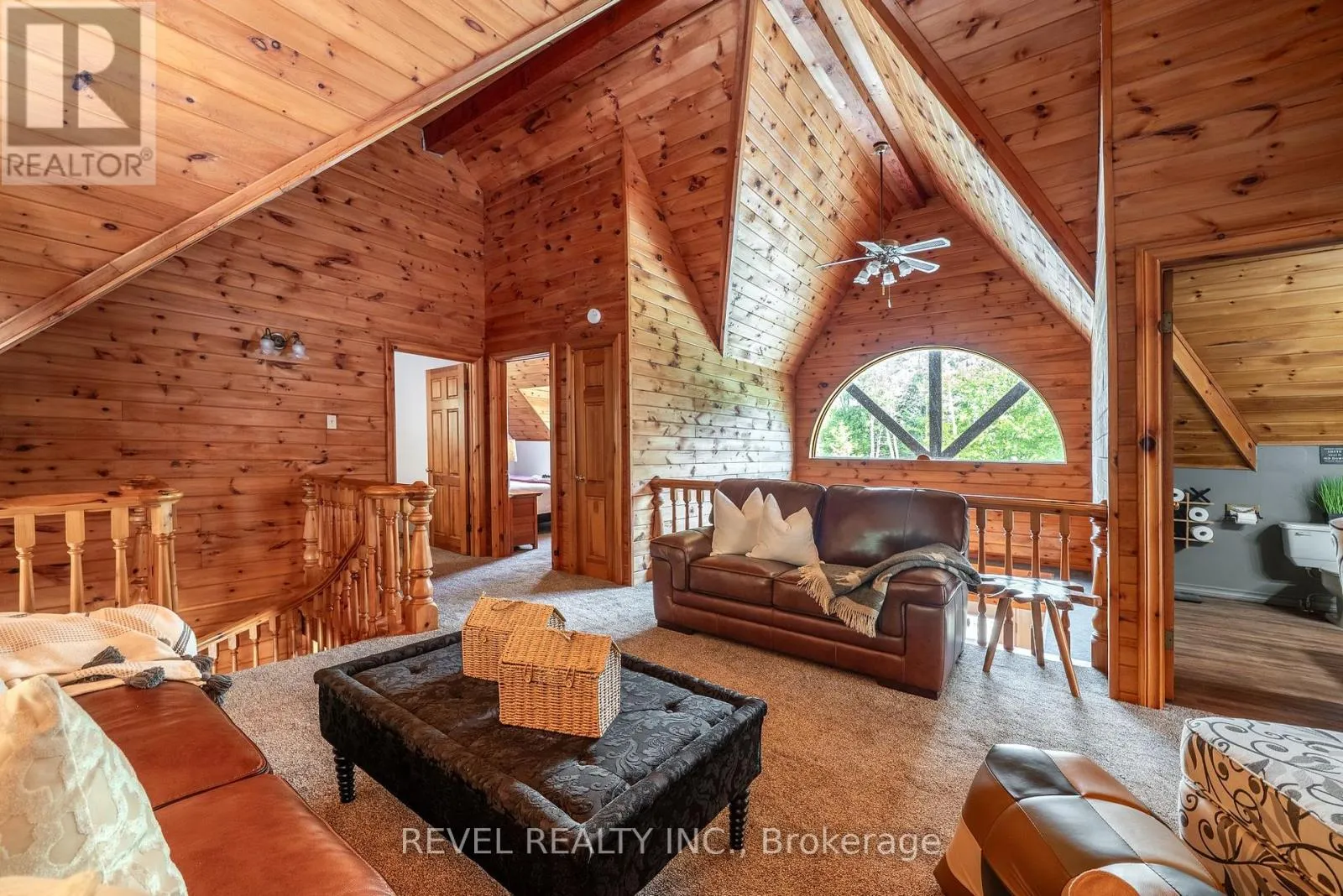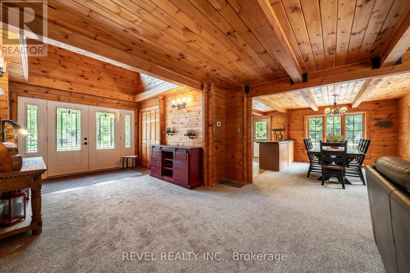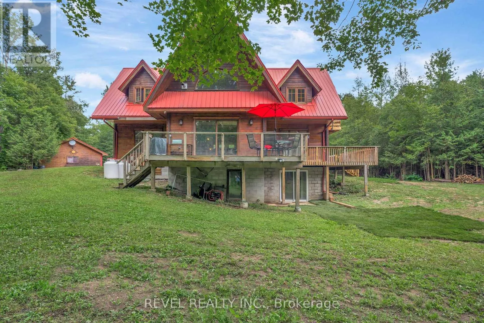 Galway/County Rd 121 Welcome to 3515 County Rd 121, this stunning 4+1 bedroom 3 bathroom log home with metal roof, offers the perfect balance of rustic charm and modern comfort. Walk in and be mesmerized by the grand foyer & living area, cathedral wood ceilings, cozy fireplace and abundant natural light from picturesque windows creating a warm and inviting atmosphere.The kitchen/dining combo is a cooking paradise, featuring newer appliances, propane stove, OTR microwave, pantry and ideal for both daily living and entertaining. Gorgeous spiral natural wood staircase leading you to the upper level of the home with additional bedrooms, full bathroom and sitting area loft. Primary Suite with walk out Juliet Deck. Lower level with full recreational room, laundry area, sauna, work out area, bathroom and walk out to yard. Perfect in law suite potential with separate entrance.Step outside to the expansive wraparound deck with breathtaking views of the pond and surrounding 1.89 acres of forest. Whether you're enjoying a quiet morning coffee watching the wildlife or hosting family and friends in the evening watching the fire flies having a bonfire, this outdoor space is sure to impress.This property has several uses, perfect as a year-round residence, seasonal retreat, multi family or income opportunity, this property offers a lifestyle of peace, beauty, and versatility. Bonus three car detached garage with hydro. Do not miss this opportunity to make this your next home. (id:27476)