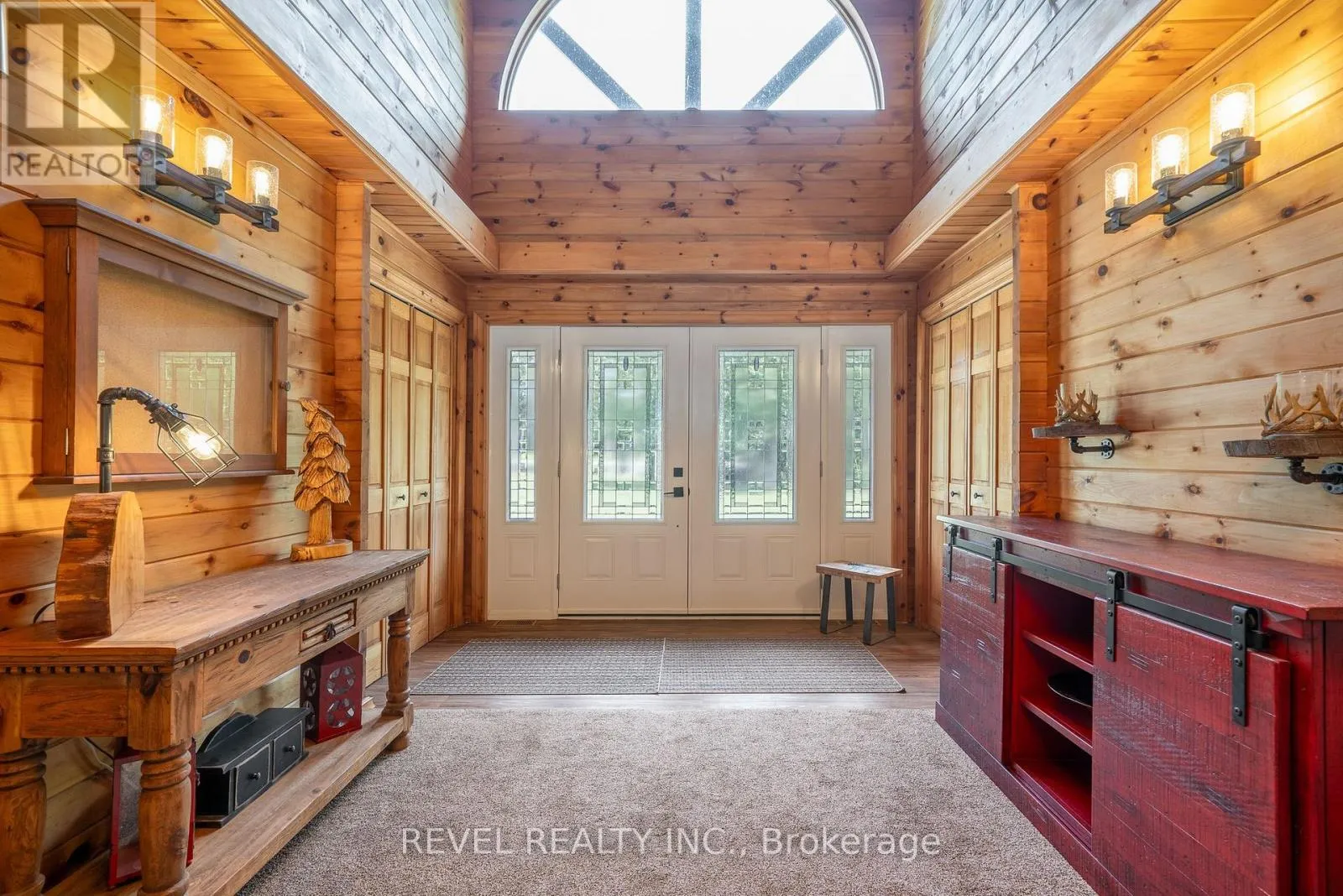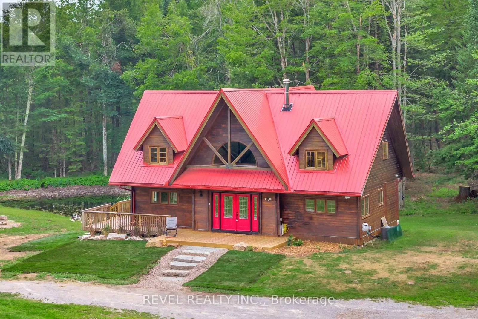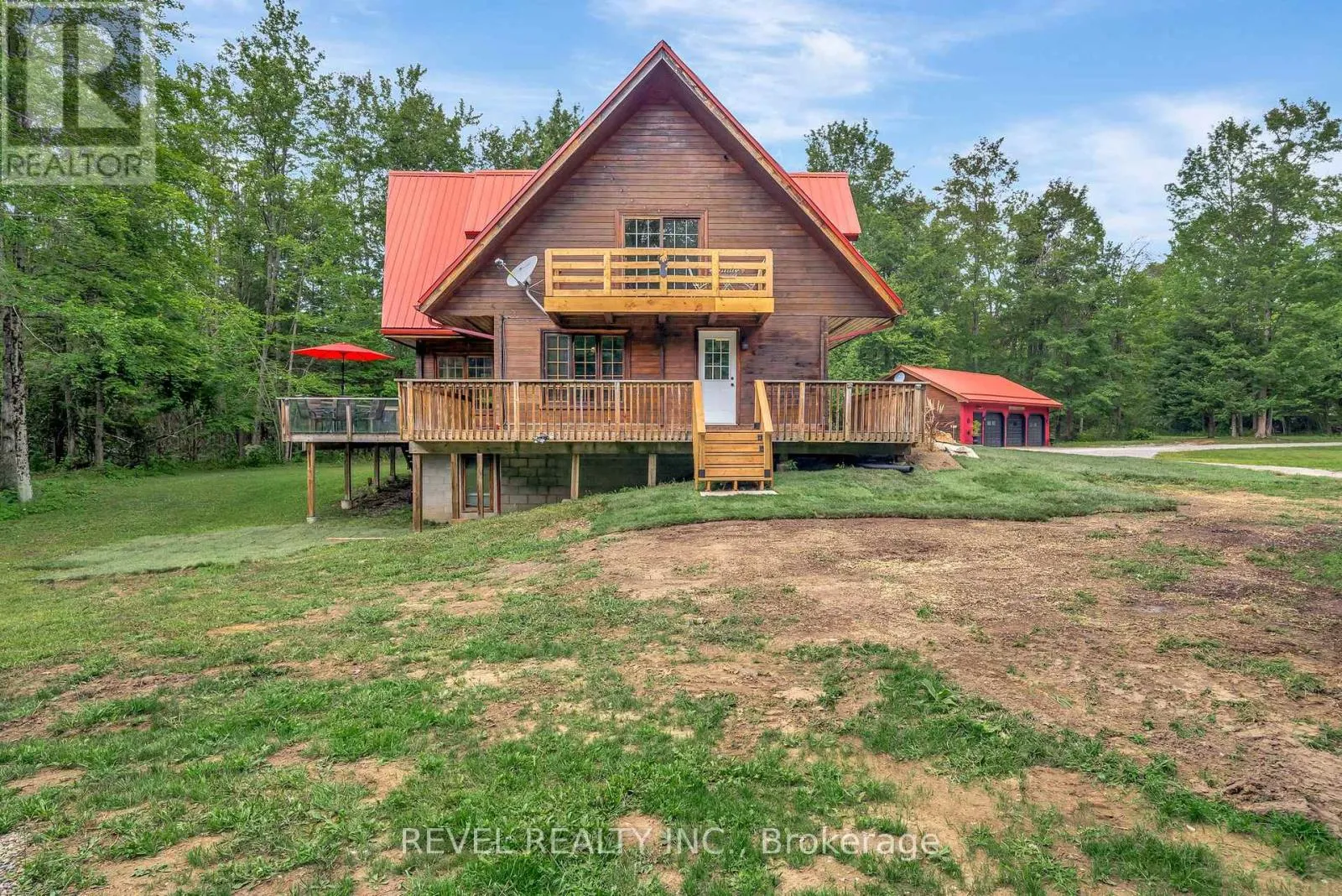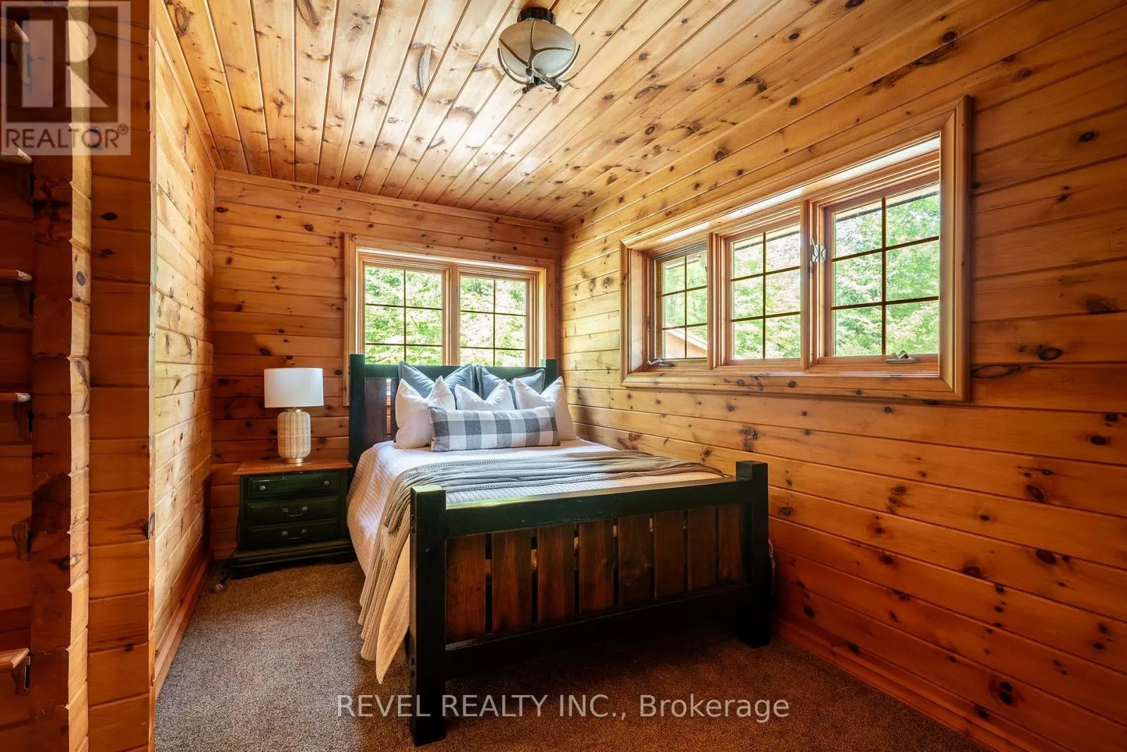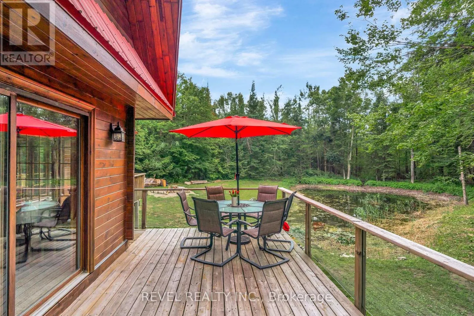 Galway/County Rd 121 Welcome to 3515 County Rd 121, this stunning 4+1 bedroom 3 bathroom log home with metal roof, offers the perfect balance of rustic charm and modern comfort. Walk in and be mesmerized by the grand foyer & living area, cathedral wood ceilings, cozy fireplace and abundant natural light from picturesque windows creating a warm and inviting atmosphere.The kitchen/dining combo is a cooking paradise, featuring newer appliances, propane stove, OTR microwave, pantry and ideal for both daily living and entertaining. Gorgeous spiral natural wood staircase leading you to the upper level of the home with additional bedrooms, full bathroom and sitting area loft. Primary Suite with walk out Juliet Deck. Lower level with full recreational room, laundry area, sauna, work out area, bathroom and walk out to yard. Perfect in law suite potential with separate entrance.Step outside to the expansive wraparound deck with breathtaking views of the pond and surrounding 1.89 acres of forest. Whether you're enjoying a quiet morning coffee watching the wildlife or hosting family and friends in the evening watching the fire flies having a bonfire, this outdoor space is sure to impress.This property has several uses, perfect as a year-round residence, seasonal retreat, multi family or income opportunity, this property offers a lifestyle of peace, beauty, and versatility. Bonus three car detached garage with hydro. Do not miss this opportunity to make this your next home. (id:27476)
