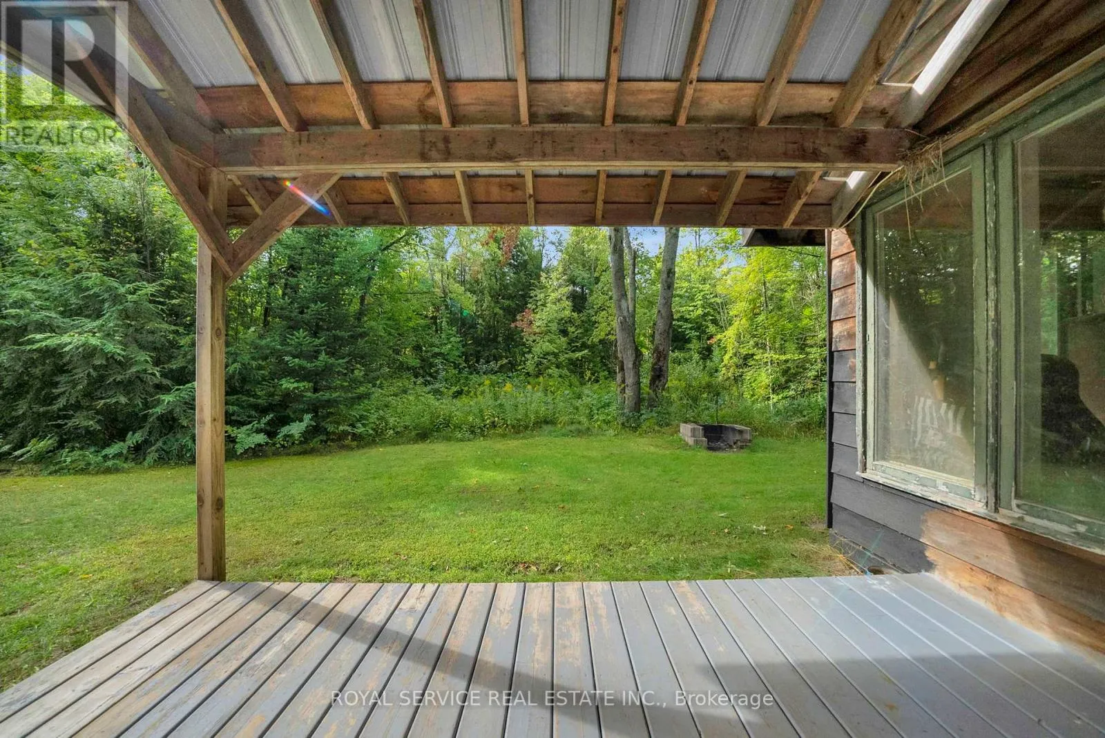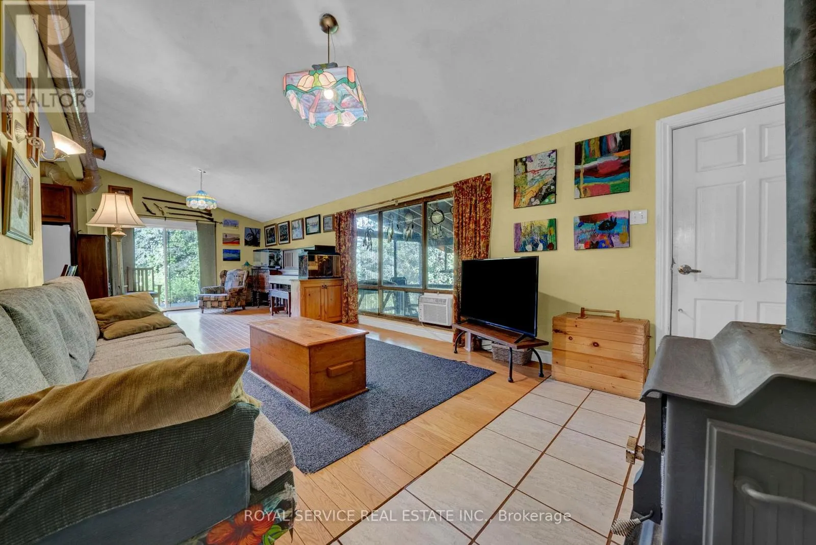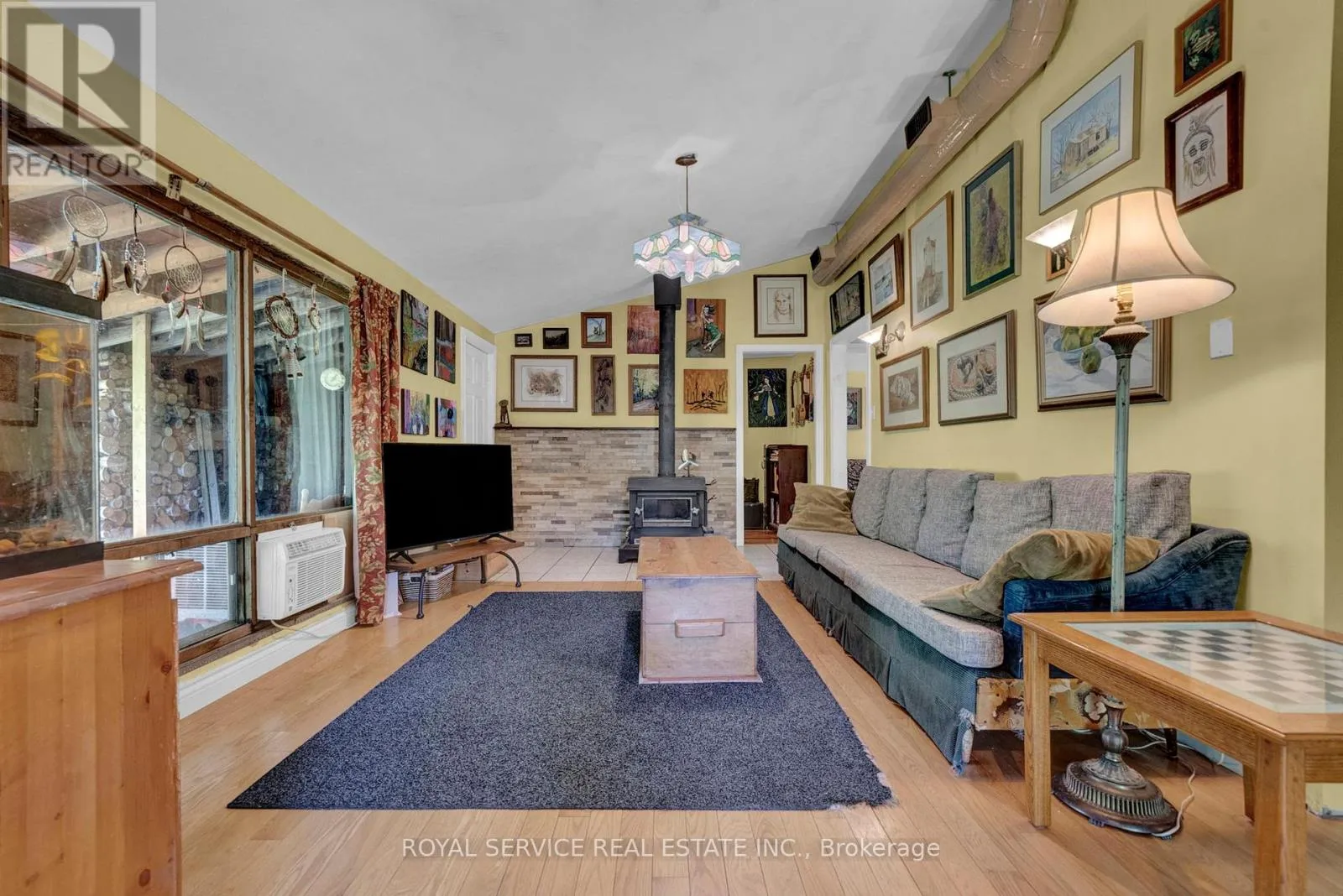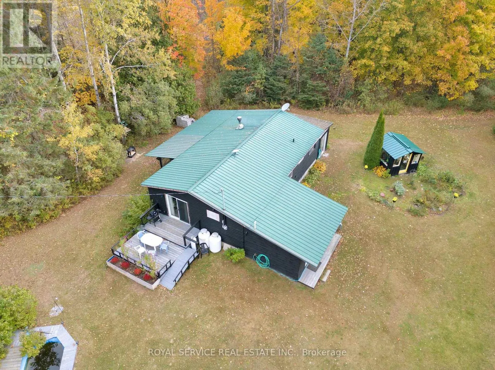 Cross Streets: Old Mill/Pigeon Creek Rd. ** Directions: Take Fleetwood Rd Off of 35. Go East till you reach OldMill. Go North to PIgeon Creek Rd and Go East 2 properties. Are you looking for a versatile and charming artists' retreat? This private 6+ Acres home includes a workshop/studio/stage, large cleared area, fish pond, greenhouse, sauna, carport and offers an incredible amount of potential and livability. The open concept home offers a large open kitchen/dining/living room area with wood stove that provides ample heat. The grounds include a mix of hardwood trees, multiple, large cleared areas, supreme privacy, a small studio, a greenhouse, a front and back porch and deck, a bird viewing are, as well as a sauna attached to the home. The workshop could function as both wood-working place or sewing/artists studio or perhaps converted into a granny flat. The home has 3 bedrooms and a 3pc washroom. A The property has gorgeous colours in the fall and has several charming places for exploring the hardwoods. It is a wonderful property for holding large functions. With some added renovations to the home this property could be exceptional. (id:27476)