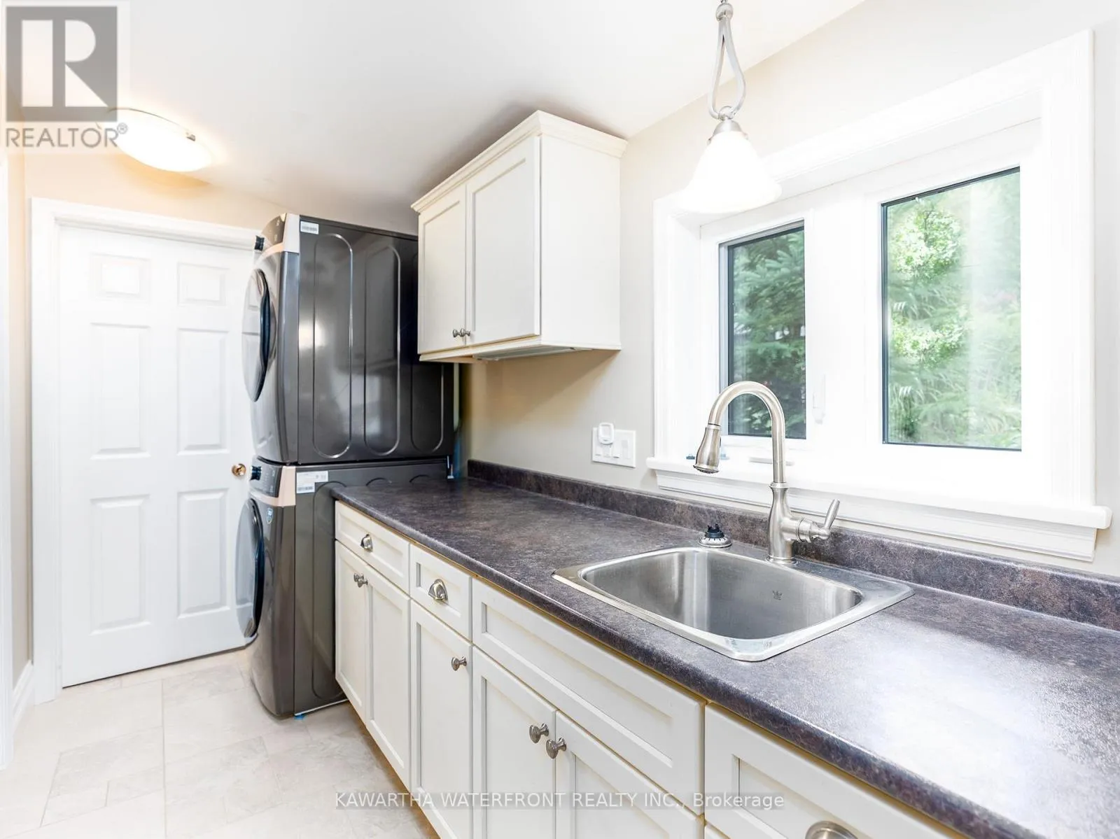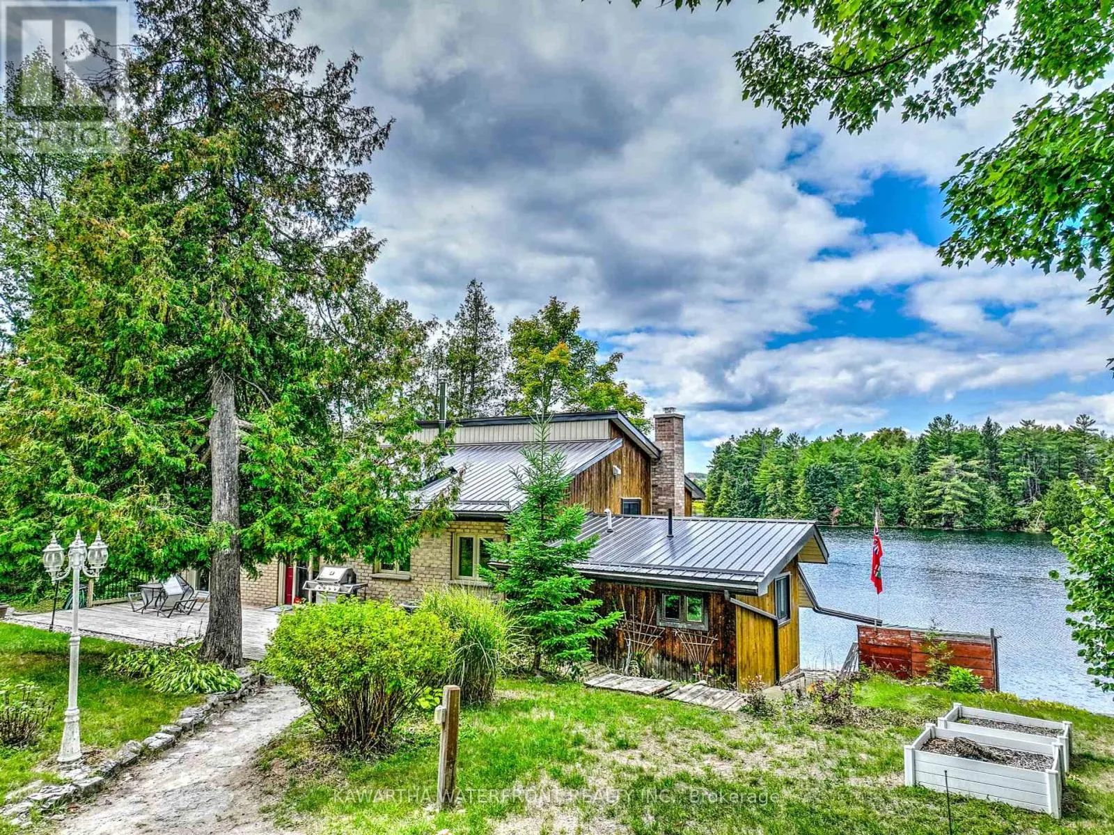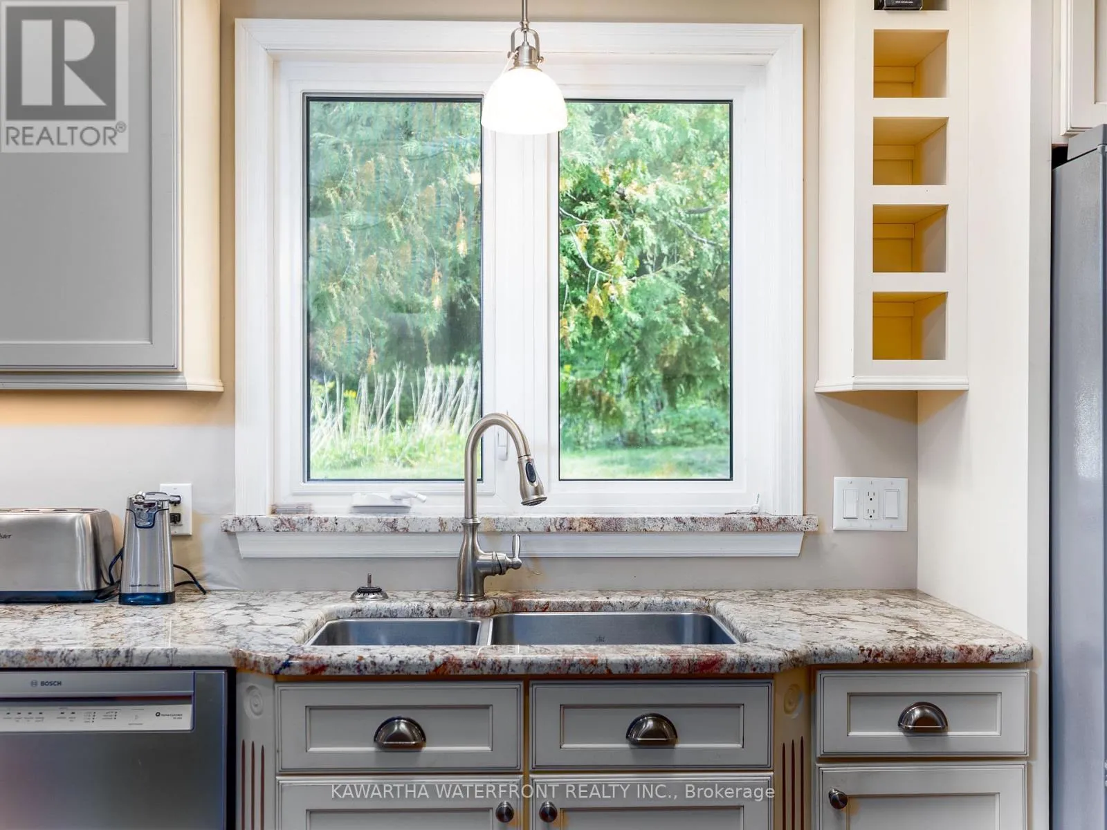 Cross Streets: Hwy 35 and County Road 42 (Baseline Road). ** Directions: Hwy 35 to County Road 42 (Baseline Road) to Shadow Lake Road 40. This is a unique property with many attractive features that is ideal for those looking for an updated and comfortable waterfront home or weekend getaway with plenty of space for family and guests. The property consists of two separately deeded lots on just under two acres on a lake-like widening of the Gull River just before it passes through Coboconk. The property provides 228 feet of west-facing, dive-off-the-dock waterfront, exceptional privacy, boat access to the Shadow Lake System, and easy access via a municipal road to town shopping and services a short distance away. The home has four bedrooms, three bathrooms and over 2,500 sq ft of living area on two levels, highlighted by a spectacular kitchen on the main level and a lower level living room with floor-to-ceiling windows that takes full advantage of the home's location close to the waterfront to provide stunning vistas across the water. Other highlights include a large laundry room and pantry off the kitchen, an updated 5 pc bathroom, a spacious back yard patio, and lovely waterside stonework. New appliances (washer/dryer/dishwasher/microwave) have recently been installed. The newer (2014) garage is large, high-ceilinged and has an insulated workshop. Most furniture, including a few pieces in the garage, is included in the sale. (id:27476)