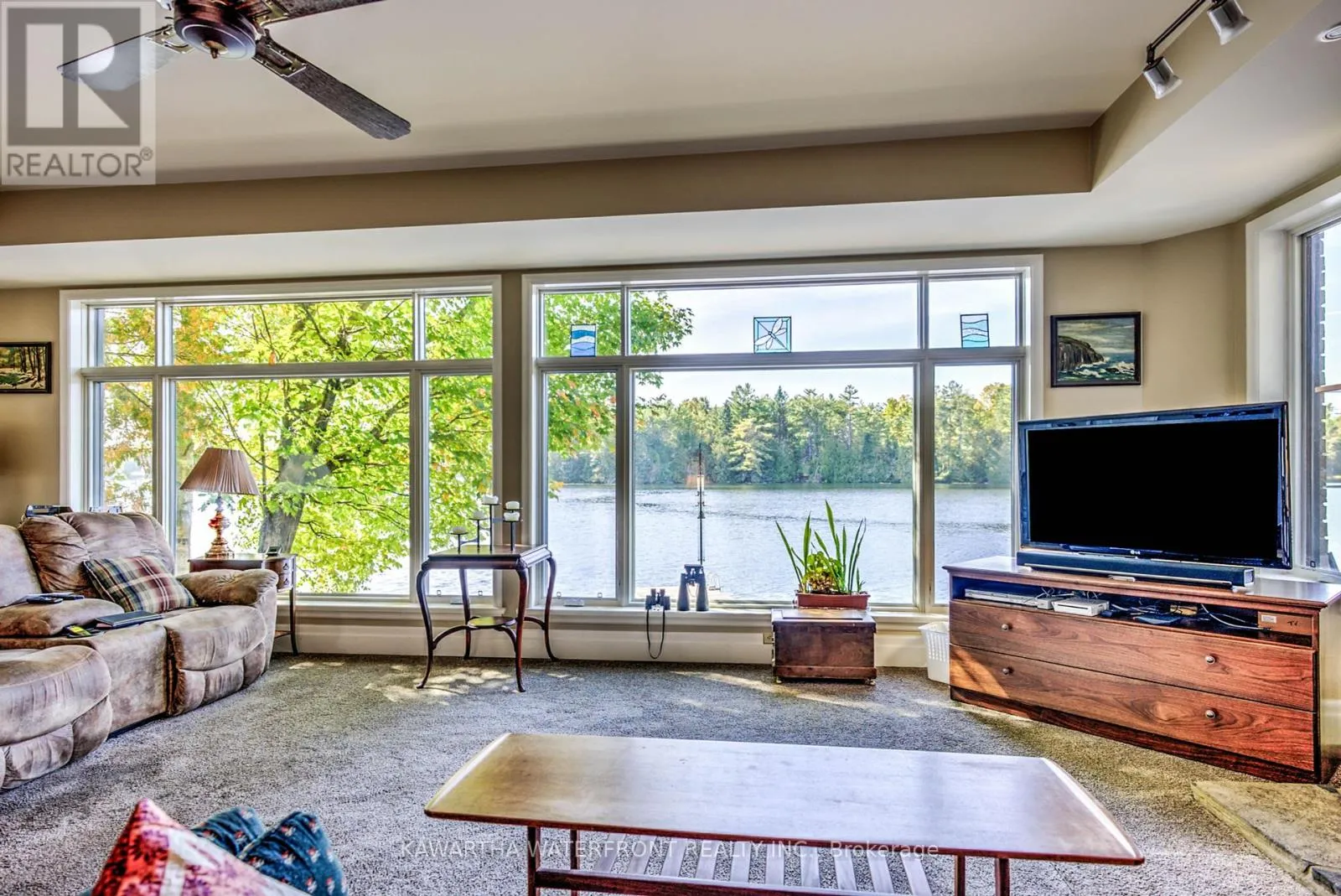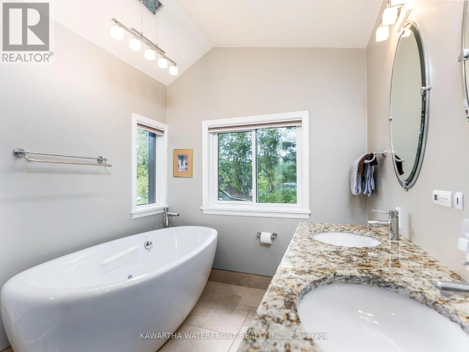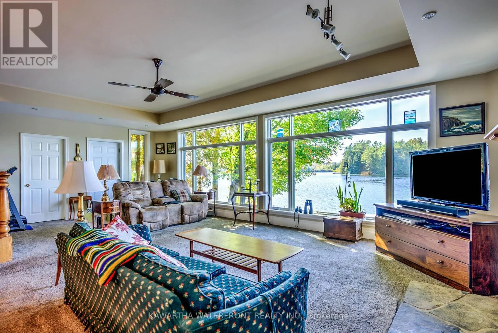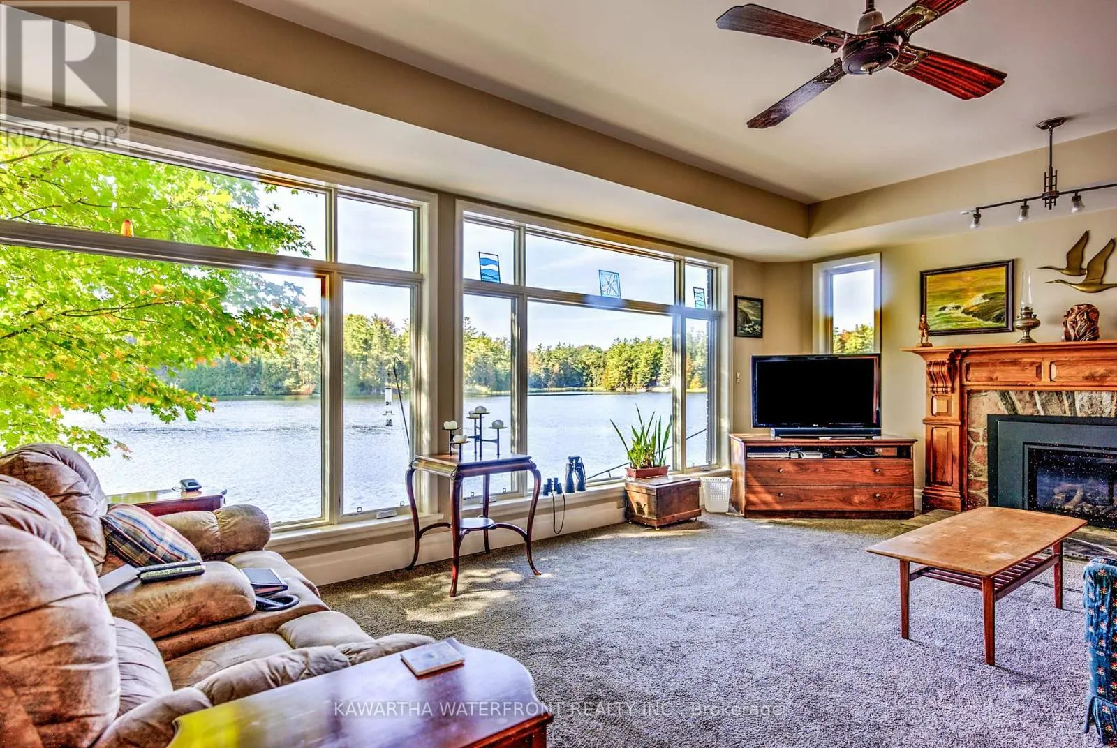 Cross Streets: Hwy 35 and County Road 42 (Baseline Road). ** Directions: Hwy 35 to County Road 42 (Baseline Road) to Shadow Lake Road 40. This is a unique property with many attractive features that is ideal for those looking for an updated and comfortable waterfront home or weekend getaway with plenty of space for family and guests. The property consists of two separately deeded lots on just under two acres on a lake-like widening of the Gull River just before it passes through Coboconk. The property provides 228 feet of west-facing, dive-off-the-dock waterfront, exceptional privacy, boat access to the Shadow Lake System, and easy access via a municipal road to town shopping and services a short distance away. The home has four bedrooms, three bathrooms and over 2,500 sq ft of living area on two levels, highlighted by a spectacular kitchen on the main level and a lower level living room with floor-to-ceiling windows that takes full advantage of the home's location close to the waterfront to provide stunning vistas across the water. Other highlights include a large laundry room and pantry off the kitchen, an updated 5 pc bathroom, a spacious back yard patio, and lovely waterside stonework. New appliances (washer/dryer/dishwasher/microwave) have recently been installed. The newer (2014) garage is large, high-ceilinged and has an insulated workshop. Most furniture, including a few pieces in the garage, is included in the sale. (id:27476)