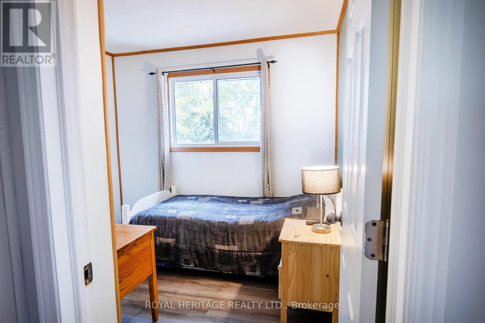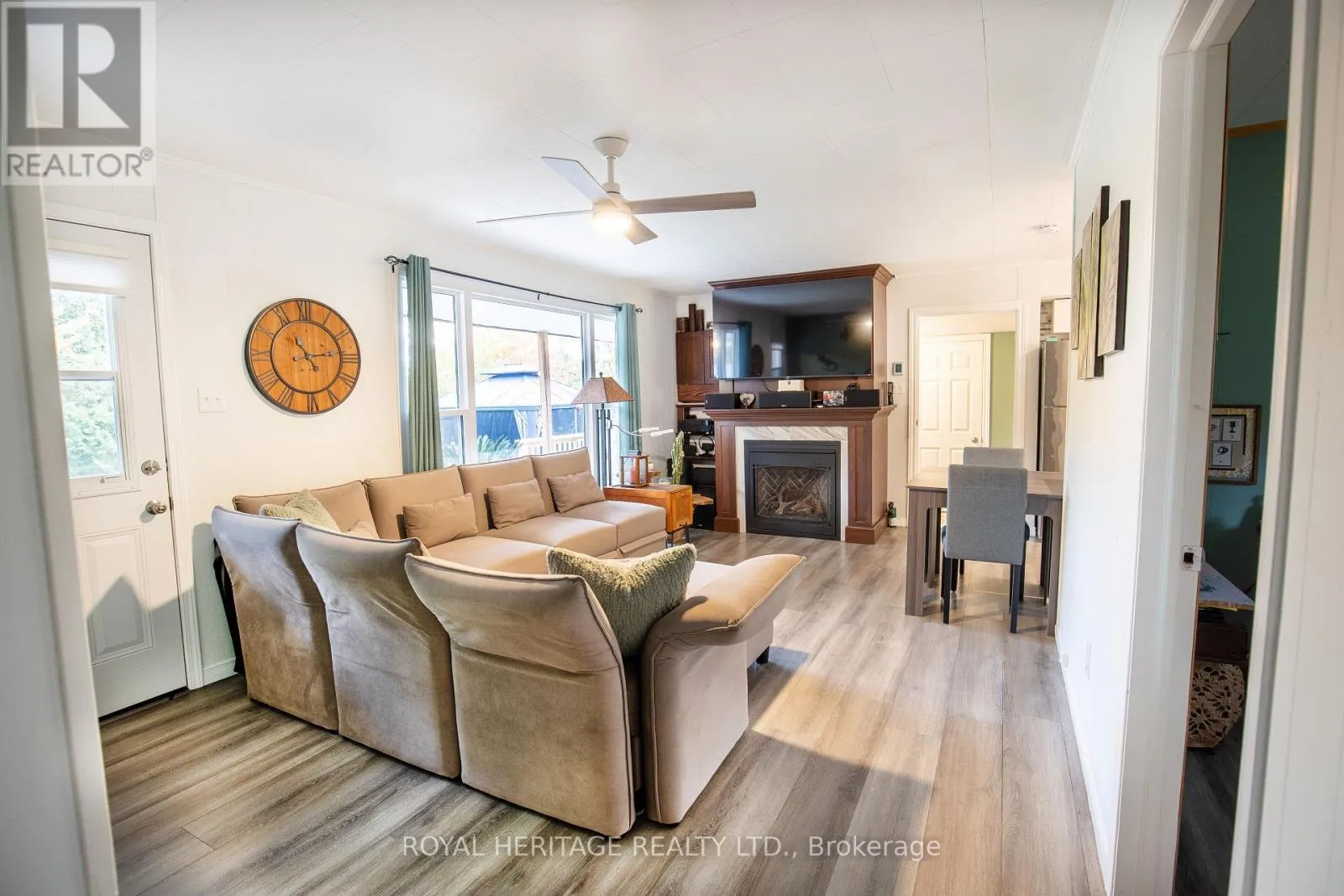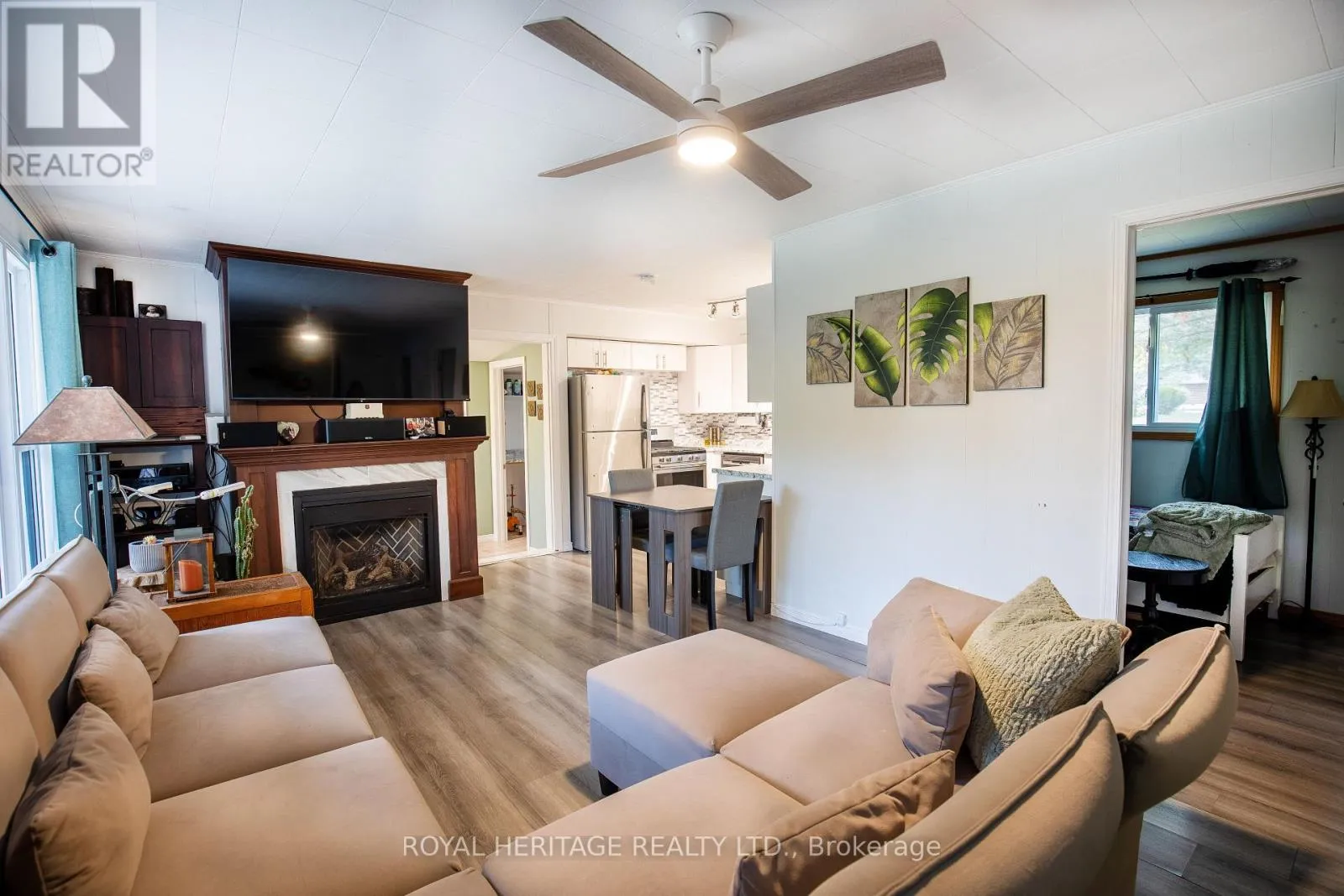 Cross Streets: 35 & King's Wharf. ** Directions: King's Wharf Road to Crosby. Nestled on the quaint waterfront community of Lakeview Estates, you'll find this super cozy, low-maintenance 3-bedroom home. Nothing to do but Unpack, perfect for those looking to start their home ownership journey or those needing to downsize. Located on the west shore of Pigeon Lake & close to Bobcaygeon, this 4-season home is perfect. Within walking distance to the community park with water access, playground, boat launch and boat docking. Spend your days lakeside. Bright living room with propane fireplace, newer kitchen, 3 bedrooms and full bath. Newer steel roof, vinyl siding, fascia & soffit & windows. Updated electrical panel & Plumbing in September 2024. Beautifully treed, private lot with road access from the rear as well. The association fee is only $70 per year! (id:27476)