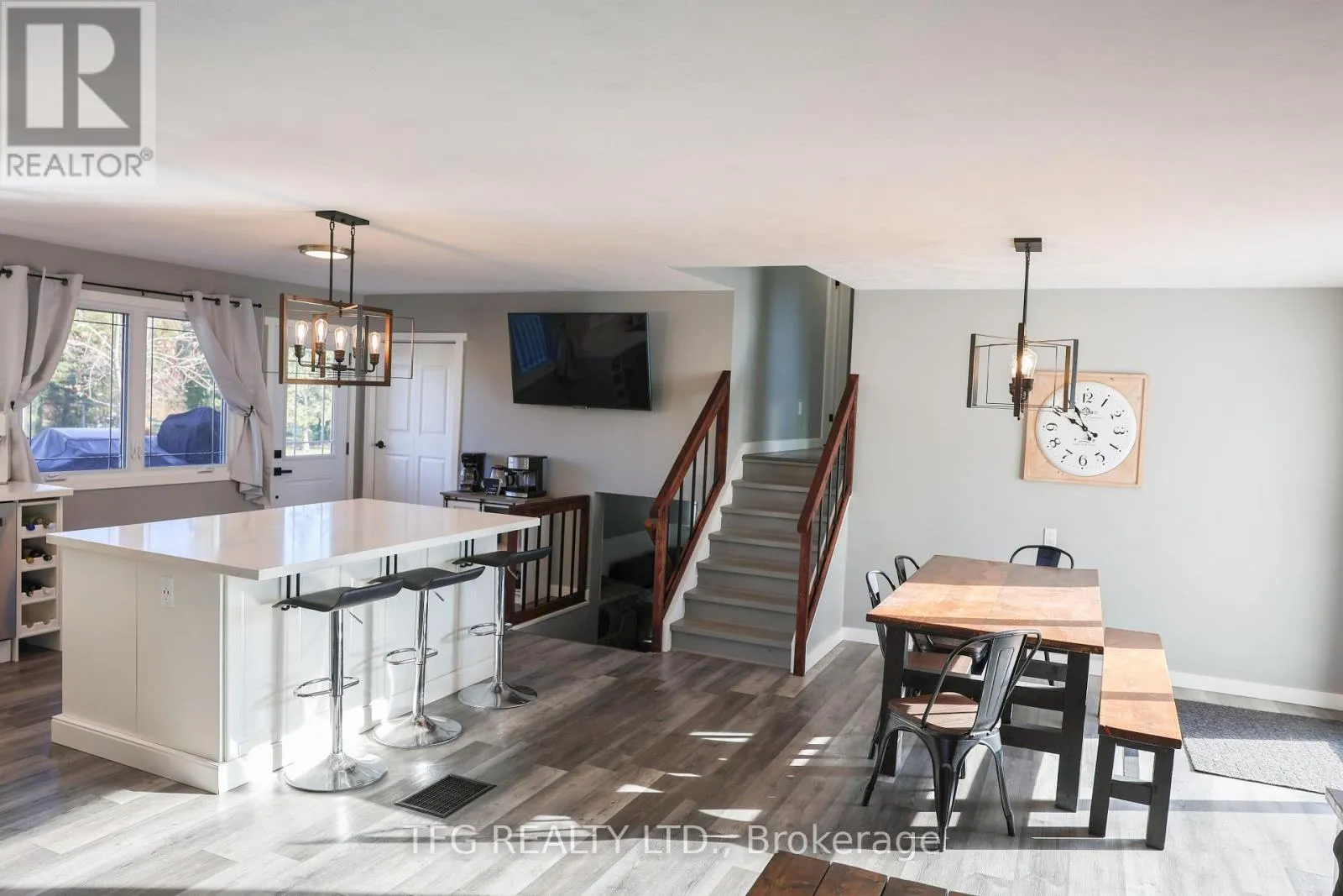 Cross Streets: Mary St & Queen St. ** Directions: South Of Mary St. Set Back on a beautiful spot of town, with school bus pickup just steps from the driveway, this nicely updated 3-bedroom, 2-bathroom backsplit offers the perfect blend of modern comfort, thoughtful upgrades, and peaceful country living. Resting on a nearly 1-acre (0.96 acre)landscaped lot, this property showcases a massive circular driveway, mature trees, and an incredible outdoor space featuring an above-ground pool, hot tub, and patio area ideal for entertaining or relaxing year-round. The main floor boasts a bright, open-concept layout with new modern vinyl plank flooring throughout, a fully updated kitchen complete with gas stove, custom island with built-in minifridge, stainless steel appliances, and walkouts to both the backyard oasis and side deck with a gas BBQ hookup. Upstairs, you'll find three freshly painted bedrooms, each with closets, and an updated 3-piecebathroom featuring a new vanity. The lower level offers a cozy yet functional rec room with a wood-burning fireplace, large windows providing ample natural light, continued vinyl plank flooring, and direct access to the garage, laundry room and a 3-piece bathroom. The garage is a standout feature-heated with its own furnace, offering direct access to both the backyard and basement. Whether you need a workshop, extra storage, or are considering finishing the space further, this area offers amazing flexibility and value. Located just a short drive to Peterborough, Lindsay, and local amenities and major highways including 115,407,401. (id:27476)