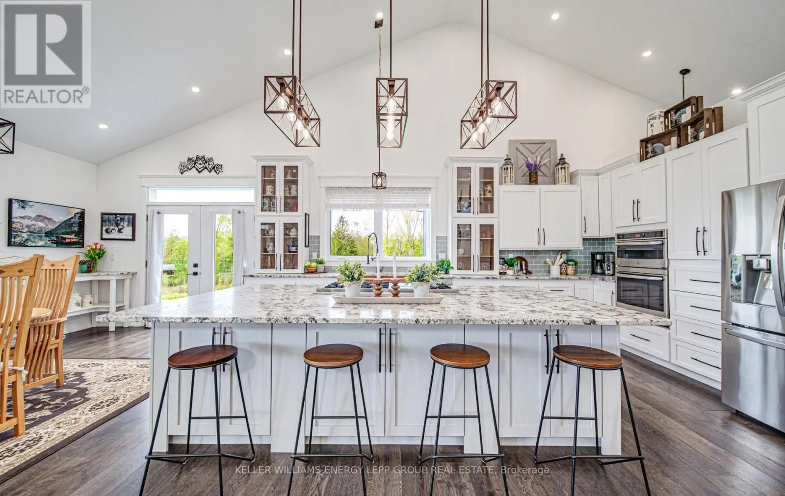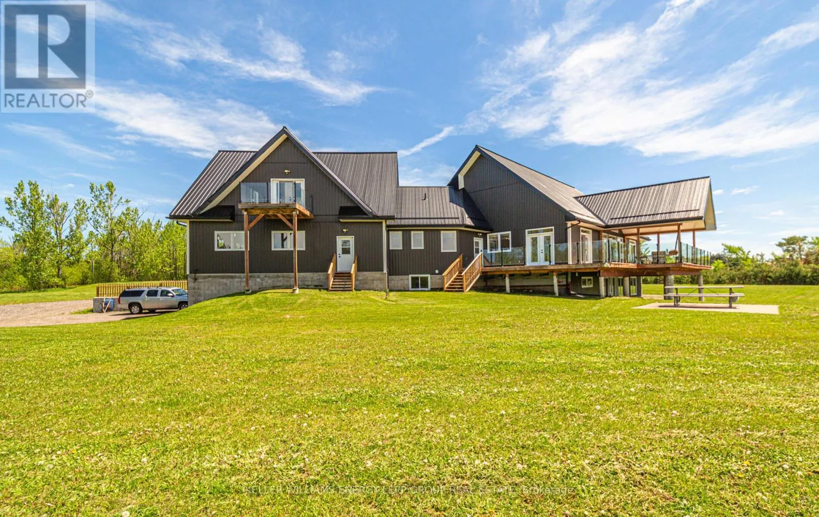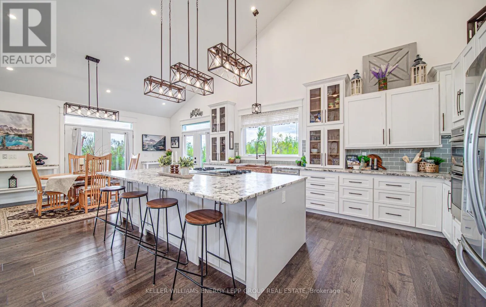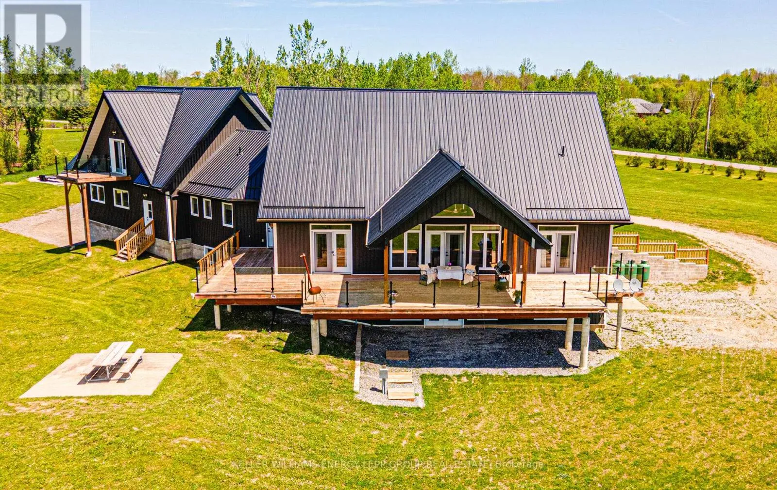 Ogemah Rd / Rainbow Ridge Rd This beautiful 3-bedroom, 3-bathroom custom-built home is set on a private 7.4-acre lot and offers exceptional space and craftsmanship throughout. Featuring 9-ft ceilings and 8-ft glass doors, the home is finished with 8-inch engineered hardwood flooring. The spacious living room boasts 16-ft cathedral ceilings, pot lights, ceiling fans, and 7-ft windows that flood the space with natural light and provide a seamless walkout to an approx. 800 sq ft deck with custom aluminum frameless glass railing perfect for alfresco dining and entertaining. Enjoy five walkouts to the main deck, ideal for seamless indoor-outdoor living. The gourmet kitchen is a showstopper, featuring maple cabinetry with solid oak doors, a distressed leather granite countertop, and a massive 5x10 center island. The primary bedroom includes a walk-in closet, walkout to the deck, and an opulent 5-piece ensuite. The 2,525 sq. ft. basement offers three additional walkouts and endless potential. Additional highlights include upper and lower garages, perfect for vehicles, tools, or extra storage. Located just 10-15 minutes from shops, a bakery, pharmacy, and restaurants, with easy access to parks, a library, medical services, and only a 5-minute walk to year-round recreation on Lake Scugog, including a nearby boat launch for convenient lake access. (id:27476)