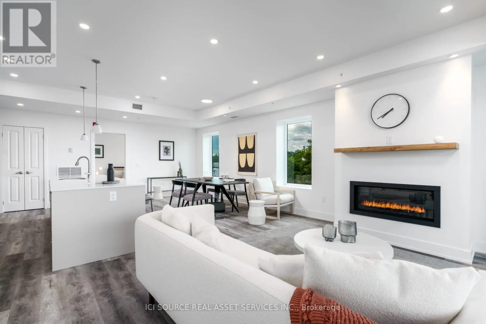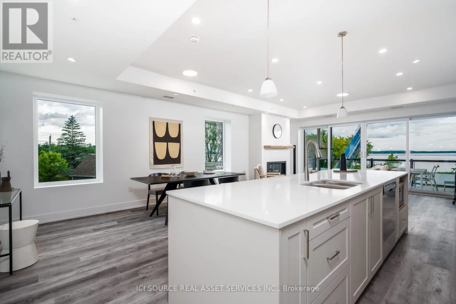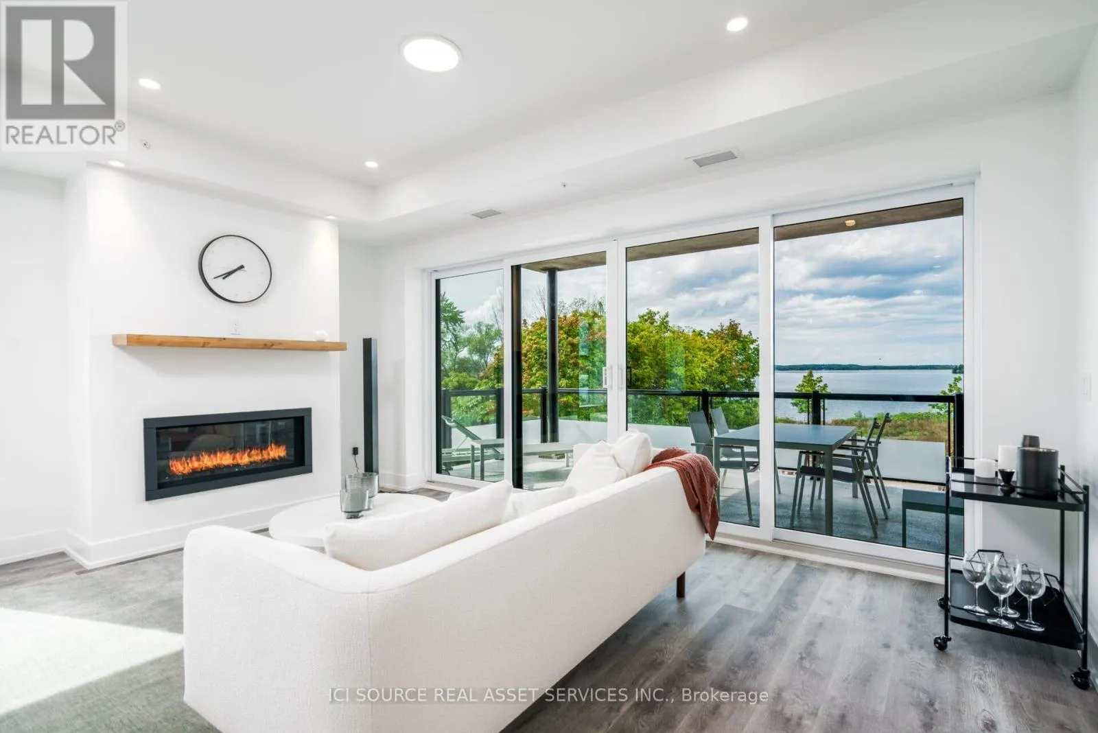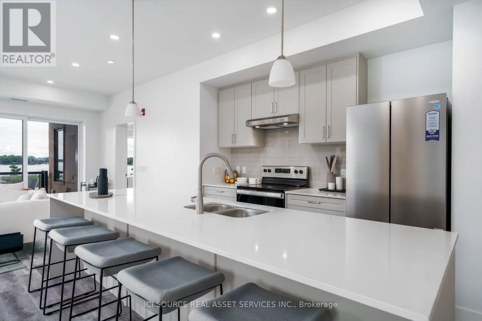 Cross Streets: West St & County Rd 8. ** Directions: West St N & Kawartha County Rd 8. Luxury resort-style condo living overlooking Lake Cameron in the heart of Fenelon Falls. This 1,309 sq ft suite offers year-round scenery and a private outdoor terrace with stunning lake views. A bright open-concept layout features 2 bedrooms, 2 bathrooms, laminate floors, 9' ceilings, and a chef-inspired kitchen with quartz counters, stainless steel appliances, center island, and ample storage. The living/dining area includes a cozy gas fireplace and walkout to the terrace with a gas BBQ line. Both bedrooms are spacious, with a large primary suite offering his and hers walk-in closets and a 4-piece ensuite. Includes 2 parking spots and a locker. Enjoy top-tier amenities: outdoor pool, lounge areas, watercraft dock, and fitness center. *For Additional Property Details Click The Brochure Icon Below* (id:27476)