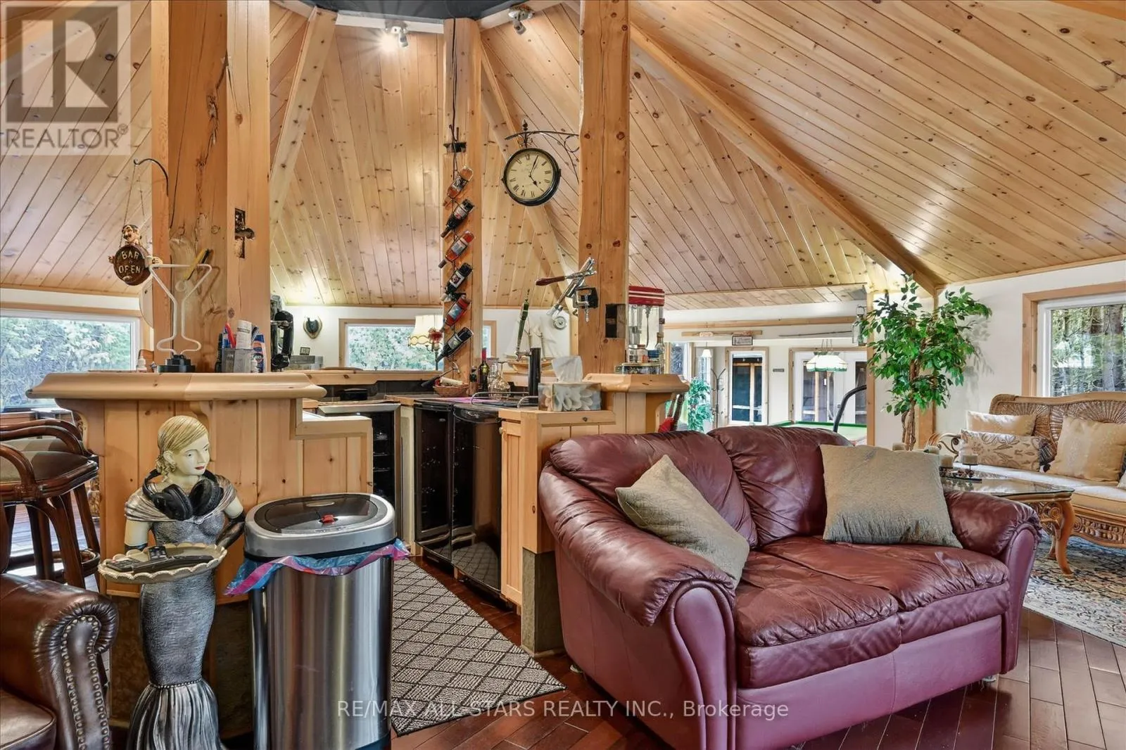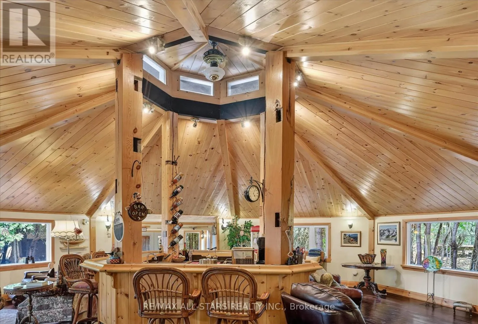 McGill to Cedar Crescent Welcome to a truly one-of-a-kind waterfront estate on Lake Scugog-where luxury living meets exceptional income potential in an unforgettable setting. Set on over 3/4 of an acre of private 95 ft of shoreline and offering over 3,500 sq ft PLUS of living space, this remarkable property is ideally suited for a large family, multi-generational living, or a possible turnkey Airbnb or Boutique Bed & Breakfast-all just minutes to Port Perry and Lindsay. At the heart of the home, the octagon-shaped great room is a true architectural showpiece, featuring cathedral post & beam ceilings, a stunning fireplace, and direct views of the lake. A full bar stands as the Centerpiece of this space, creating the ultimate atmosphere for entertaining and gathering. The home offers 5 uniquely themed bedrooms, each with its own fireplace, adding charm, warmth, and a memorable guest experience. A chef-inspired kitchen with two stoves is perfectly designed for hosting, while the formal dining room with fireplace provides an elegant setting for intimate dinners and special occasions. The games room/sunroom with floor-to-ceiling windows invites natural light and offers seamless connection to the outdoors. Step outside and embrace waterfront living with western exposure-enjoy long sunny days on the dock and unwind in the evenings with beautiful sunset views over the water. The enclosed gazebo with hot tub offers year-round enjoyment in total privacy. Additional features include a large Gas heated garage/workshop, a drive shed for additional storage, and the inclusion of much of the furnishings and dcor, making this a true turnkey investment opportunity. Located on the Trent-Severn Waterway, this is your opportunity Whether your envisioning a luxury retreat , income property or an unforgettable family compound this is a rare offering that simple cannot be replicated. Live Where other Vacation ,Welcome Home! (id:27476)