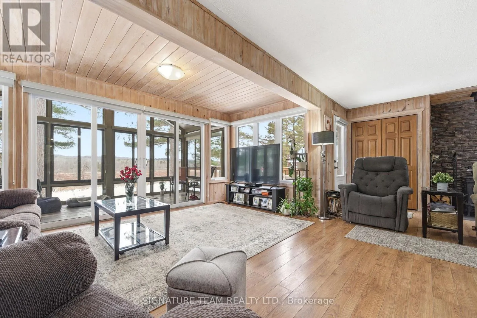 Cross Streets: Round Lake Rd and Turner's Rd. ** Directions: Turn down Turners Rd, left down Pecoskie Dr to number 642. Welcome to 642 Pecoskie Drive, nestled along 100 feet of pristine shoreline on the Bonnechere River, set within a quiet and welcoming community. This inviting property offers the perfect blend of relaxation, natural beauty, and year-round comfort. Positioned on a spacious lot with stunning sunset views, you can unwind by the water's edge or relax in the bright sunroom, where warm afternoon light fills the space and creates the perfect setting to start or end your day. The home features 3 bedrooms and 2 full bathrooms, with a functional layout designed for easy living. The main level offers everything you need, including a cozy open-concept living area highlighted by tongue-and-groove pine walls and a wood stove with a beautiful stacked stone backdrop. The primary bedroom is filled with natural light and showcases peaceful river views along with a charming pine ceiling. A guest bedroom and convenient main-floor laundry complete this level. The lower level expands your living space with an additional bedroom, full bathroom, propane wood stove, forced air furnace (2025), A/C (2025) and a sauna-creating a private retreat to relax and recharge after a day spent enjoying the outdoors. Outside, the property continues to impress with a paved driveway, newly shingled roof (2025), detached garage plus additional storage. A standby generator ensures comfort in all seasons offering peace of mind in the country. The generous yard provides plenty of space to garden, entertain, or simply take in the natural surroundings. Ideally located just a short drive to Algonquin Park and Bonnechere Provincial Park, this property is a gateway to some of Ontario's best outdoor recreation, including hiking, paddling, wildlife viewing, snowmobiling, and ATV trails. Experience the beauty, tranquility, and lifestyle this riverfront property has to offer-your escape to nature awaits. (id:27476)