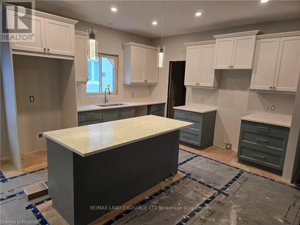 Kincardine - Highway #21 to Russell to Campbell and north. Ravine location brick bungalow, basically completed. Features finished lower level and many special features: AYA kitchen with granite or quartz countertops, center island and walk-in pantry. Patio doors from dinette to covered deck; open concept living / dining / kitchen area, with fireplaces in living areas up and down. Walk-in closets in both main floor bedrooms. Combination garage - entry and main floor laundry and mudroom. Pony panel has been installed to enable a substantial stationary electricity generator. Lower level finished with two extra bedrooms or special purpose rooms; third full bath; huge 16' X 25' family room with fireplace; walkout from utility area to full 2-car garage.1523 square-feet on main floor plus 1323 finished down. All this near parkland and Kincardine trail access and only four blocks to downtown, schools and arena / community centre. Yard will be sodded front and rear. Please note room measurements have been rounded.. (id:27476)