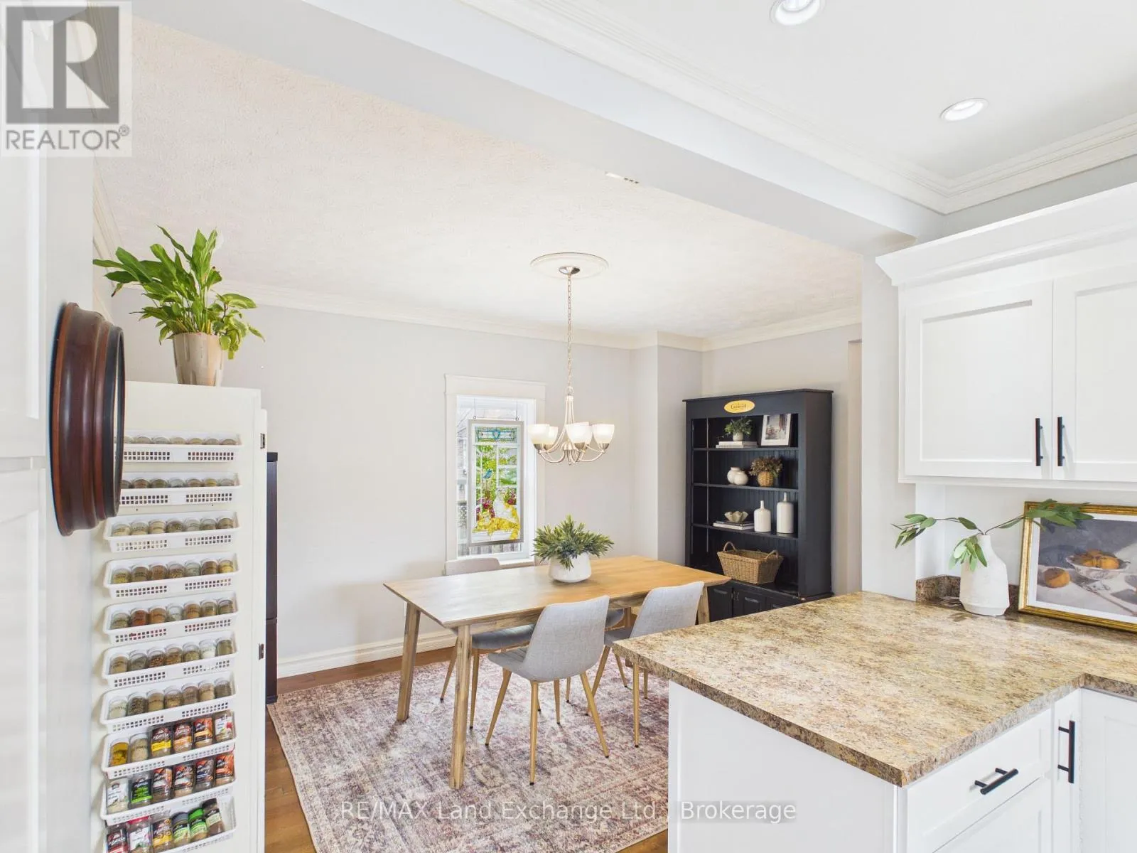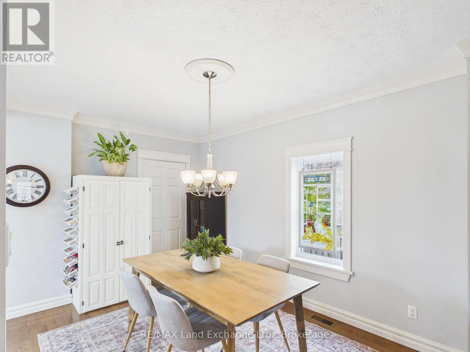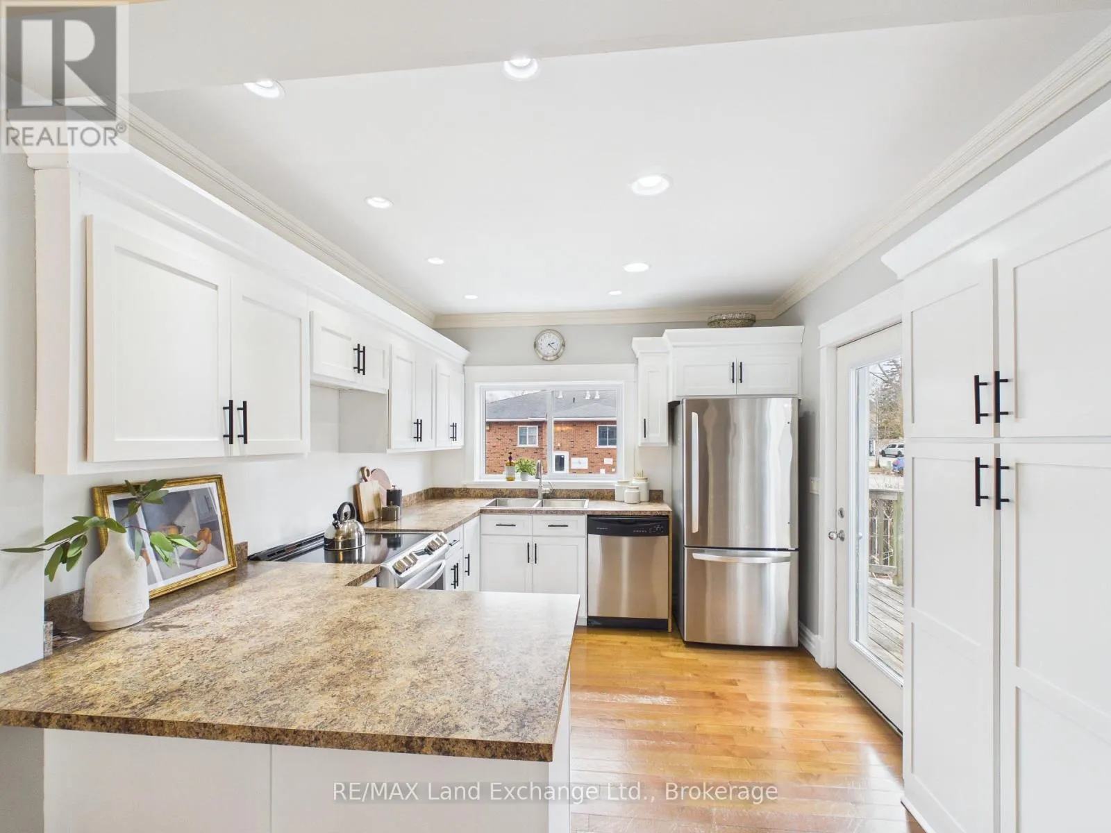 Cross Streets: Durham Street. ** Directions: 842 Olde Victoria. Ideally located in the heart of downtown, this well-maintained home is just a short walk to the harbour, shops, restaurants, and all the amenities that make Kincardine's vibrant downtown so desirable.Pride of ownership is evident throughout, with numerous upgrades completed over the years including windows, insulation and siding, eavestroughs and soffits, shingles, plumbing, and a 200-amp electrical service. The interior features hardwood floors, ceramic tile, detailed trim work, and crown moulding.The bright eat-in kitchen offers convenient access to the rear deck, perfect for outdoor dining or relaxing. The surprisingly private backyard includes mature perennial gardens and an insulated storage shed, providing both beauty and practical storage.This move-in-ready home combines comfort, character, and an unbeatable location close to the harbour and downtown conveniences. (id:27476)