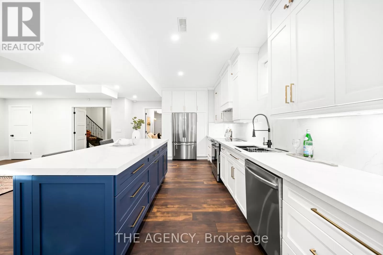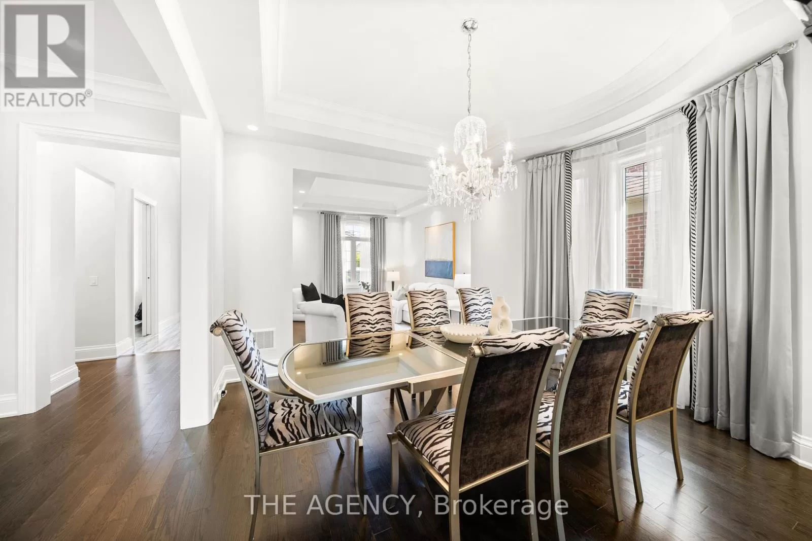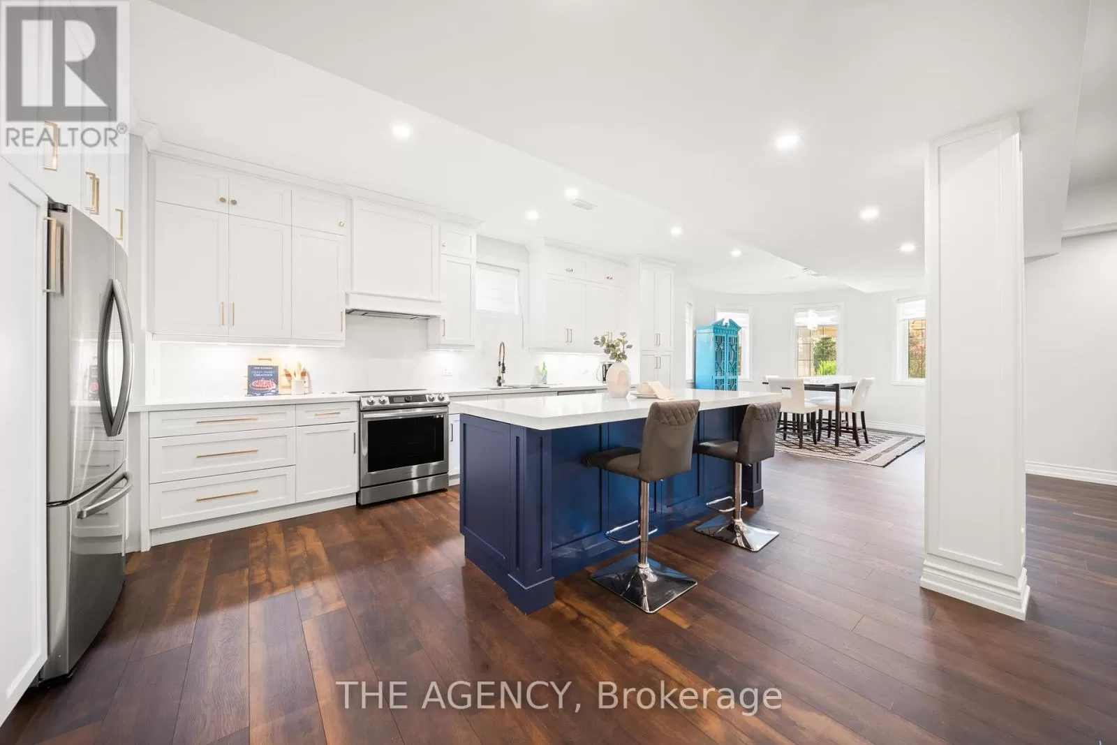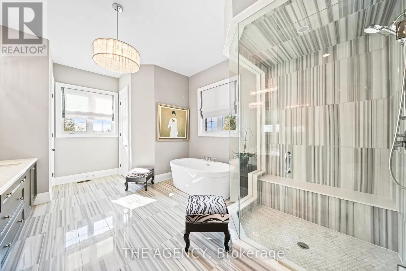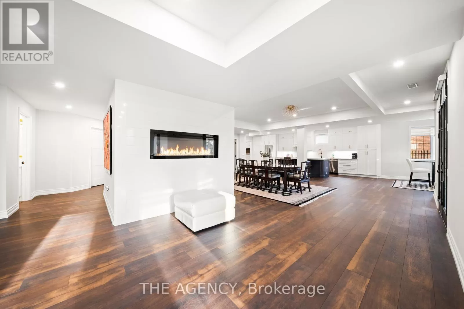 King Vaughan Rd./Keele St. Located in the heart of King City, this beautiful bungaloft offers more than 6,900 square feet of finished living space in a community prized for its parks, trails, excellent schools, and quick access to the King City GO station. The home is introduced by a stone-and-stucco façade, a three-car garage, and landscaped grounds with a terrace and rear patio overlooking the ravine. Inside, soaring ceilings, hardwood floors, and detailed millwork set an elegant tone. The front foyer rises two storeys, leading to a series of principal rooms defined by coffered ceilings: a paneled office, a formal living and dining room, and a family room anchored by a gas fireplace. At the centre of the main level, the kitchen is fitted with dark-stained cabinetry, quartz counters, and a full suite of Wolf and Sub-Zero appliances. The adjoining breakfast area opens directly to the terrace. A main-floor primary suite with a spa-like ensuite and walk-in closet provides a private retreat, while a second bedroom with its own ensuite adds flexibility for family or guests. An elevator connects all three levels. The upper floor includes two additional bedrooms, a full bath, and a den well suited for children, extended family, or a separate study. The fully finished lower level is above grade, with oversized windows and French doors leading to the rear patio. This home includes total of 4 + 2 bed and 4 + 2 bath. Designed as a complete secondary living area, it includes a full kitchen with quartz counters and Samsung appliances, a dining area, a large recreation room with fireplaces, two bedrooms, and additional baths. This thoughtful layout makes the property especially accommodating for multi-generational living. Every detail of this residence reflects quality and enduring design, offering a rare opportunity in one of King City's most desirable settings. (id:27476)