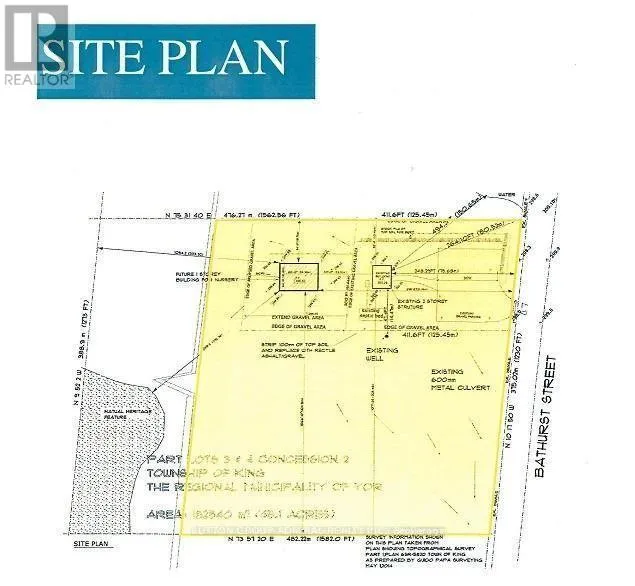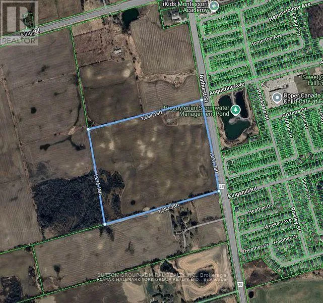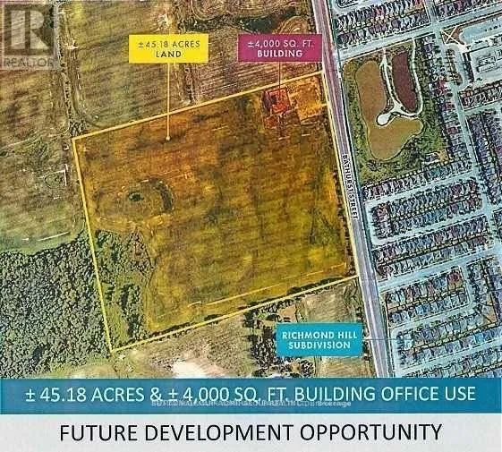 Bathurst & King Future Development Opportunity - 45.18 Acres | Bathurst St Just South of King Rd. Rare offering of approximately 45.18 acres with 1,230 feet of frontage on the west side of Bathurst Street, just south of King Road. Prime location positioned along the Richmond Hill subdivision boundary with convenient access to Highways 400 & 404, offering exceptional long-term growth potential. Currently zoned Agricultural, permitting agricultural uses and greenhouse operations, including policies allowing up to 60% greenhouse cultivation and 20% enclosed building coverage, subject to required approvals and licensing. Planning review indicates potential future residential redevelopment in the 2028/2029 time frame. Preliminary assessments suggest the possibility of accommodating approximately 282 residential units, subject to Official Plan Amendment, rezoning, draft plan approval, servicing allocation, and all municipal and regional approvals. Purchasers are advised to conduct their own independent due diligence regarding development potential, timelines, and permitted uses. The property is improved with an existing approximately 4,000 sq. ft. two-storey commercial building featuring equipment storage, four drive-in doors, approximately 100,000 sq. ft. asphalt yard, ample exterior lighting, and a 28-ft access gate. An approved permit is in place for an additional approximately 4,600 sq. ft. storage building.Ideal opportunity for investors, agricultural operators, owner-users, or land bankers seeking strategic long-term appreciation in a high-growth corridor.Don't miss this exceptional opportunity. (id:27476)