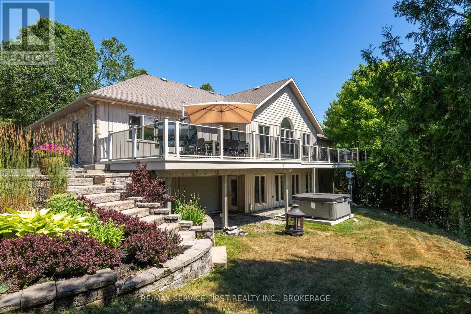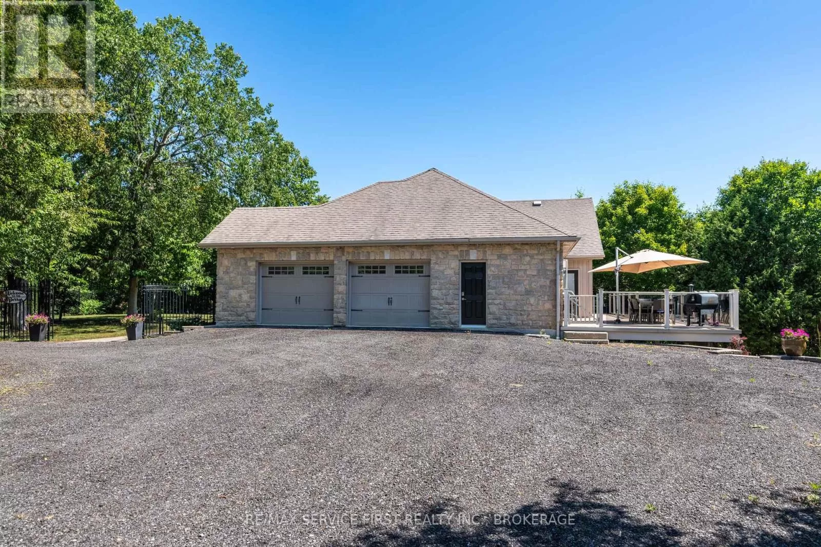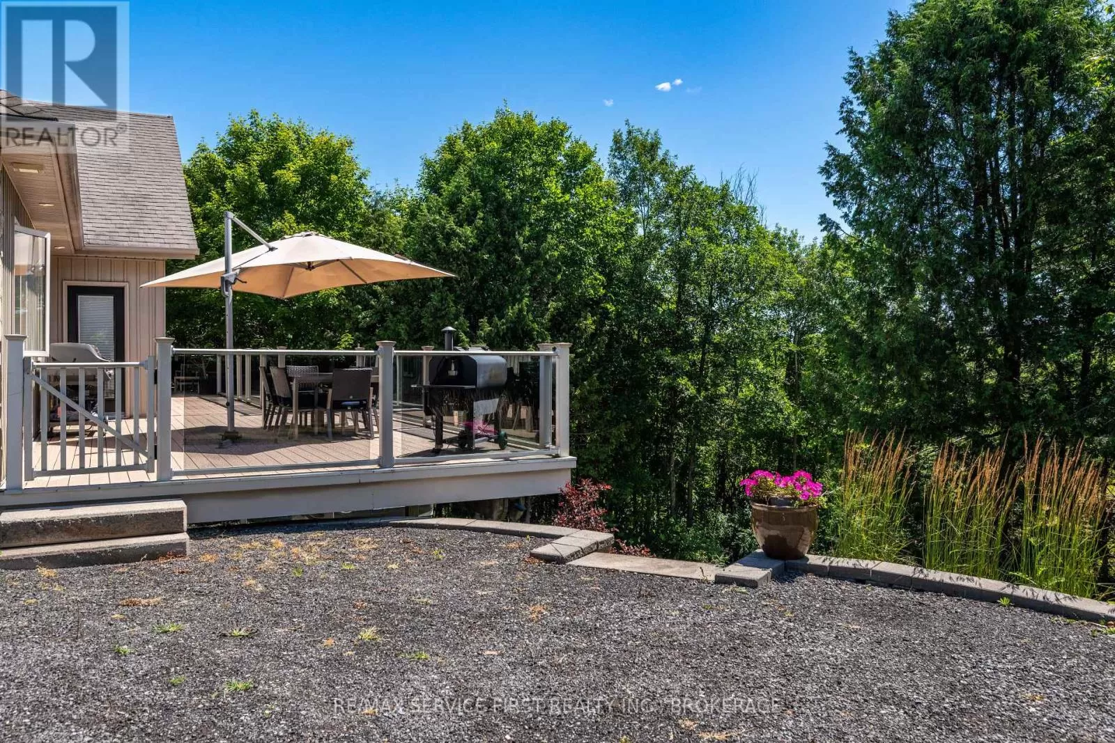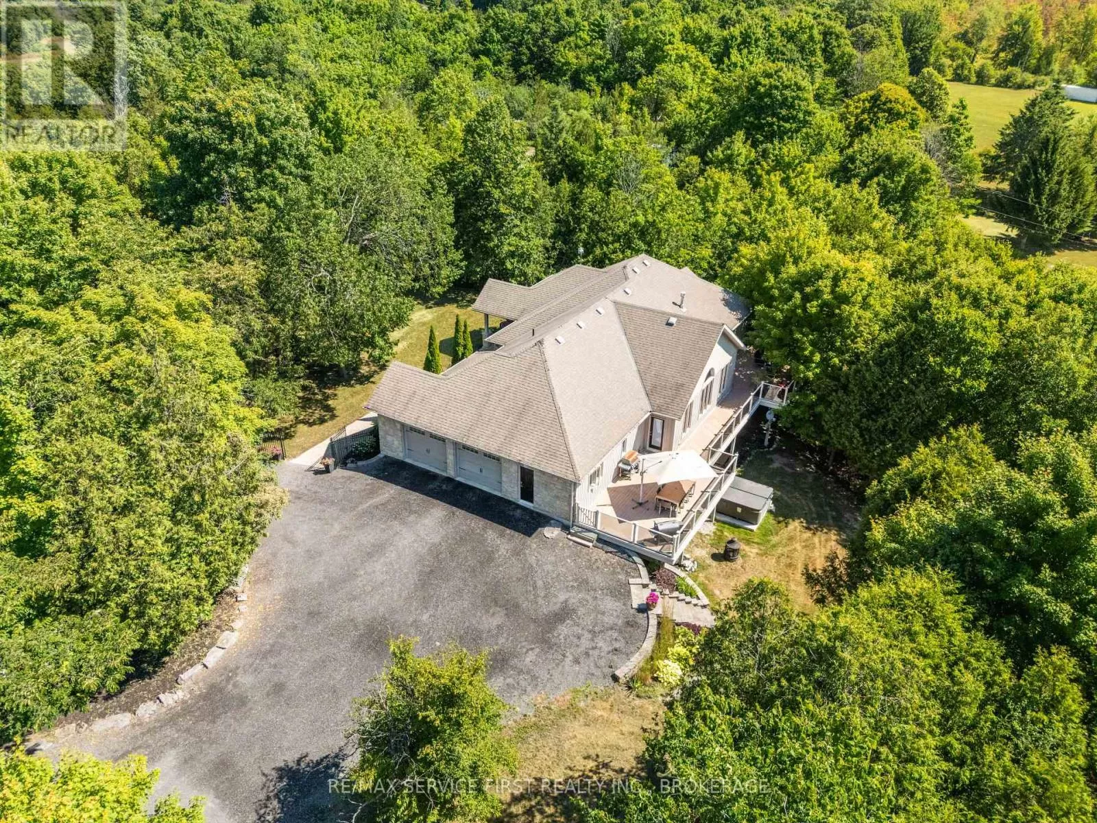 Cross Streets: Highway 38 and Unity Road. ** Directions: 38 Highway to Unity Road. This custom built 2400 sqft executive bungalow is surrounded by rural tranquility as it sits at the back of a 6.5 acre lot and only 10 minutes to the city. Boasting beautiful wooded views from the expansive composite deck with glass railings. The home features 3 plus 1 generous sized bedrooms, 3 and half baths with main floor laundry, in-floor radiant heat on both levels plus in both garages. The full two car attached garage fits 2 trucks, plus the lower-level garage/workshop is perfect for all your storage and toys. The main floor boasts a spacious great room, dining room with vaulted ceiling, glass railings, gas fireplace and travertine tile, plus an office with half bath and crown molding. The open concept kitchen is spacious with all the modern touches. Viking range, built-in double oven, prep area and pantry. The perfect space to entertain. The primary bedroom is complete with patio doors to the rear deck, full bath with glass shower, soaker tub and walk-in closet. Head down the custom hickory stairs with glass railings to the lower level that is fully finished and walk-out, offering loads of natural light in the oversized rec-room with space for the Pool table, ping pong and bar. Plus a bedroom, full bath, den and access to the storage garage/workshop. Step outside to see a private hot tub, landscape lighting, fenced area for the pets and circular drive. Additional updates and features include, Boiler 2025, wall air conditioner unit 2022, water constant pressure system 2022, Hot tub 2022, Ceiling Air conditioning system, plus full generator backup system with new motor 2025. (id:27476)