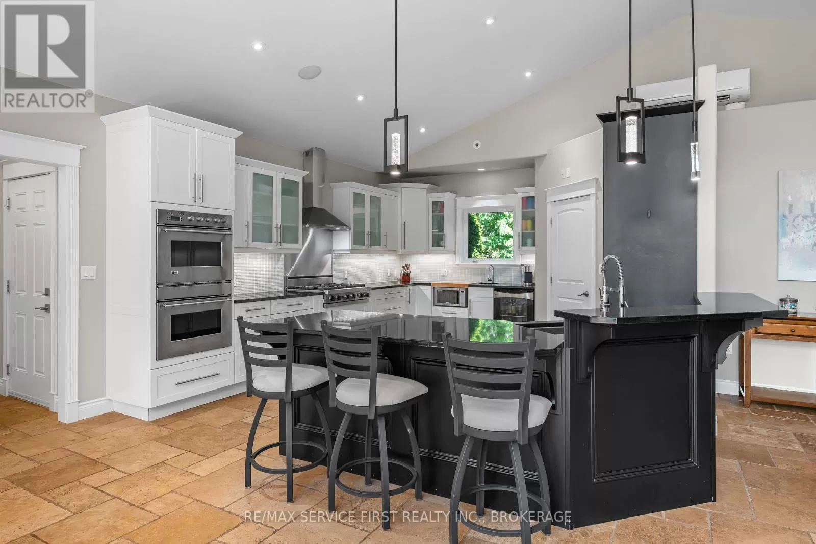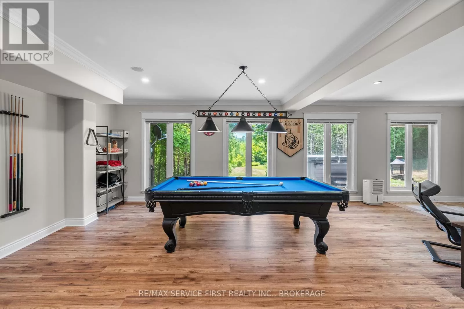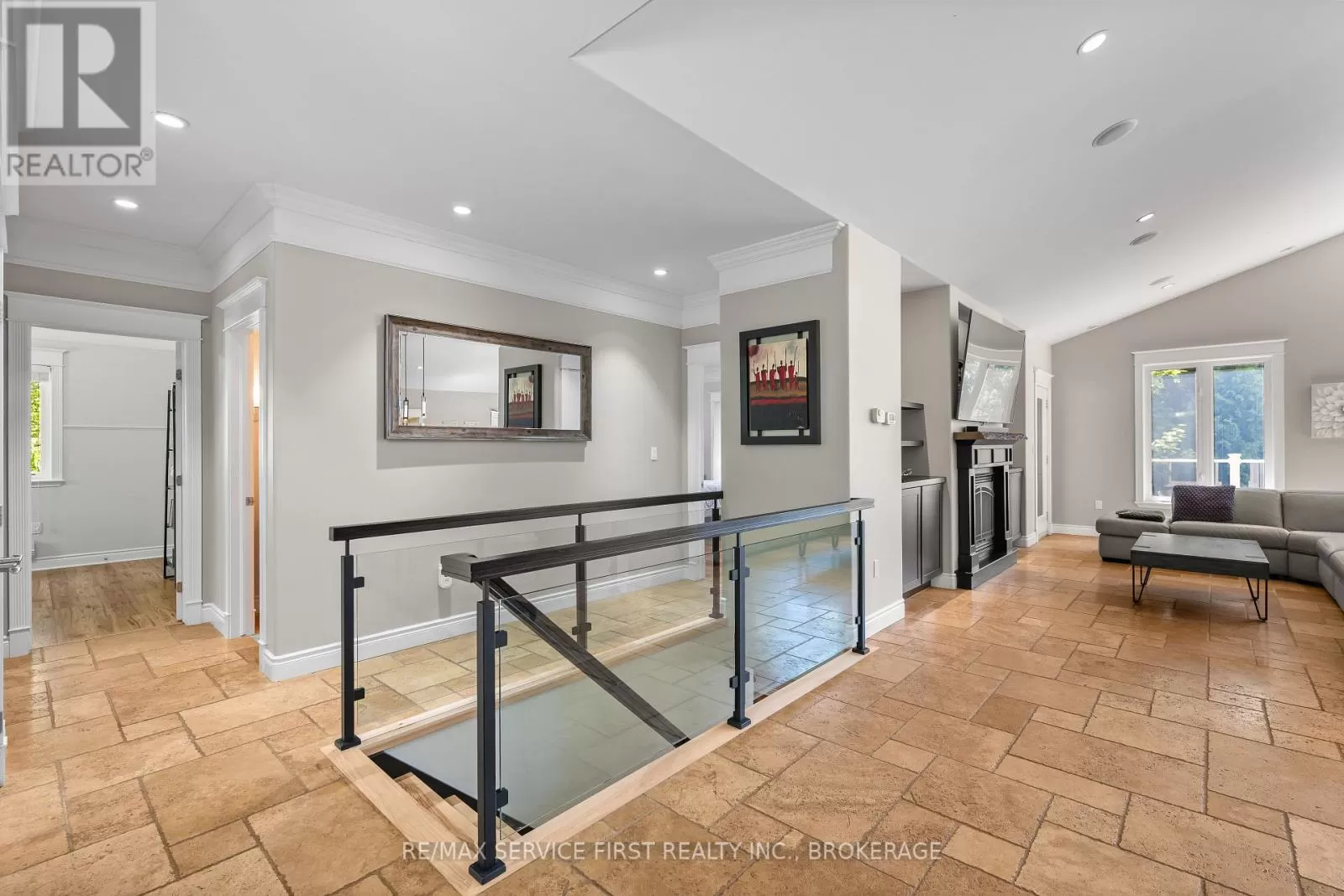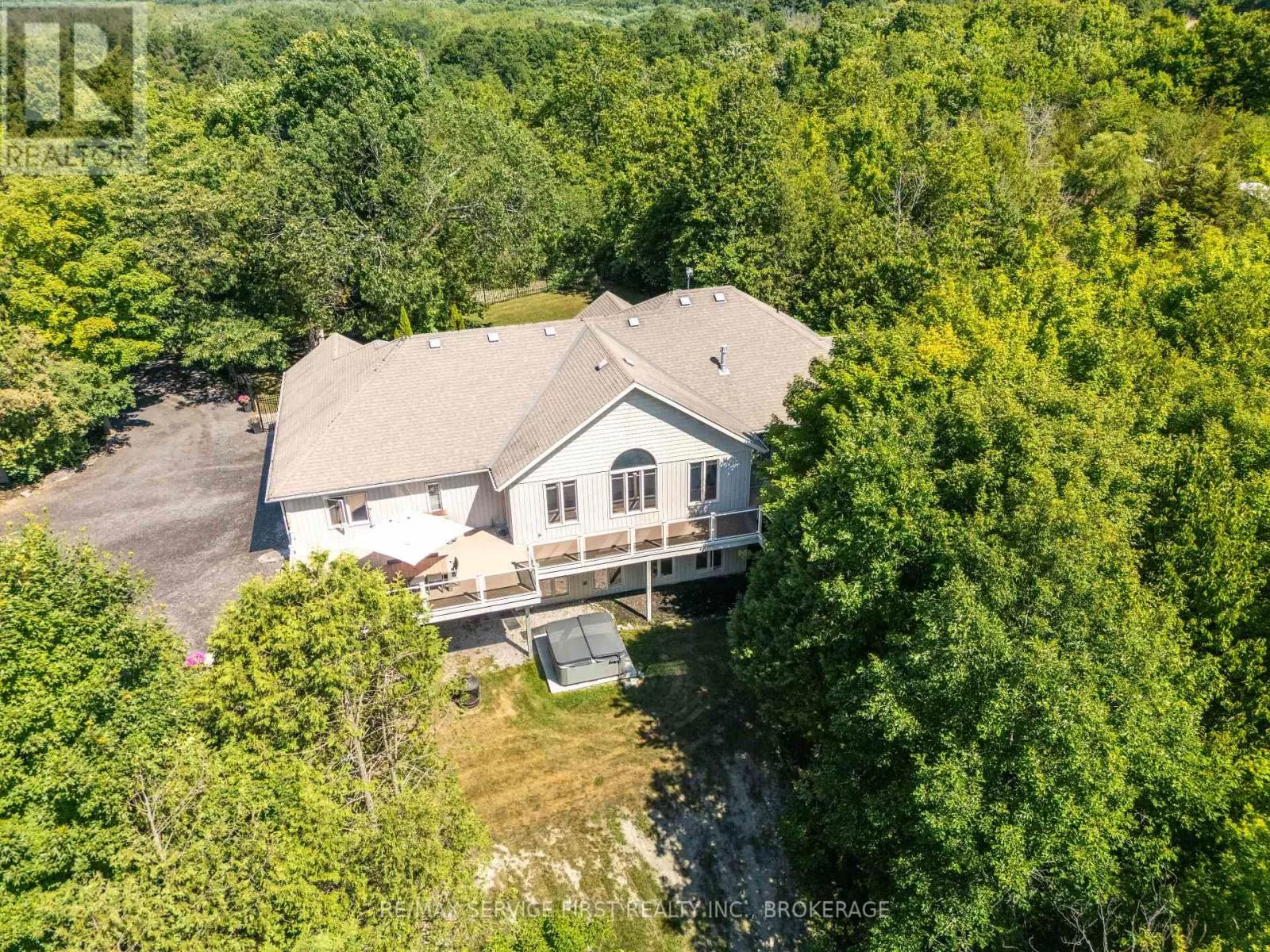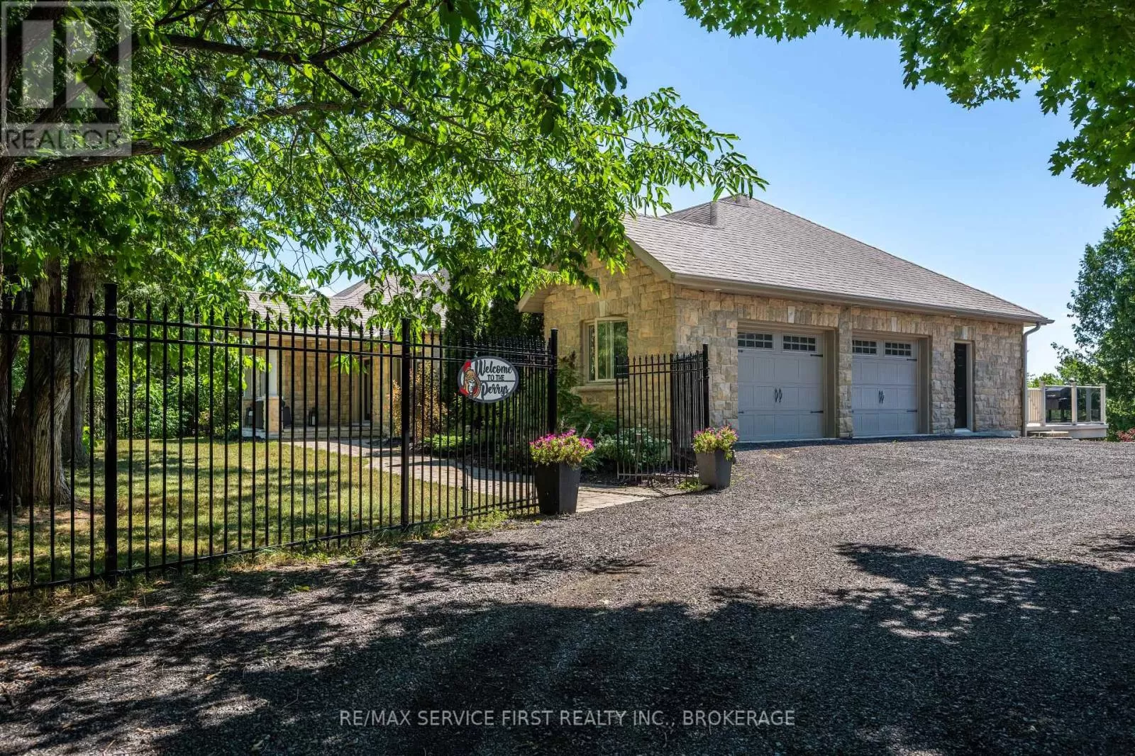 Cross Streets: Highway 38 and Unity Road. ** Directions: 38 Highway to Unity Road. This custom built 2400 sqft executive bungalow is surrounded by rural tranquility as it sits at the back of a 6.5 acre lot and only 10 minutes to the city. Boasting beautiful wooded views from the expansive composite deck with glass railings. The home features 3 plus 1 generous sized bedrooms, 3 and half baths with main floor laundry, in-floor radiant heat on both levels plus in both garages. The full two car attached garage fits 2 trucks, plus the lower-level garage/workshop is perfect for all your storage and toys. The main floor boasts a spacious great room, dining room with vaulted ceiling, glass railings, gas fireplace and travertine tile, plus an office with half bath and crown molding. The open concept kitchen is spacious with all the modern touches. Viking range, built-in double oven, prep area and pantry. The perfect space to entertain. The primary bedroom is complete with patio doors to the rear deck, full bath with glass shower, soaker tub and walk-in closet. Head down the custom hickory stairs with glass railings to the lower level that is fully finished and walk-out, offering loads of natural light in the oversized rec-room with space for the Pool table, ping pong and bar. Plus a bedroom, full bath, den and access to the storage garage/workshop. Step outside to see a private hot tub, landscape lighting, fenced area for the pets and circular drive. Additional updates and features include, Boiler 2025, wall air conditioner unit 2022, water constant pressure system 2022, Hot tub 2022, Ceiling Air conditioning system, plus full generator backup system with new motor 2025. (id:27476)