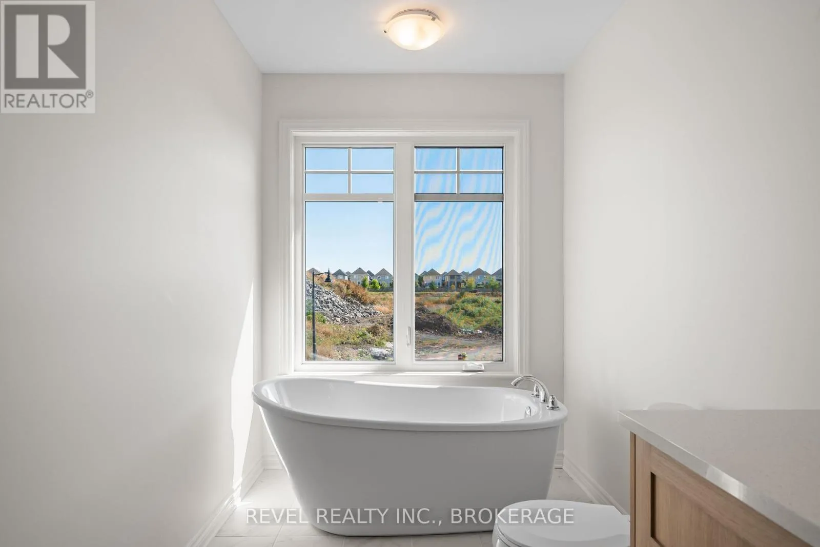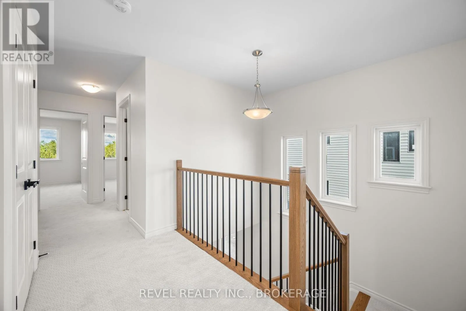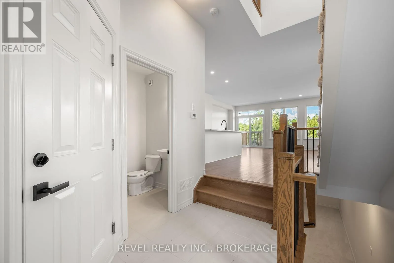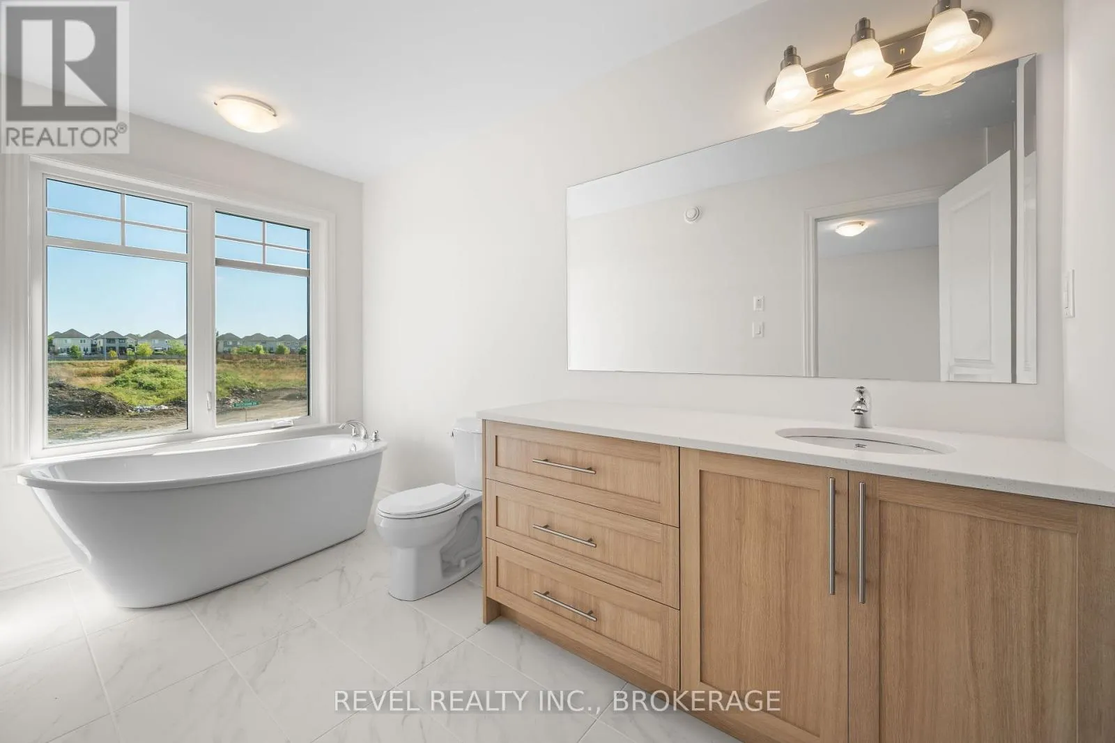 Cross Streets: Cataraqui Woods Drive and Woodhaven Drive. ** Directions: Cataraqui Woods Drive to Woodhaven drive to Buckthorn Drive. Here is "The Camden", a move-in ready end-unit lookout townhome offering 2,160 sq ft of finished living space in Kingstons northwest Woodhaven community. The main floor features maple hardwood, quartz countertops throughout, a bright kitchen with white shaker cabinetry, upgraded sink, and walk-in pantry, plus a cozy gas fireplace. The primary suite showcases a spa-like 4-piece ensuite with a freestanding tub and walk-in tile/glass shower. The finished lookout basement, complete with a bathroom rough-in, provides versatile additional living space. This ENERGY STAR certified home is designed for comfort, style, and efficiency. (id:27476)