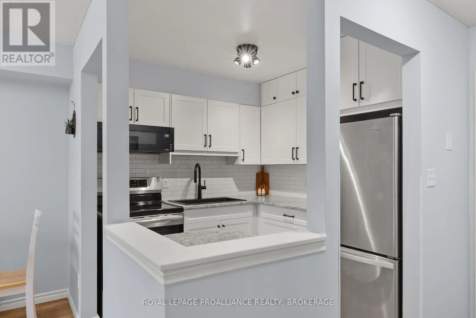 Cross Streets: Centennial Drive & Armstrong Road. ** Directions: Centennial Drive to Kingsdale Ave. Armstrong Dr., Left on Kingsdale Ave. Welcome to 310 Kingsdale Ave, Unit 312. This affordable 2 bedroom home is ideal for the first time buyer, retiree, or student(s). With approx. $26,0000.00 worth of modern upgrades since2021 there is literally nothing to do but move in and enjoy. The kitchen will inspire the chef within. White shaker style cabinets to the ceiling accented by black hardware. Timeless subway tile backsplash; black granite kitchen double sink with retractable faucet blend inseamlessly with the cabinet hardware and lighting. The open concept to living room with patio doors to balcony ensures lots of natural light. The spa inspired bathroom has a fresh contemporary feel featuring new tub surround, vanity, fan and chic accessories. The Coretec flooring is the perfect combination of beauty and resilience, being pet friendly and easy to clean. New lighting and paint. 4 appliances (2021). The building is quiet with a tree lined parking area providing natural beauty and privacy from the unit's balcony. Elevator and laundry facilities provided. Bus stop at street. The location is ideally located between Kingston's downtown core and it's West end ensuring easy access to one's everyday needs. St. Lawrence College is (7 minute drive) and Queen's University (11 minute drive). Make sure this property is on your viewing list. (id:27476)