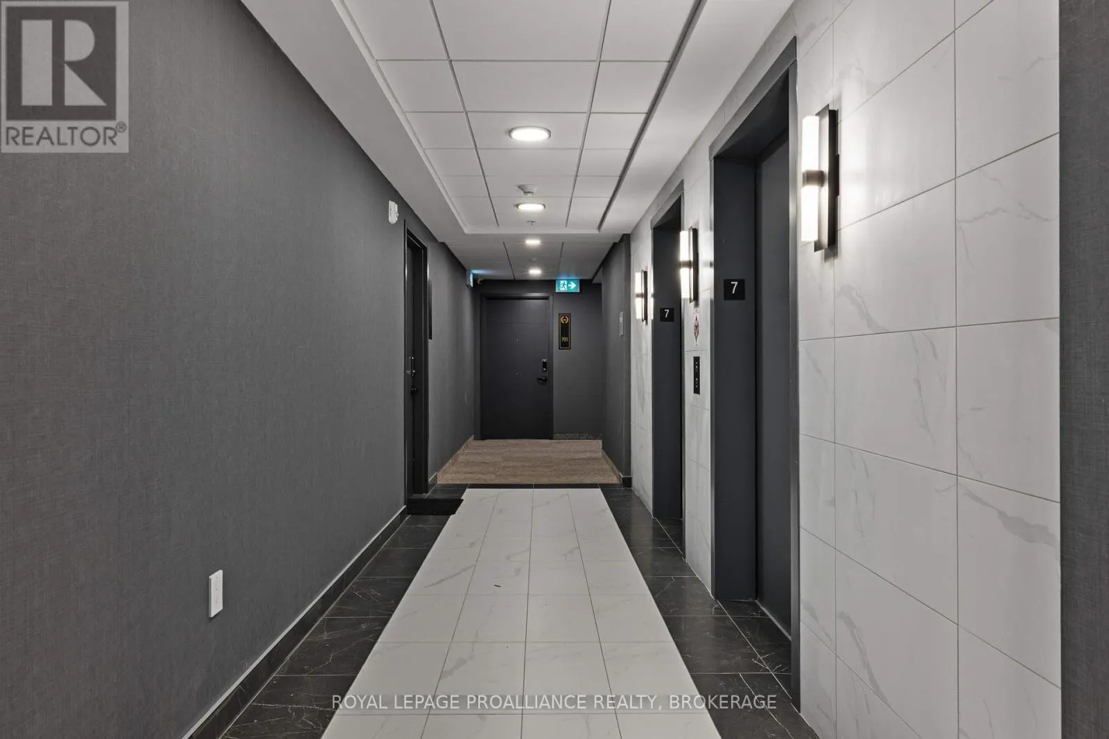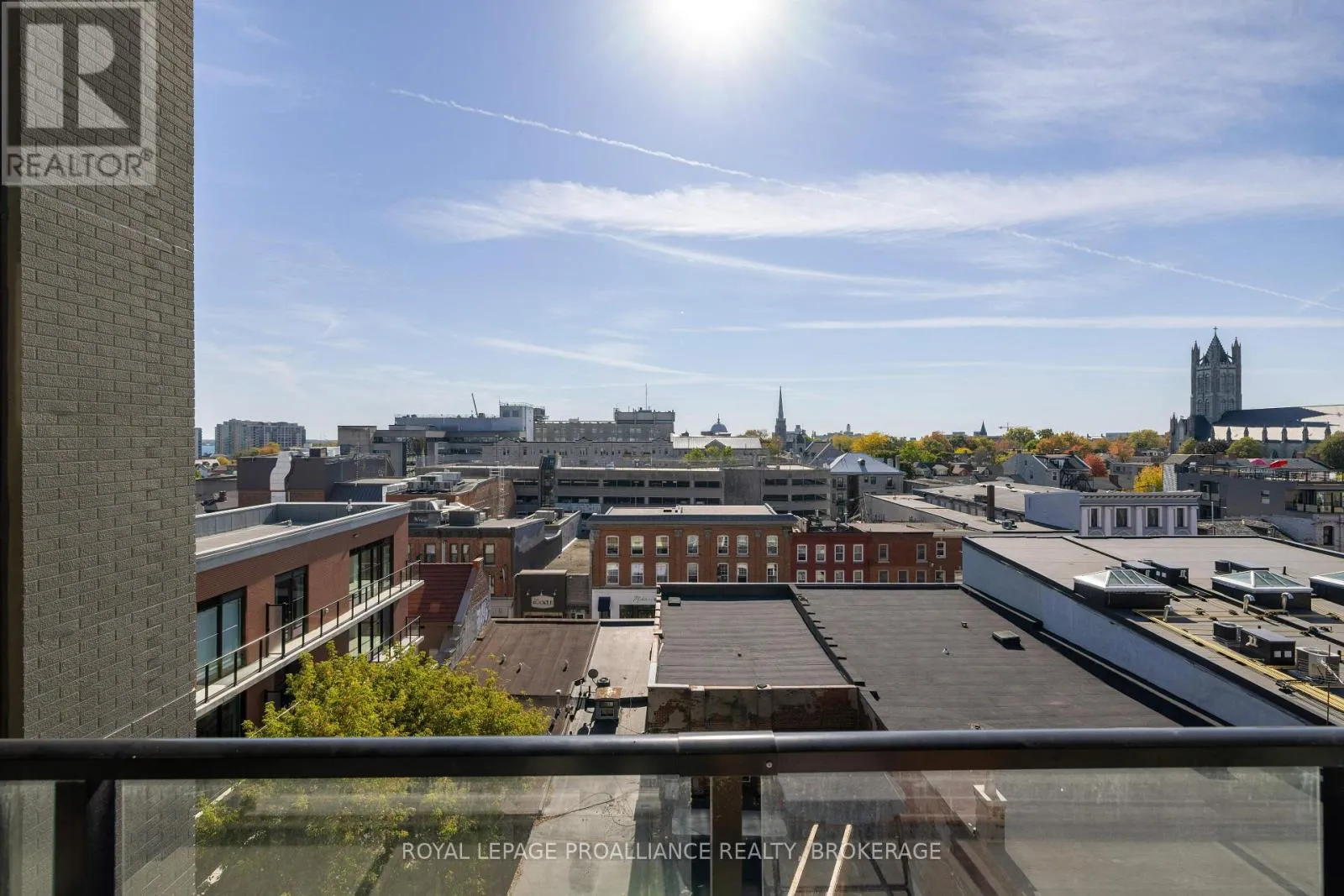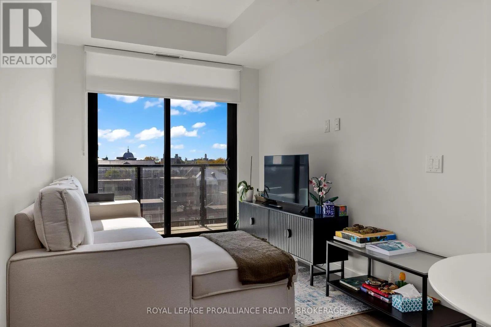 Cross Streets: Sydenham Street. ** Directions: Princess & Sydenham Street. Step into modern living with this stunning 600+ sq. ft. unit on the seventh floor of Kingston's newest condo development!Features include a spacious bedroom and dedicated office area, perfect for working from home,two full bathrooms for added convenience, a bright and sunny living area with patio doors leading to a balcony with expansive views of downtown,in-suite laundry for effortless living,and a dedicated parking space and secure bike storage.This exceptional building offers a lifestyle like no other with a rooftop patio complete with barbecues, a yoga studio, meeting rooms, and a stylish party lounge for entertaining friends and family. All of this is just steps away from the vibrant Princess Street, where you can explore local shops, eateries, and cultural attractions.Don't miss your chance to own a piece of this urban oasis! Whether you're a first-time buyer,looking to downsize, or seek a lucrative investment opportunity, this condo is perfect for you! (id:27476)
