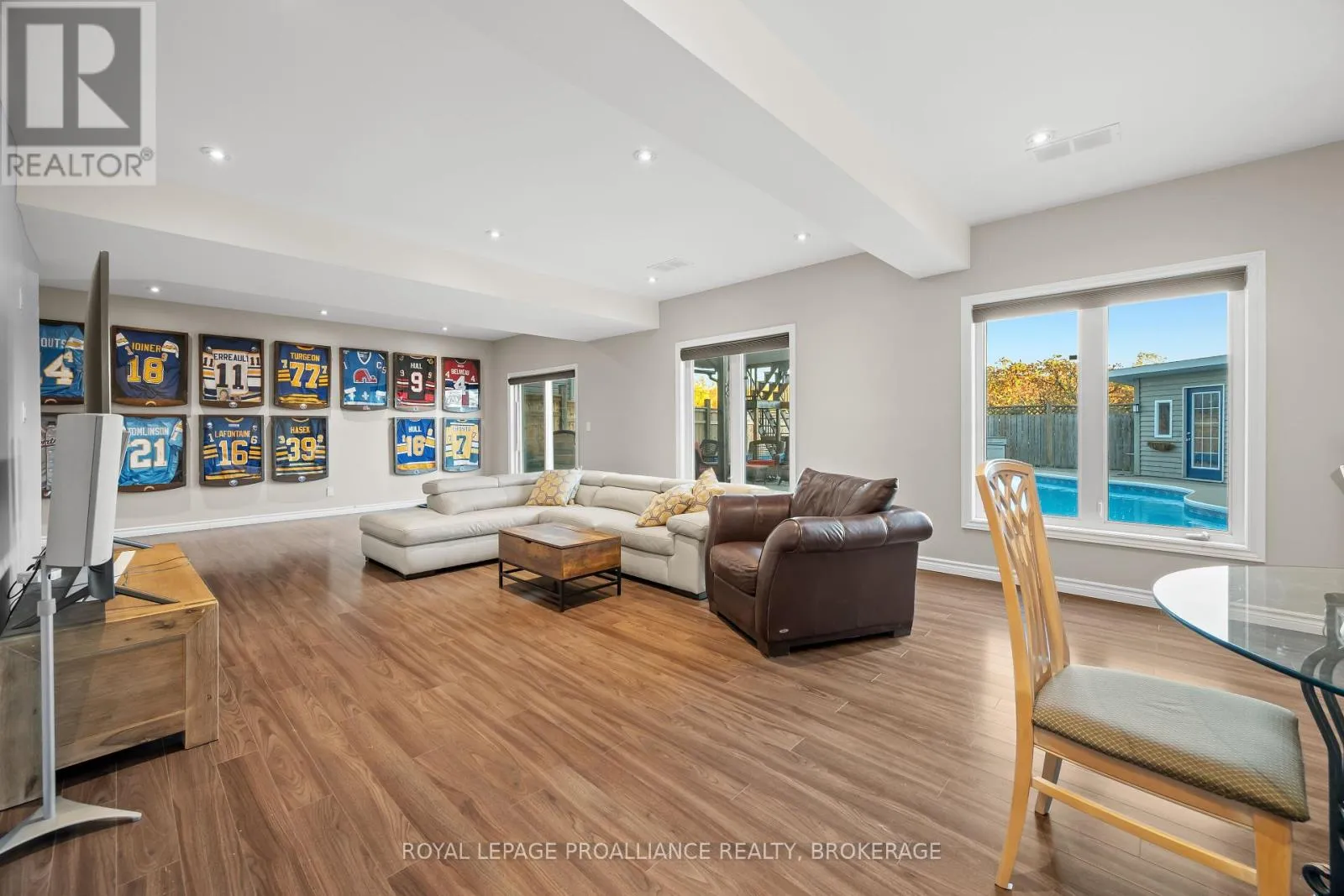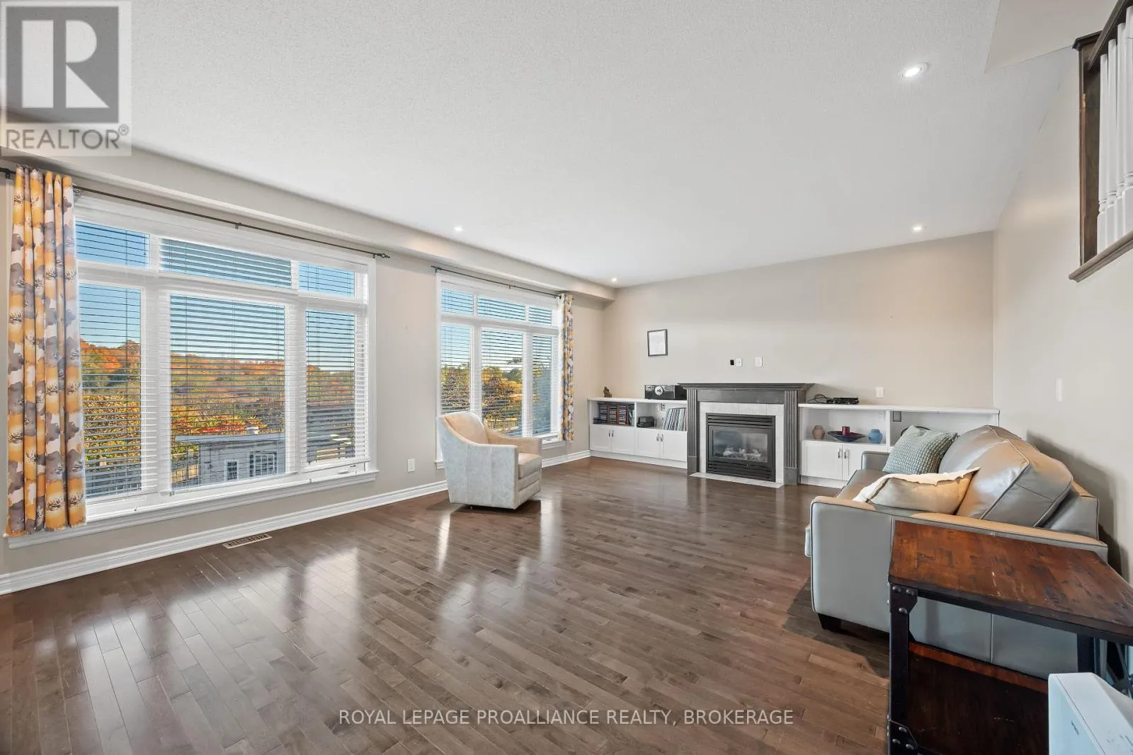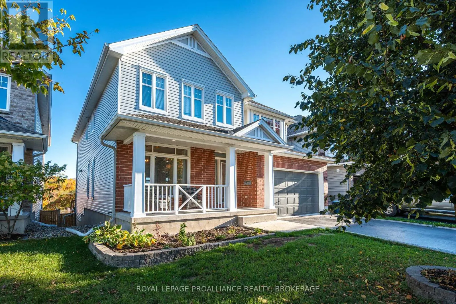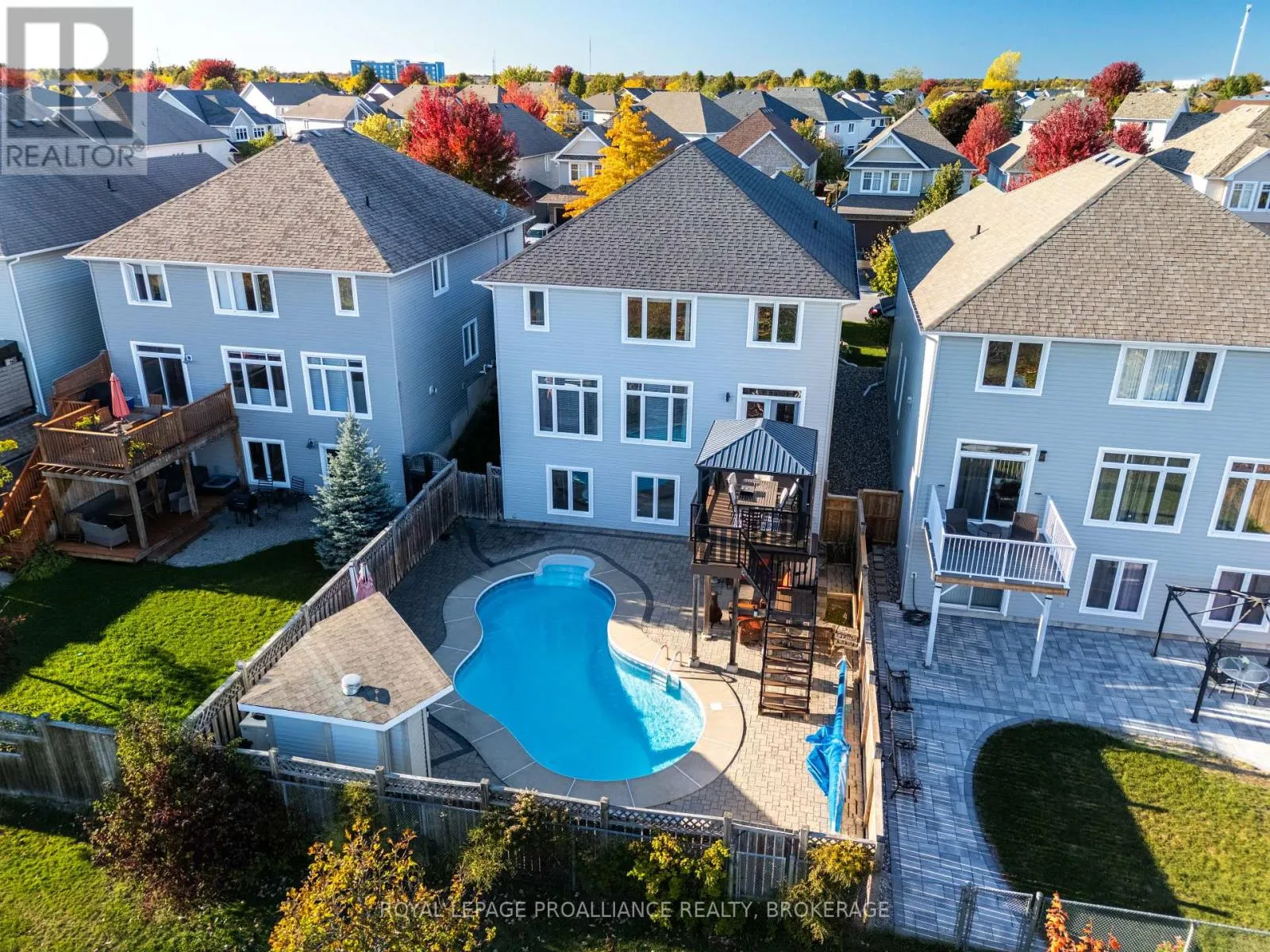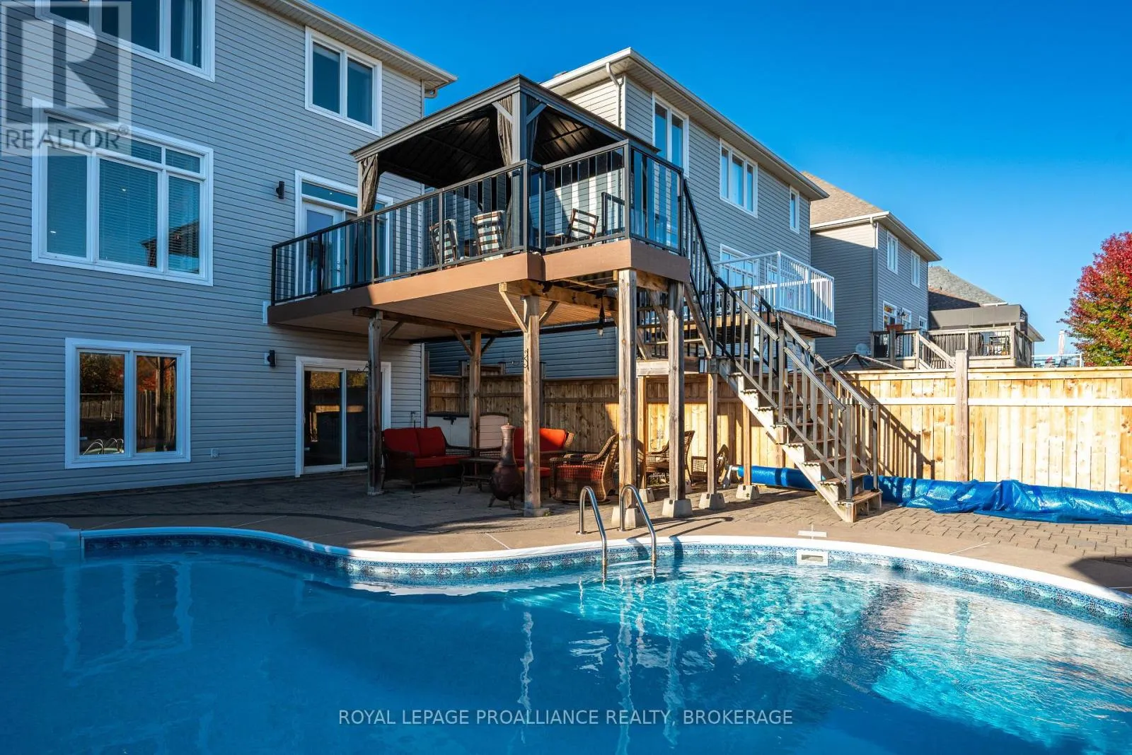 Cross Streets: Fieldstone Dr & Greenwood Park Dr. ** Directions: HIGHWAY 15 TO GORE ROAD, LEFT ON ROSE ABBEY DRIVE, RIGHT ON FIELDSTONE DRIVE. Welcome to this stunning, over 3000 sq ft Tamarack Oxford Model on the highly desirable East End street of Fieldstone Drive. Step into the main floor to find hardwood flooring throughout, an open foyer with adjacent living & dining space combination, an office/den, inside entry to the double garage & a 2pc bathroom. The beautiful open concept kitchen with maple cabinetry, granite countertops, a large kitchen island connected to the massive living room with large windows, a gas fireplace & exterior door to the elevated balcony overlooking the Greenwood Park trail & Butternut Creek. The upstairs also hosts hardwood throughout, 3 large bedrooms, one with walk-in closet & a 4pc ensuite, 2nd floor laundry, another 4pc bath, & finally the primary with 5pc ensuite with his & hers sinks, soaker tub, tiled shower & ample closet space. The fully finished walk-out basement with laminate flooring has a large rec room, an additional 3pc bath with ceramic tile flooring, a games room doubling as a bonus bedroom or office, utility room & storage space. The fully fenced backyard features interlocking brick, a kidney shaped in ground salt water & heated pool along with a pool shed. This beautiful home is located just a few minutes from CFB Kingston & all other east end amenities, & is arguably one of the most fully loaded homes in the area. (id:27476)