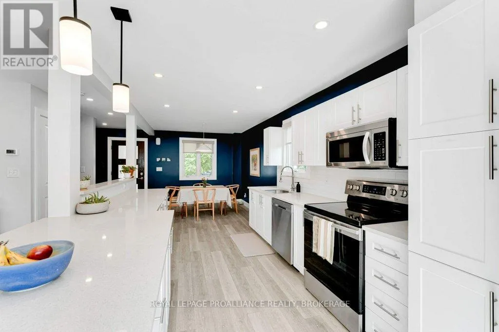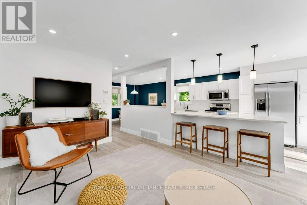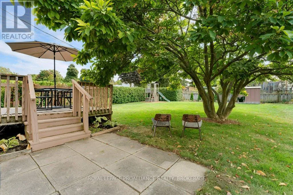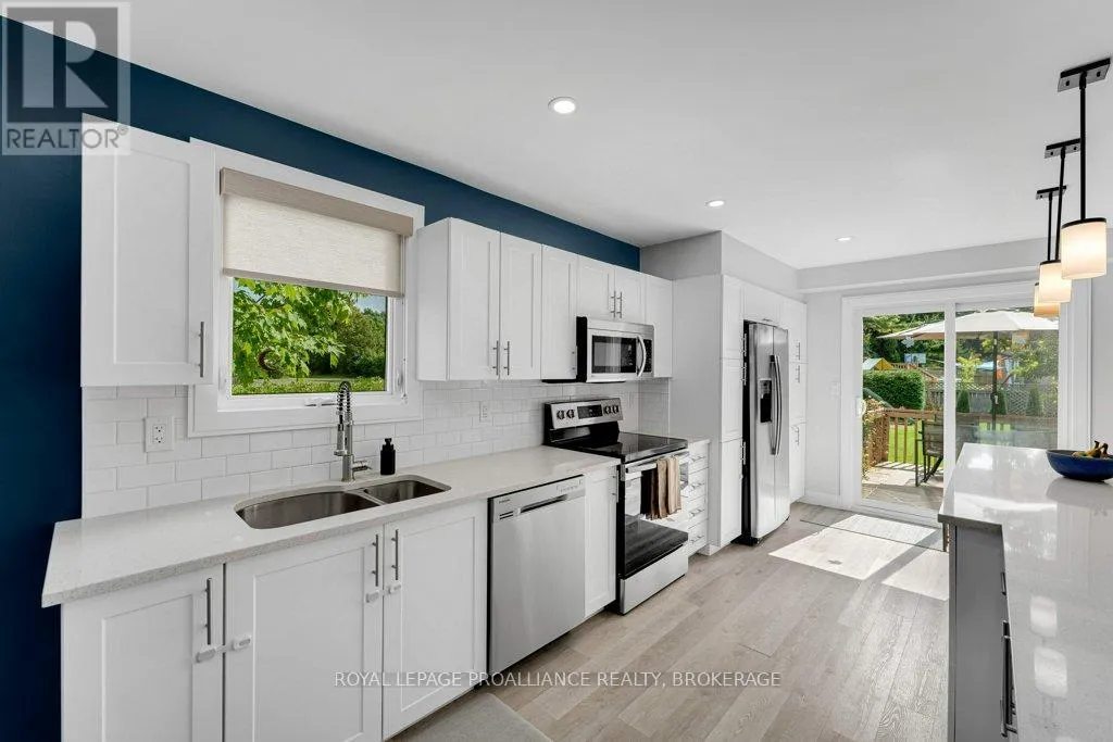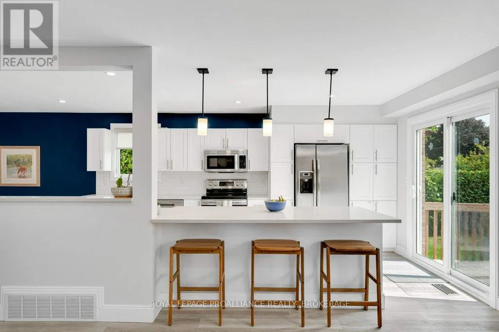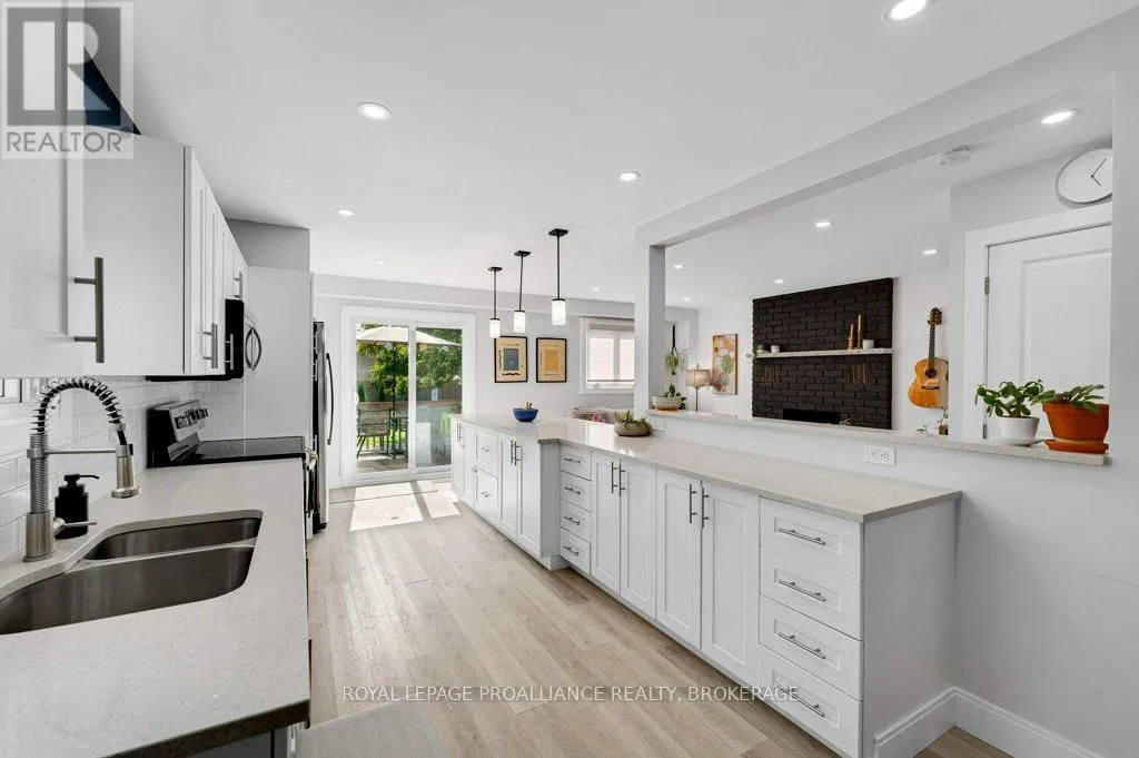 Cross Streets: Sir John A MacDonald Blvd & John Counter Blvd. ** Directions: West from Aberfoyle. A cheerily updated 3 bedroom detached home in sought-after Strathcona Park! This home sits on a deep corner lot at the entrance of a quiet cul-de sac and offers a single garage with ample parking in the double wide drive. The covered porch leads to an open concept main level with a bright kitchen with an oversized island and 4 appliances included. This is a great area to gather for a meal, or relax in the sunny, south facing living room, overlooking the rear deck and patio. The large yard has a mature cedar hedge for privacy, lush perennial gardens and is partially fenced. The lower level is the perfect retreat - the rec room has a thoughtful built-in and the den is tucked away, perfect for a gym or office. Both the main and lower levels have handy powder rooms. On the upper level is a gracious primary with ensuite, and two additional bedrooms with their own four-piece bath. This home has everything you need, including forced air heat and AC, ample parking and a kitchen you'll be thrilled to cook in, not to mention that this established neighbourhood has many lovely parks very close by and is located in the center of the city, close to all amenities! (id:27476)