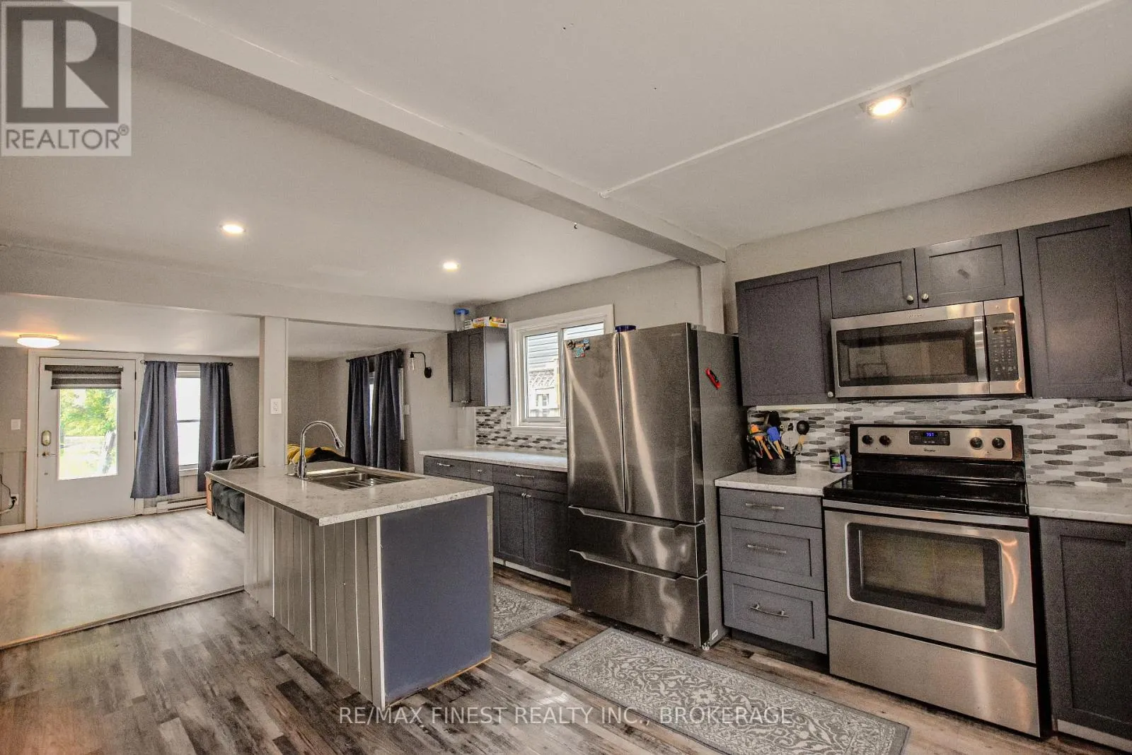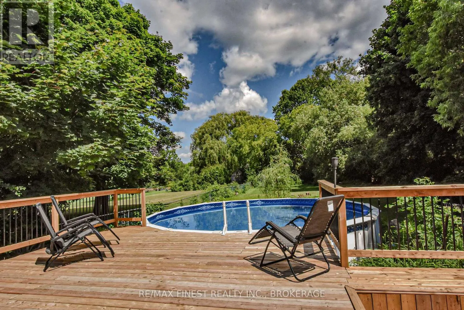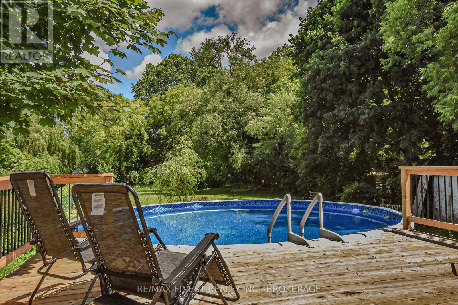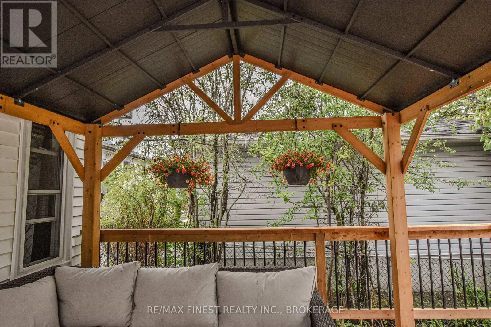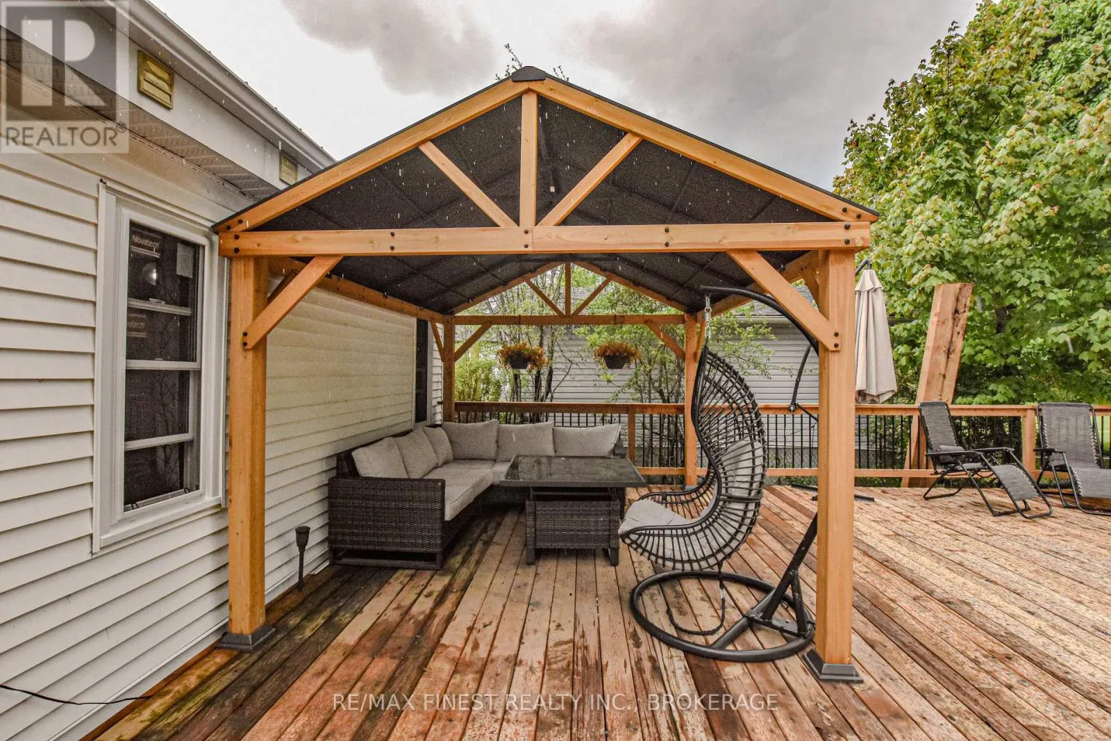 Cross Streets: PORTSMOUTH AVENUE. ** Directions: PORTSMOUTH AVENUE TO PHILLIPS STREET. A rare find on a quiet city street. All on one level 1650 sf bungalow on a quiet cul de sac with massive 208 ft backyard. Mostly very good sized rooms in this home provide an open concept and a nice flow. The focal point, newly designed kitchen is the Center piece of the home overlooking the large dining area on the one side and the large main floor family room on the other side. All appliances included and the convenient main floor laundry is easily accessible. For children and pets the patio doors to the backyard provide maximum enjoyment as you will love spending time in your yard with a party sized newly built deck and gazebo leading to an above ground pool and a garden area that extends almost 200 feet deep. A detached garage/workshop area is also included for your hobbies or extra storage. The ensuite bathroom, also newly designed with a good sized walk in closet makes the master bedroom its own quiet sanctuary area. 2 other bedrooms and an office area share a 3 piece bathroom. New metal roof, mostly new windows, flooring, paint and decoration make this home move in ready. (id:27476)