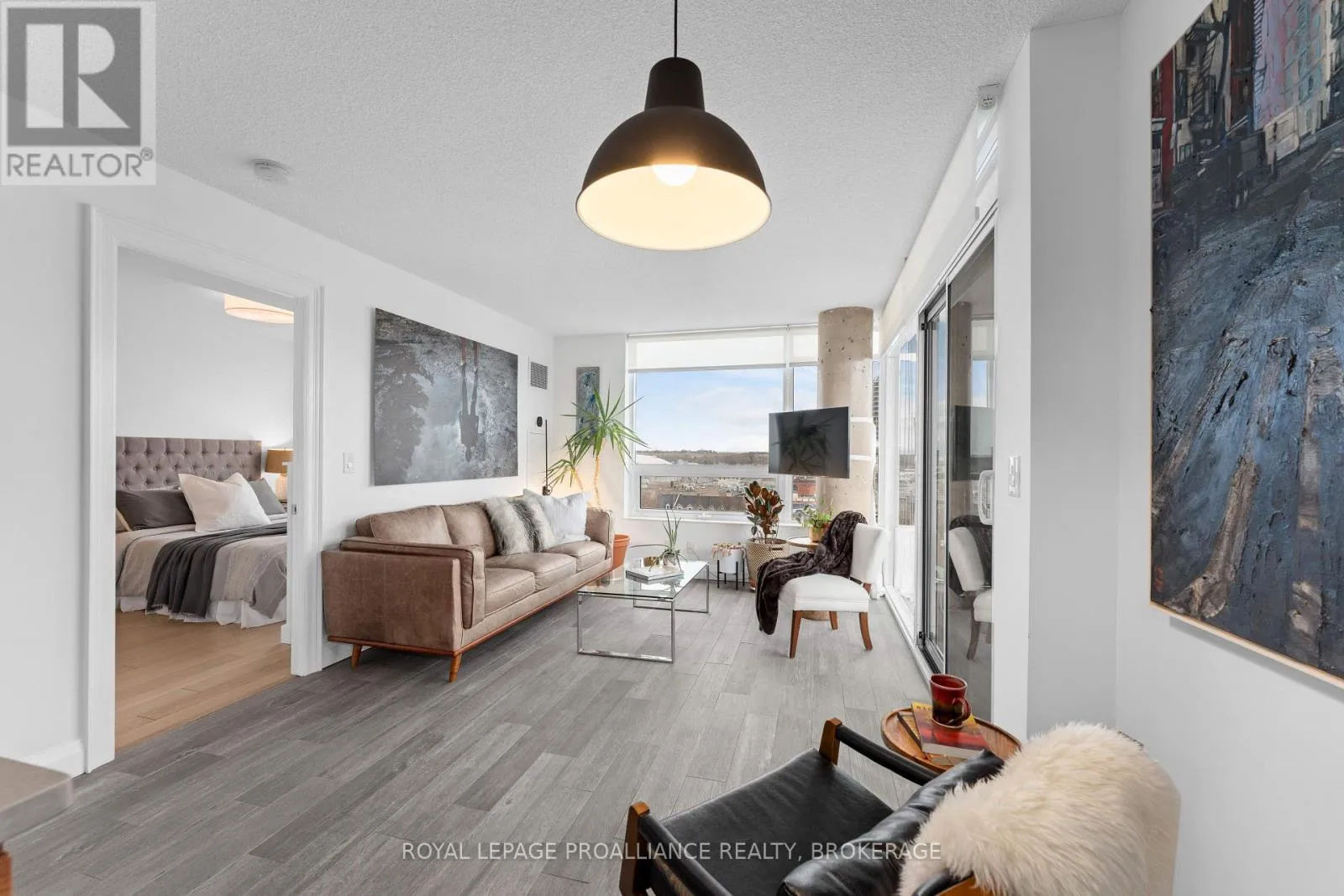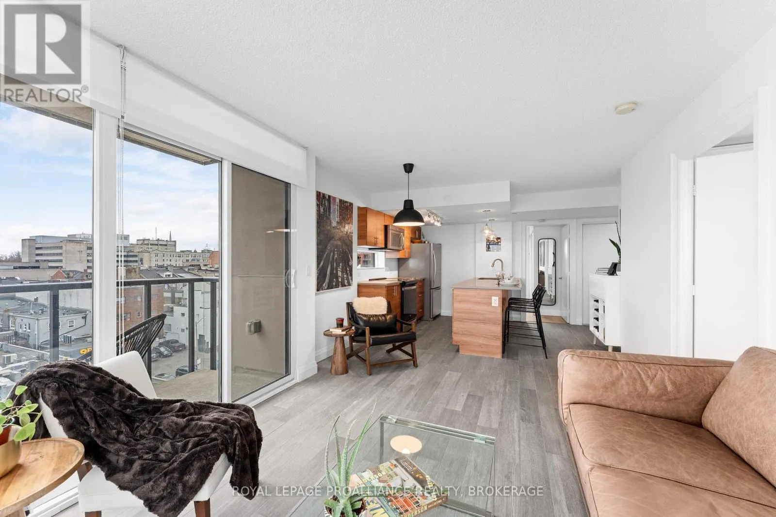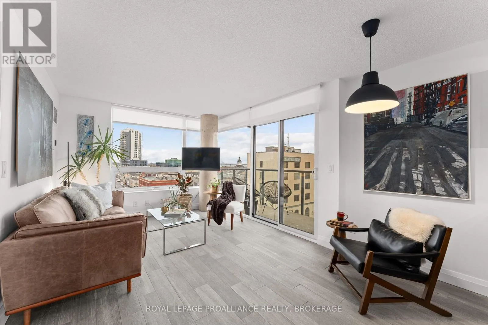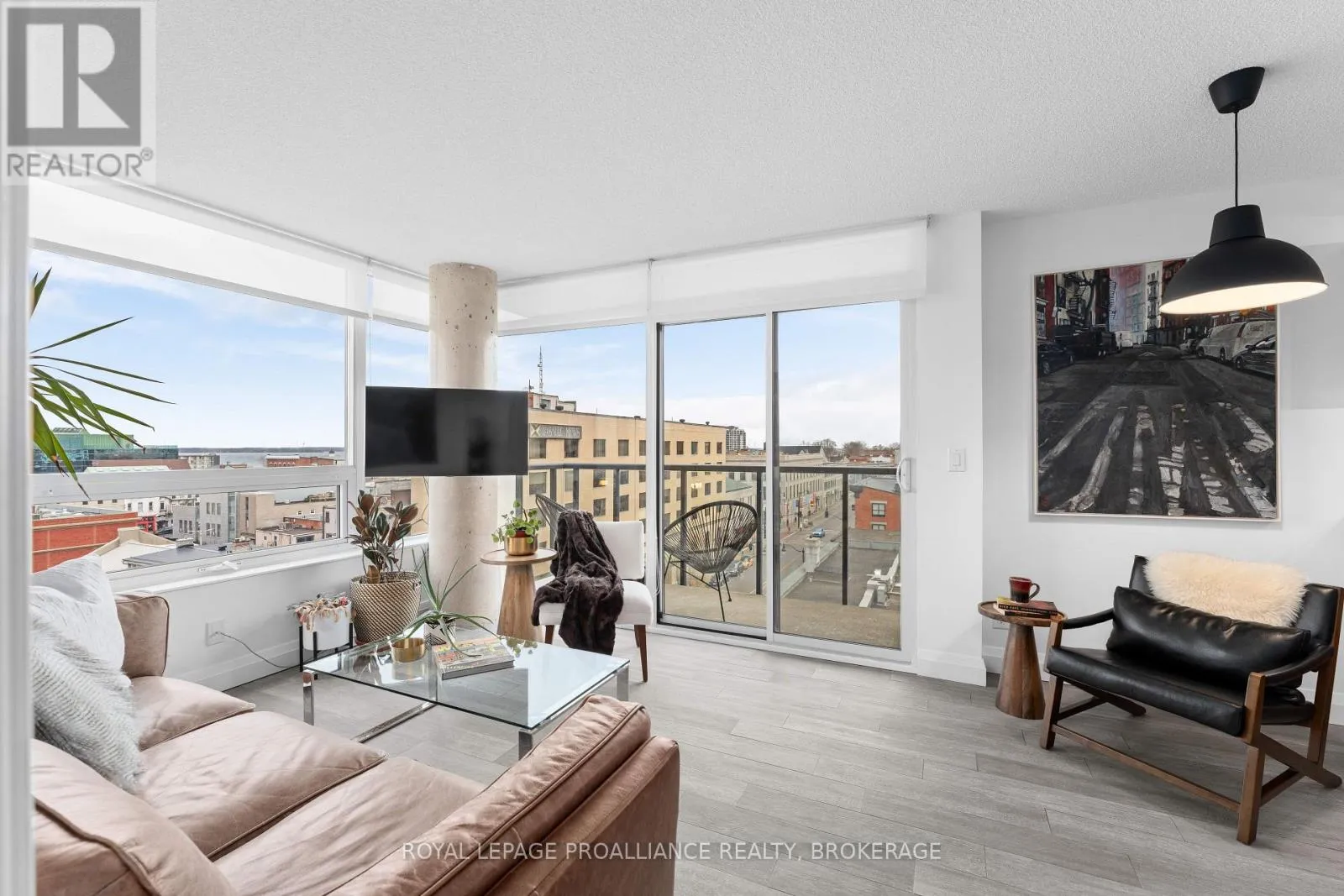 Cross Streets: Queen and Bagot. ** Directions: Queen Street to Bagot Street. Rare, double corner unit, with windows facing East, South and West; this 2 bedroom, 2 bathroom condo could not be brighter; offering panoramic views of downtown Kingston, including city hall, RMC, and the windmills on Wolfe Island! This unit is full of updates, floors are ceramic tile in main areas, and engineered hardwood in the bedrooms. The entryway includes a custom bookcase, and there is a large entry closet. The kitchen has quartz counters, an extra long island and a unique backsplash window. The layout has both bedrooms and baths on opposite sides of the unit, adding privacy. There is upgraded trim throughout and all window coverings are Hunter Douglas. Recent updates include the ensuite bath (2025)and exposing the concrete ceiling in the second bedroom. This condo has more than just great style on offer, there is also a deeded storage unit on the main level, as well as a deeded oversize parking space next to the elevator. Looking for the perfect downtown condo for a May move in? Look no further! (id:27476)