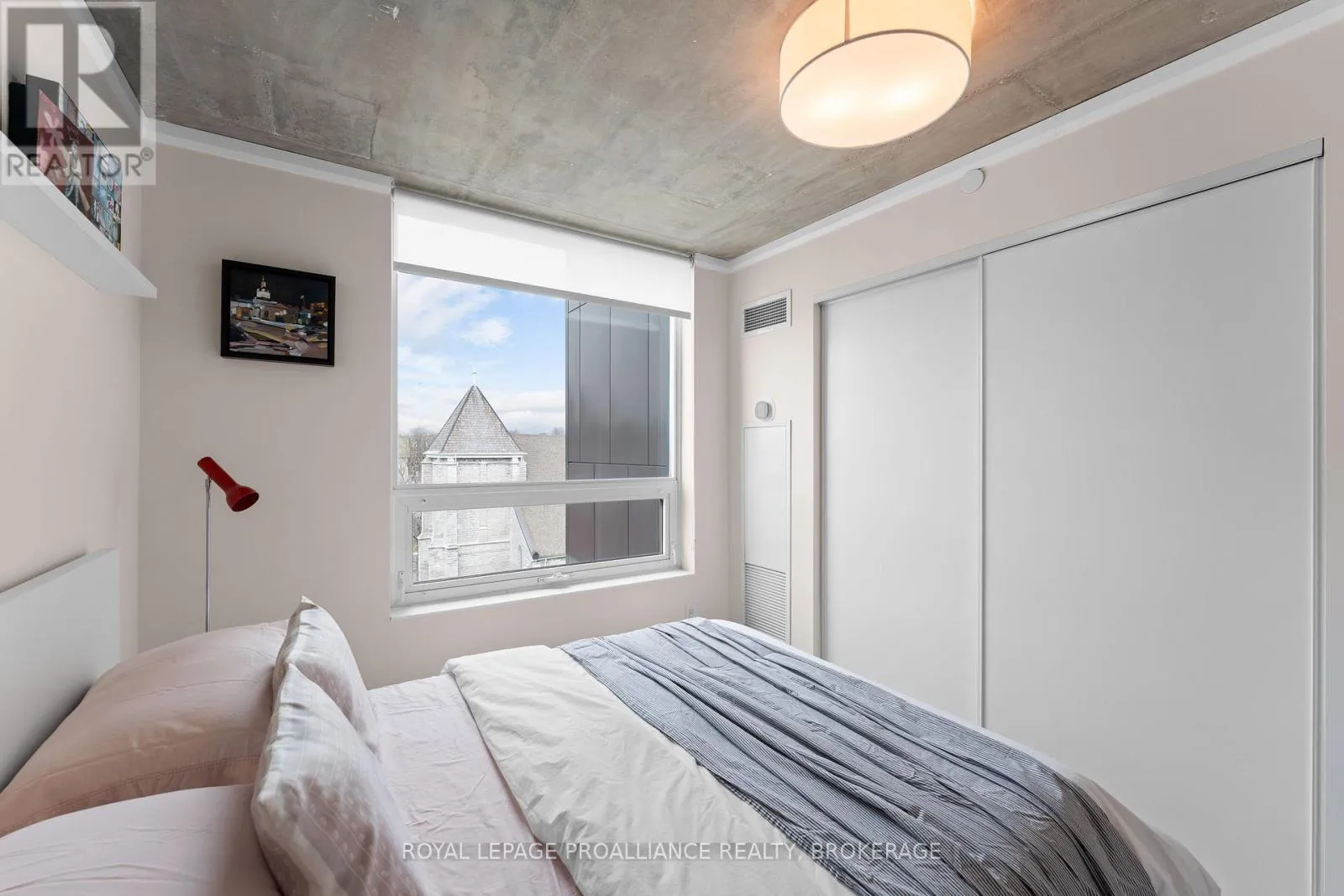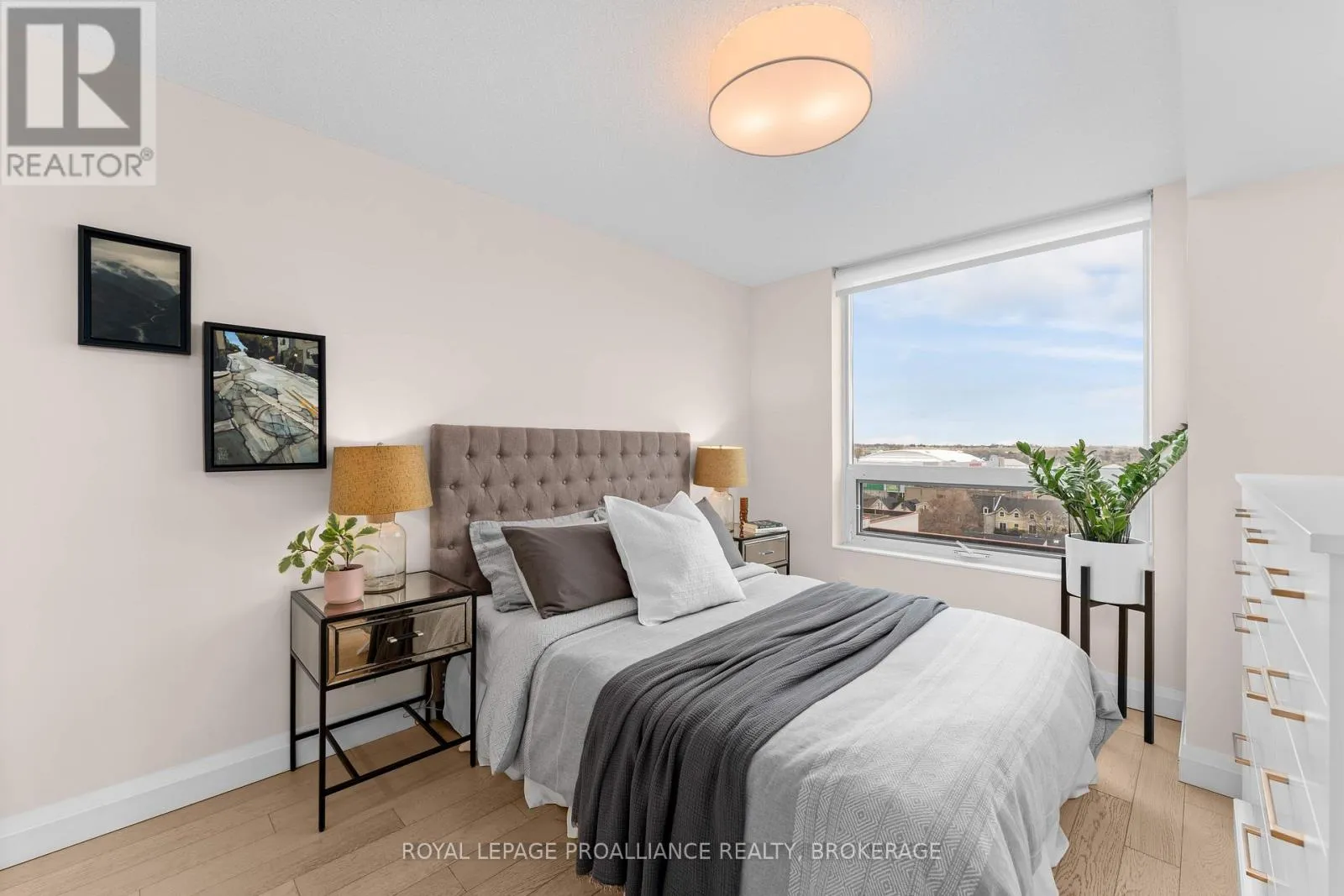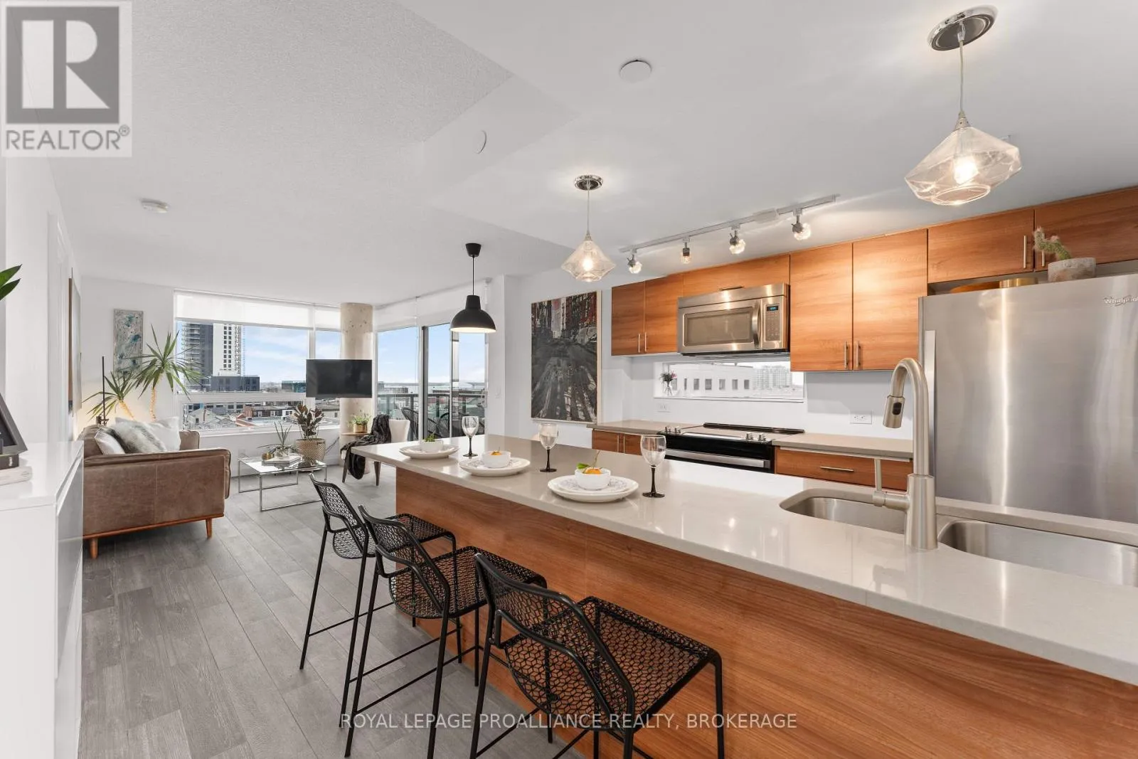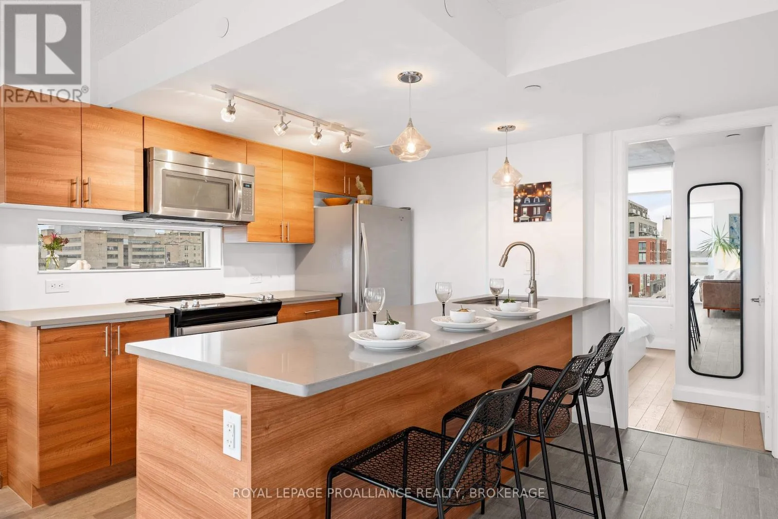 Cross Streets: Queen and Bagot. ** Directions: Queen Street to Bagot Street. Rare, double corner unit, with windows facing East, South and West; this 2 bedroom, 2 bathroom condo could not be brighter; offering panoramic views of downtown Kingston, including city hall, RMC, and the windmills on Wolfe Island! This unit is full of updates, floors are ceramic tile in main areas, and engineered hardwood in the bedrooms. The entryway includes a custom bookcase, and there is a large entry closet. The kitchen has quartz counters, an extra long island and a unique backsplash window. The layout has both bedrooms and baths on opposite sides of the unit, adding privacy. There is upgraded trim throughout and all window coverings are Hunter Douglas. Recent updates include the ensuite bath (2025)and exposing the concrete ceiling in the second bedroom. This condo has more than just great style on offer, there is also a deeded storage unit on the main level, as well as a deeded oversize parking space next to the elevator. Looking for the perfect downtown condo for a May move in? Look no further! (id:27476)