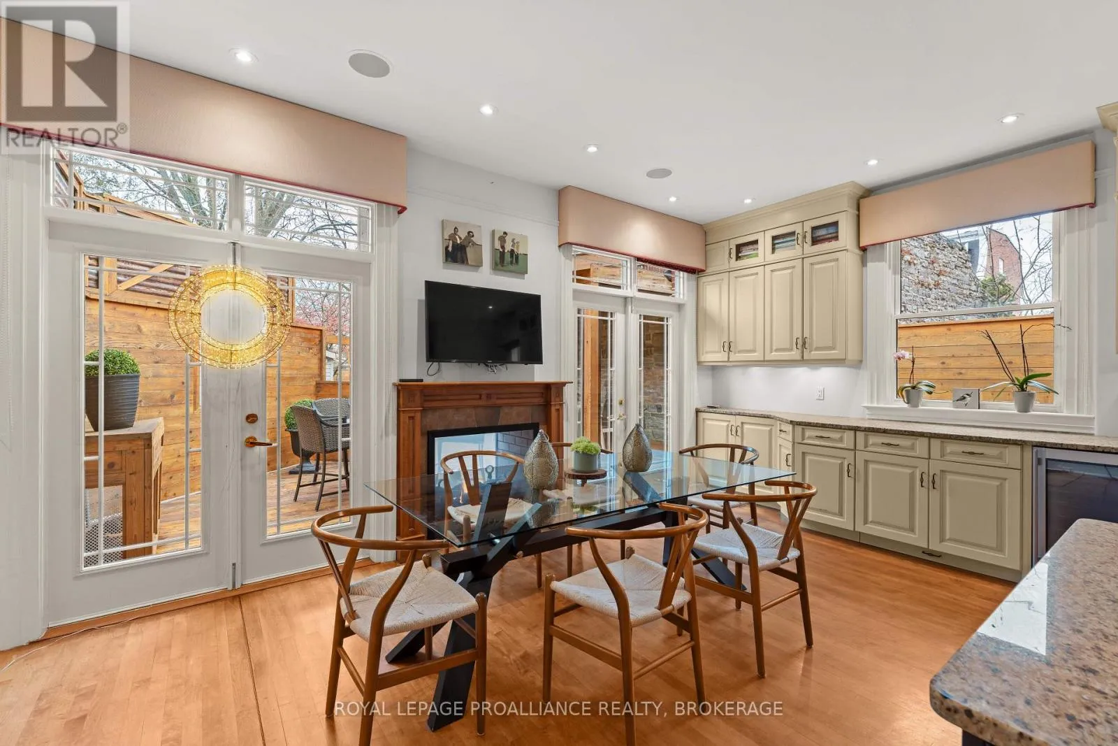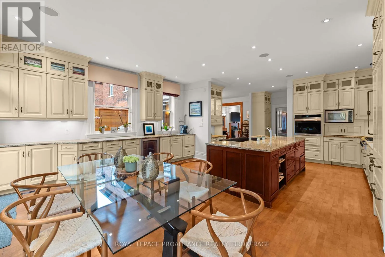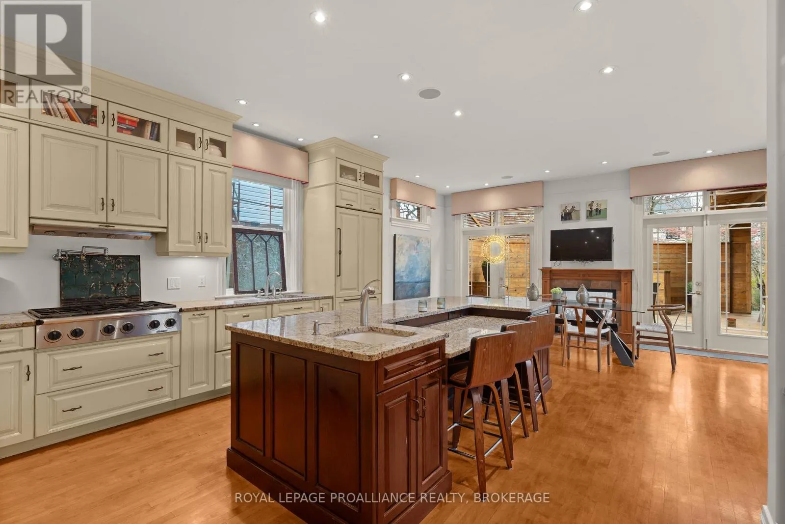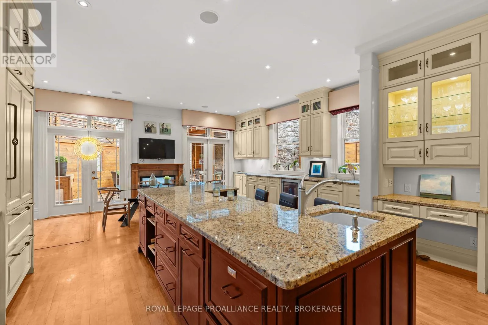Cross Streets: West Street and Wellington Street. ** Directions: Between West Street and Wellington Street. A truly unique home offering the perfect balance of old-world character and modern comfort, ideally located just steps from downtown Kingston. Enjoy soaring ceilings, beautiful hardwood floors, and custom details throughout. The stunning kitchen is designed for entertaining, featuring a gas stove, three dishwashers, a separate beverage refrigerator, and warming drawers-perfect for hosting gatherings of any size. A dramatic two-sided fireplace adds warmth both indoors and out, opening to a private backyard retreat with outdoor screens that are remote controlled. The home features four bedrooms, four bathrooms, a detached garage, and a dry, unfinished basement offering excellent storage or future consideration. Recent updates include a new boiler and hot water tank (2026), an outdoor elevator, and many additional improvements that enhance comfort and convenience. This exceptional property is ideal for buyers seeking something truly special in a prime downtown location. (id:27476)