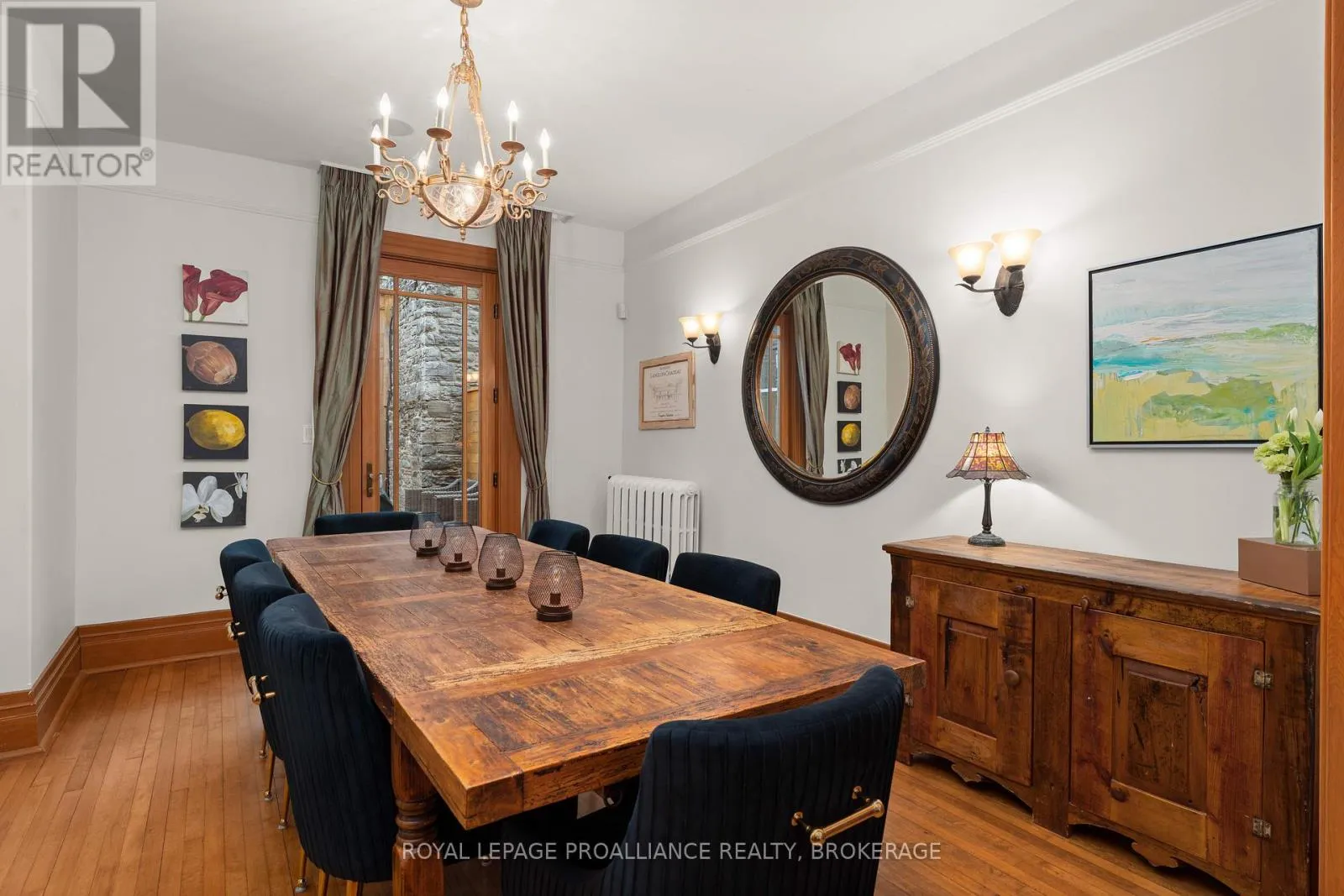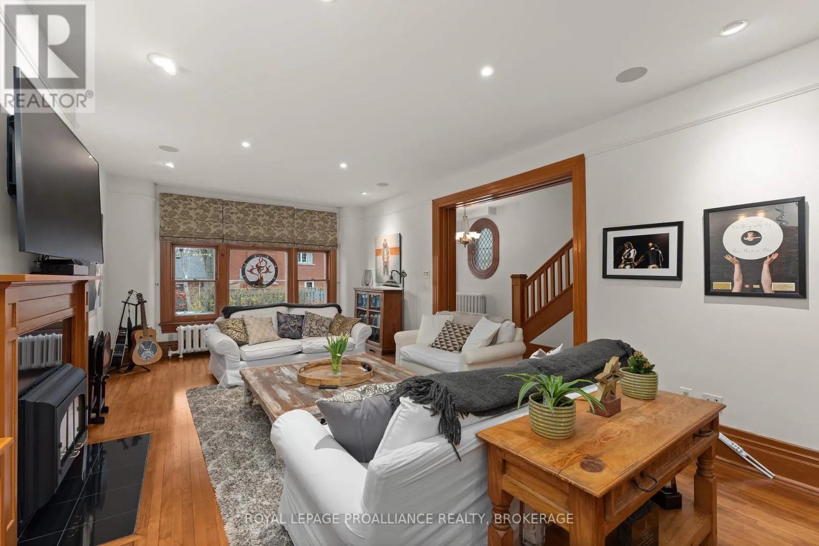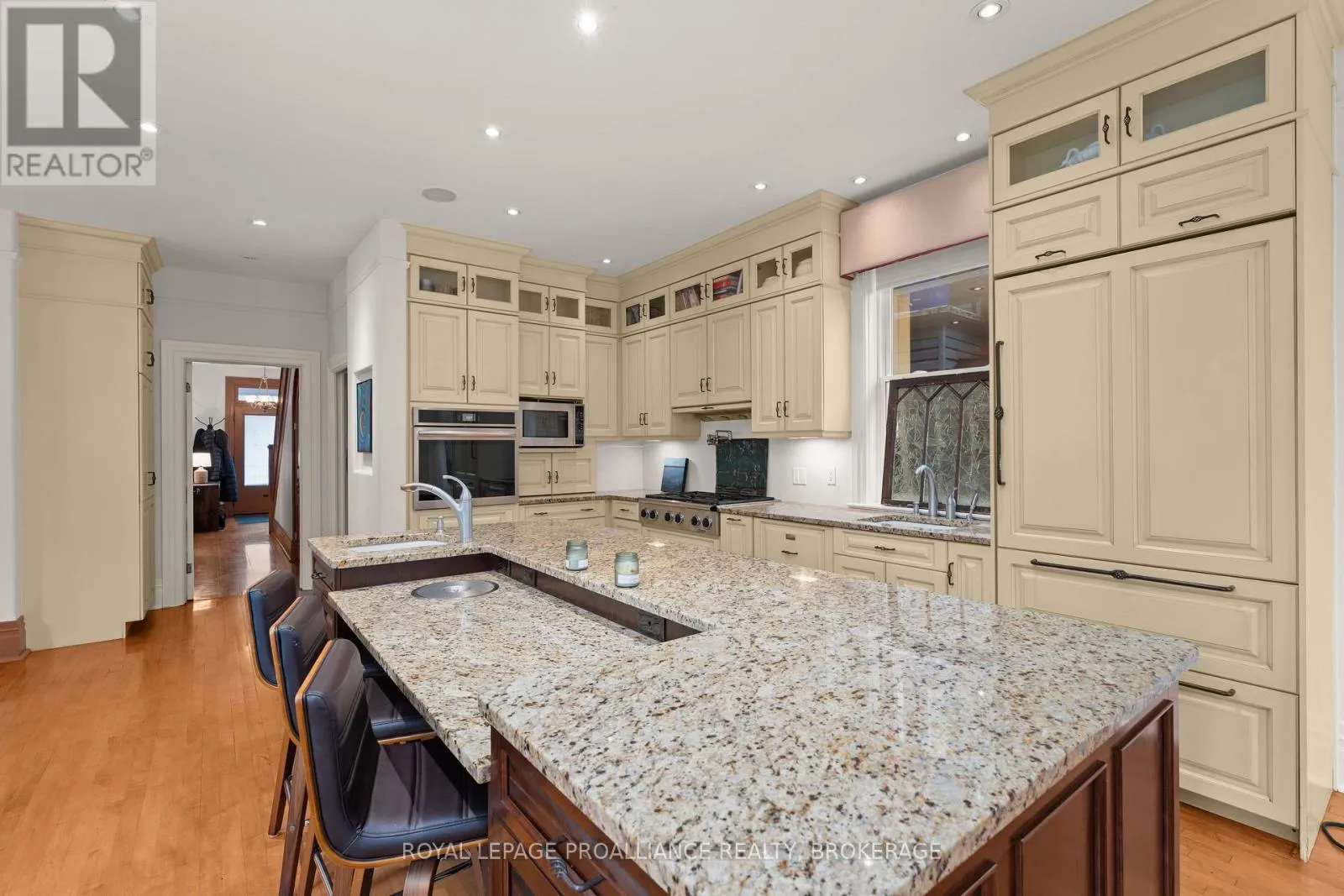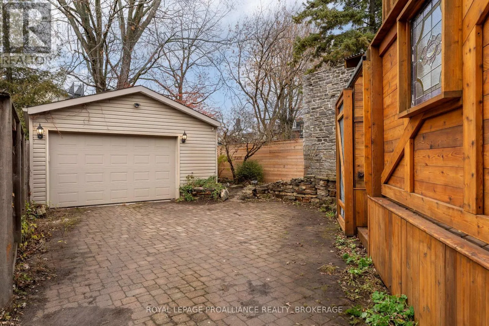 Cross Streets: West Street and Wellington Street. ** Directions: Between West Street and Wellington Street. A truly unique home offering the perfect balance of old-world character and modern comfort, ideally located just steps from downtown Kingston. Enjoy soaring ceilings, beautiful hardwood floors, and custom details throughout. The stunning kitchen is designed for entertaining, featuring a gas stove, three dishwashers, a separate beverage refrigerator, and warming drawers-perfect for hosting gatherings of any size. A dramatic two-sided fireplace adds warmth both indoors and out, opening to a private backyard retreat with outdoor screens that are remote controlled. The home features four bedrooms, four bathrooms, a detached garage, and a dry, unfinished basement offering excellent storage or future consideration. Recent updates include a new boiler and hot water tank (2026), an outdoor elevator, and many additional improvements that enhance comfort and convenience. This exceptional property is ideal for buyers seeking something truly special in a prime downtown location. (id:27476)