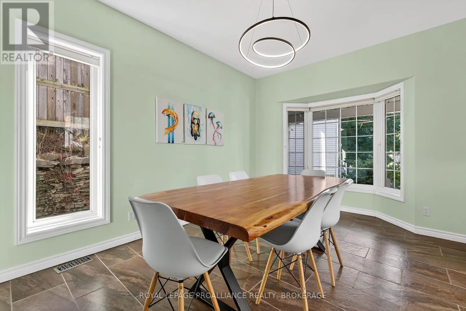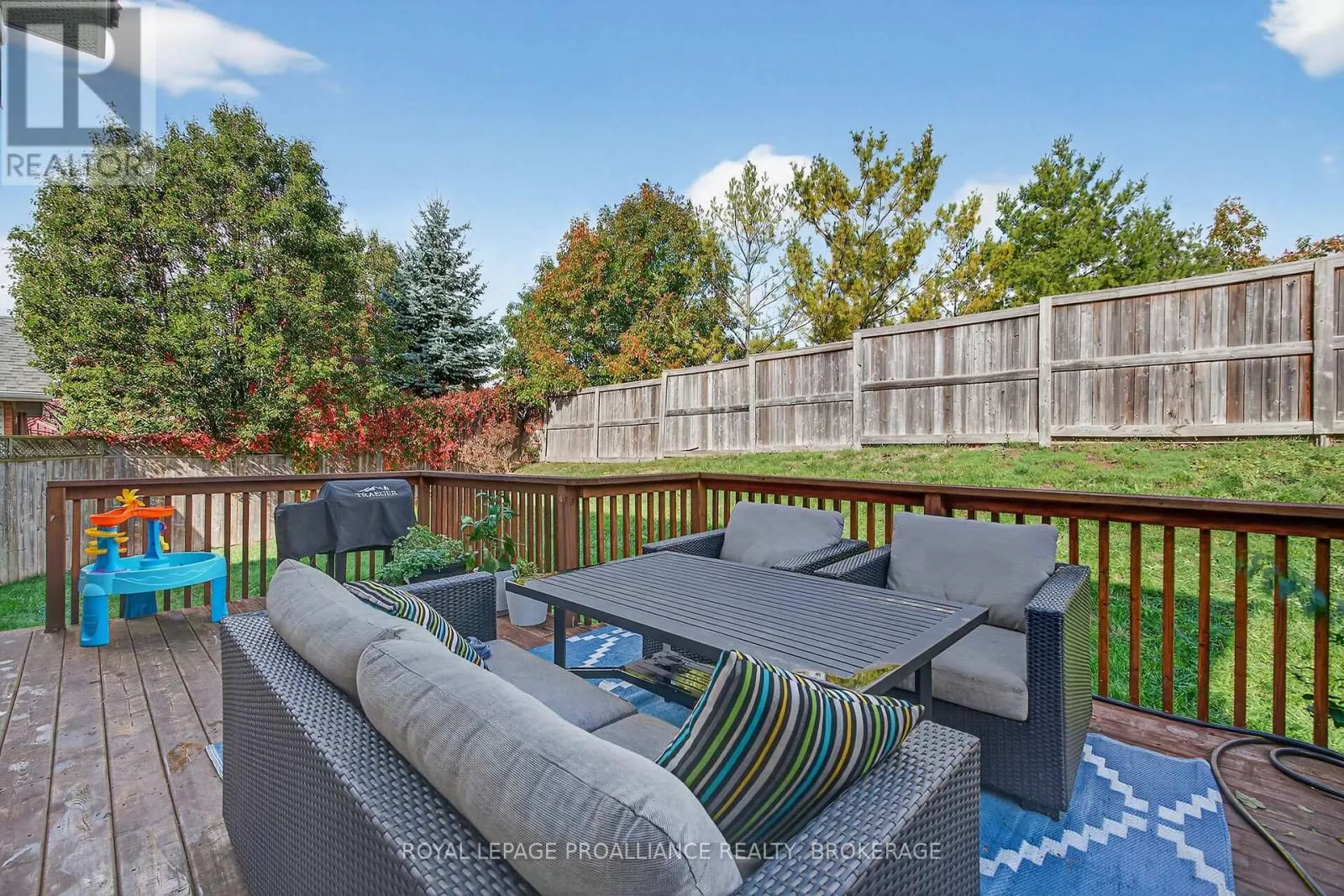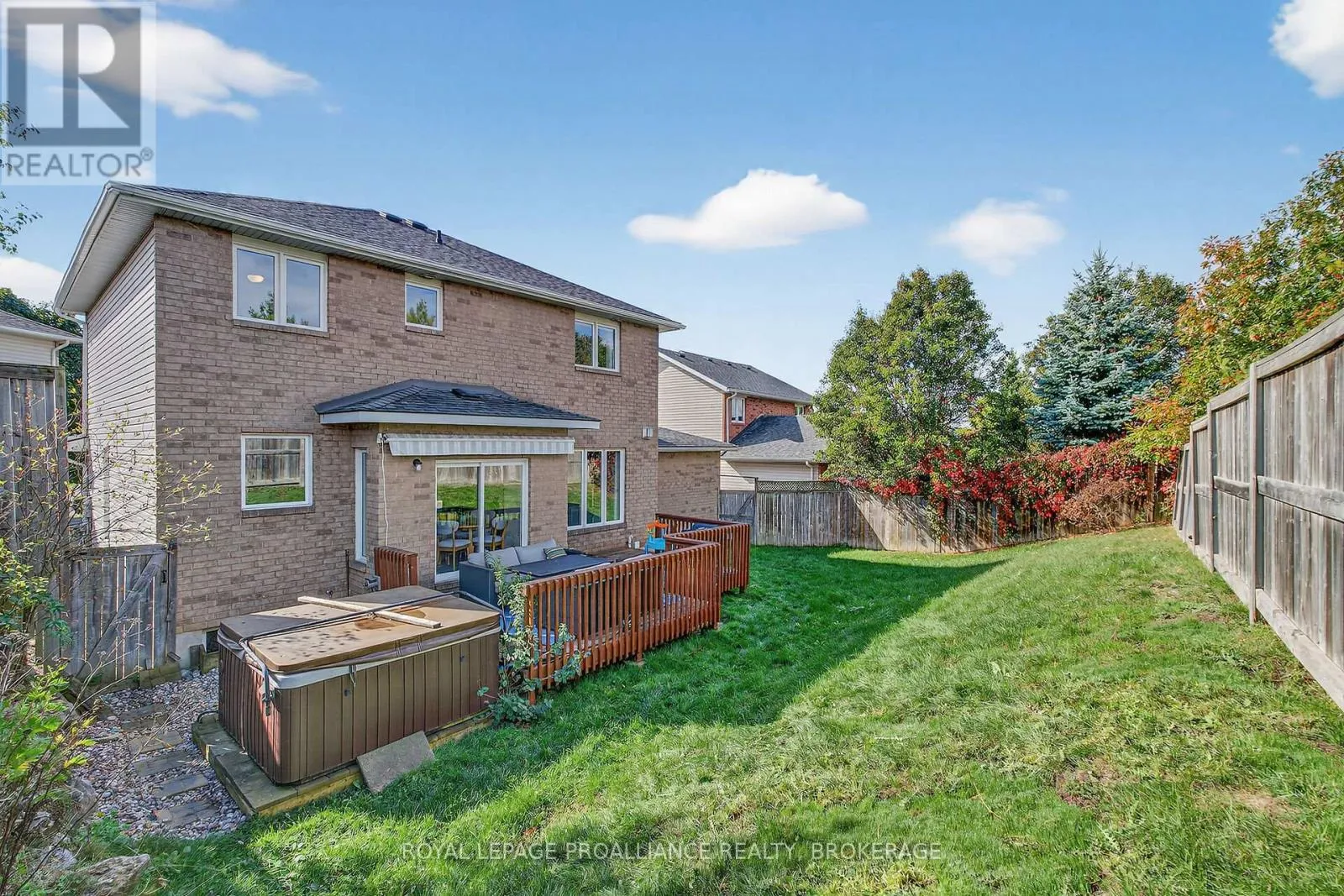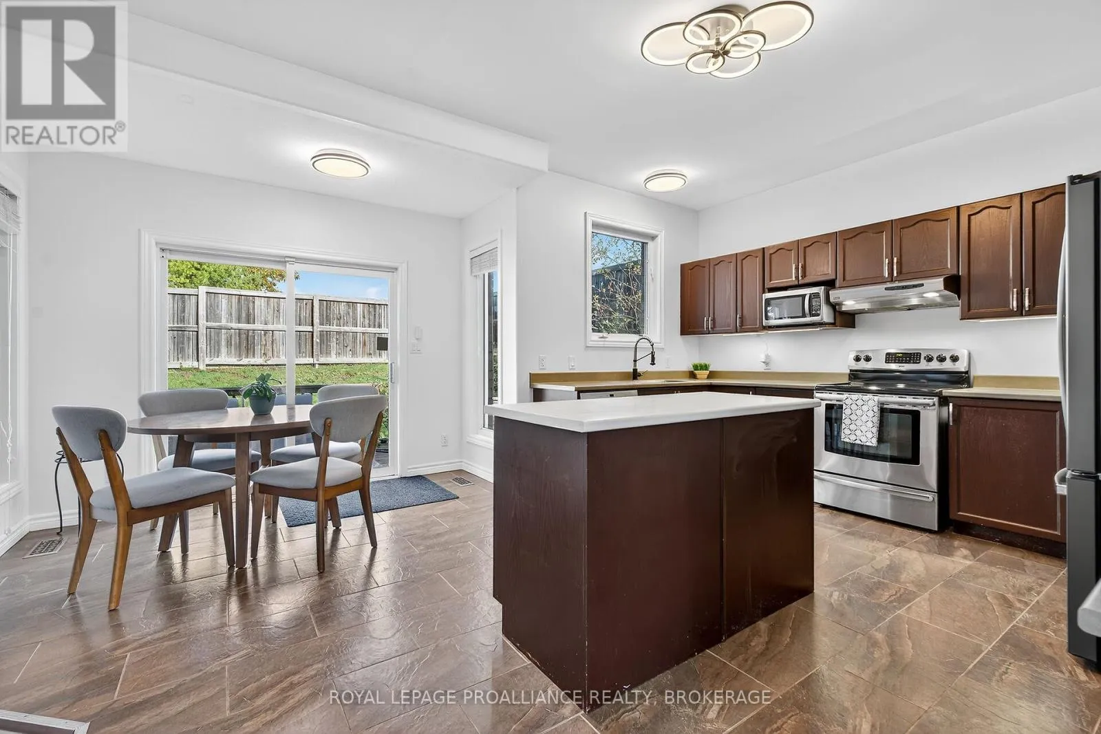 Cross Streets: Coverdale Dr. & Stoneridge Dr. ** Directions: Bath Rd. to Coverdale Dr. to Geology Trail. Welcome to your dream home! This beautiful and spacious contemporary residence is nestled on a quiet cul-de-sac, just a short walk from the lake, parks, and shopping. Perfectly designed for family living, this home offers a functional and stylish floor plan with modern upgrades throughout. Step inside to a bright and welcoming entrance with soaring 9-foot ceilings. The main level features a beautifully updated kitchen with an open-concept eat-in breakfast nook that flows seamlessly into the large living room, complete with a cozy gas fireplace. Patio doors lead out to a generous back deck - ideal for outdoor entertaining. A separate dining room (or optional family room), main-level laundry, and a convenient two-piece bathroom complete the main floor. Upstairs, the spacious primary bedroom boasts a luxurious four-piece ensuite. Two additional bedrooms share a well-appointed four-piece bathroom. New engineered hardwood flooring was installed throughout the upper level in May 2024, adding warmth and elegance. The fully finished, newly renovated lower level offers incredible versatility with a large recreation room, kitchenette, bedroom, brand-new bathroom, and ample storage - perfect for extended family, guests, or a private retreat. Enjoy the fully landscaped backyard with no rear neighbours, offering peace, privacy, and the perfect space for relaxation. Dont miss the opportunity to make this stunning home yours! (id:27476)