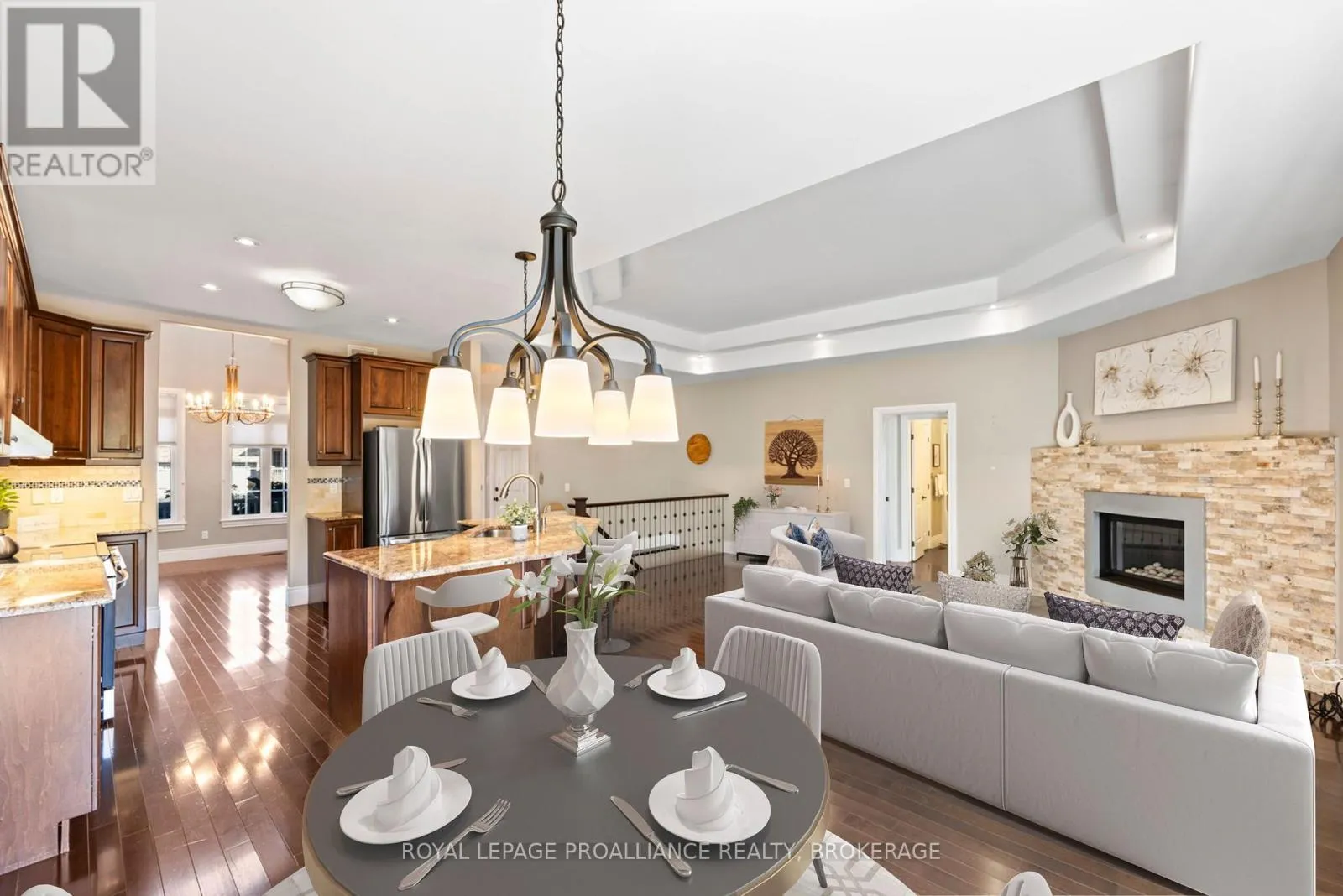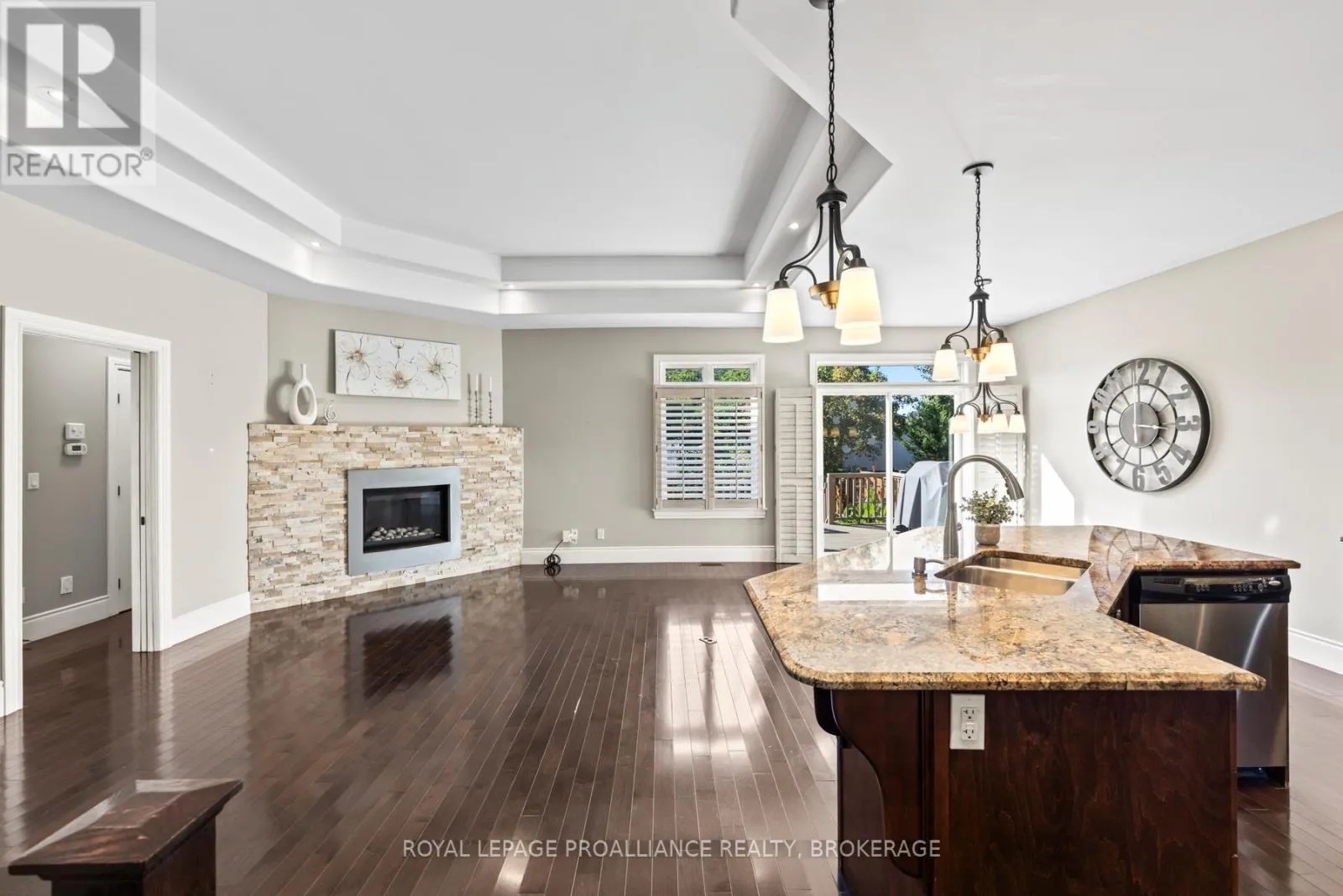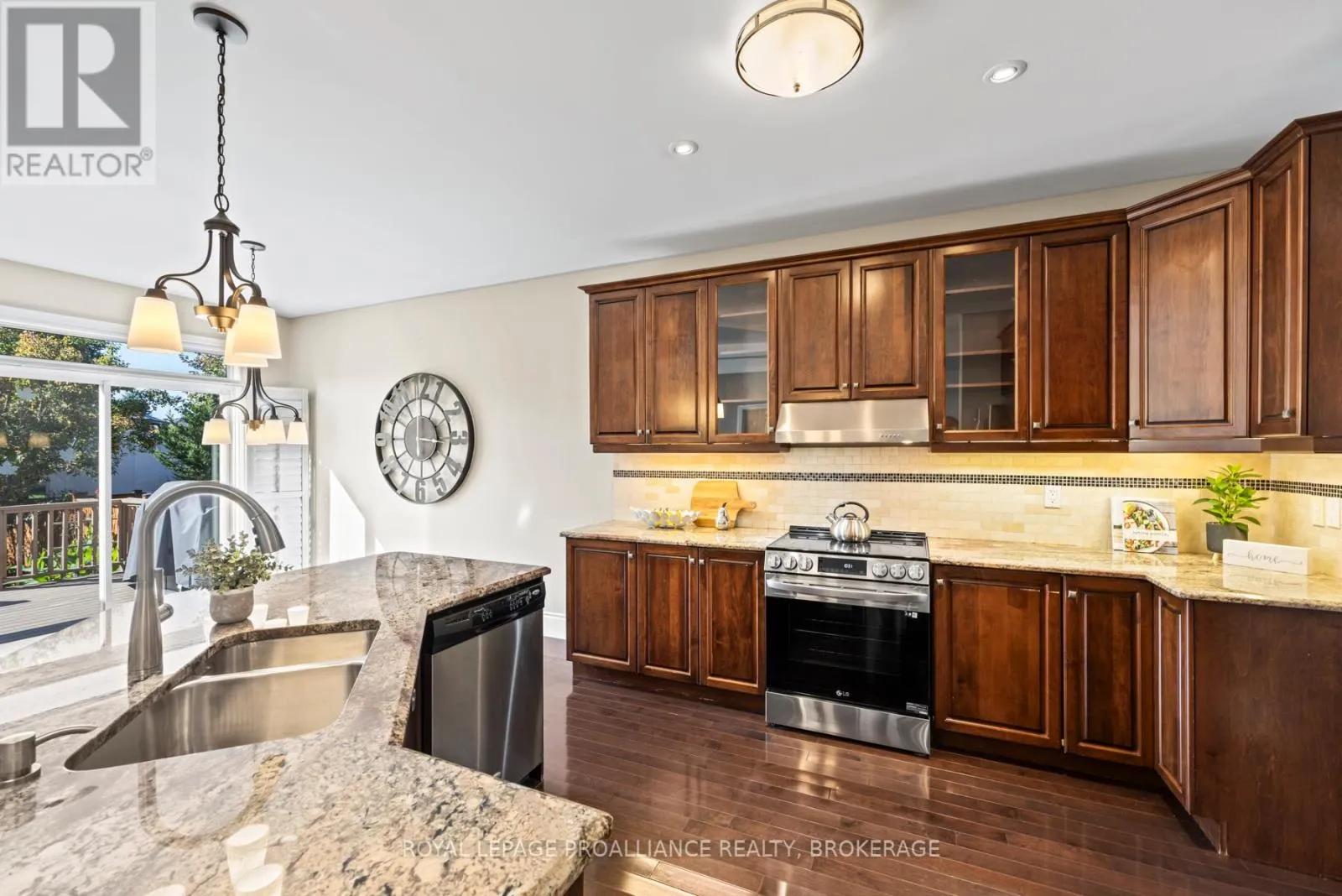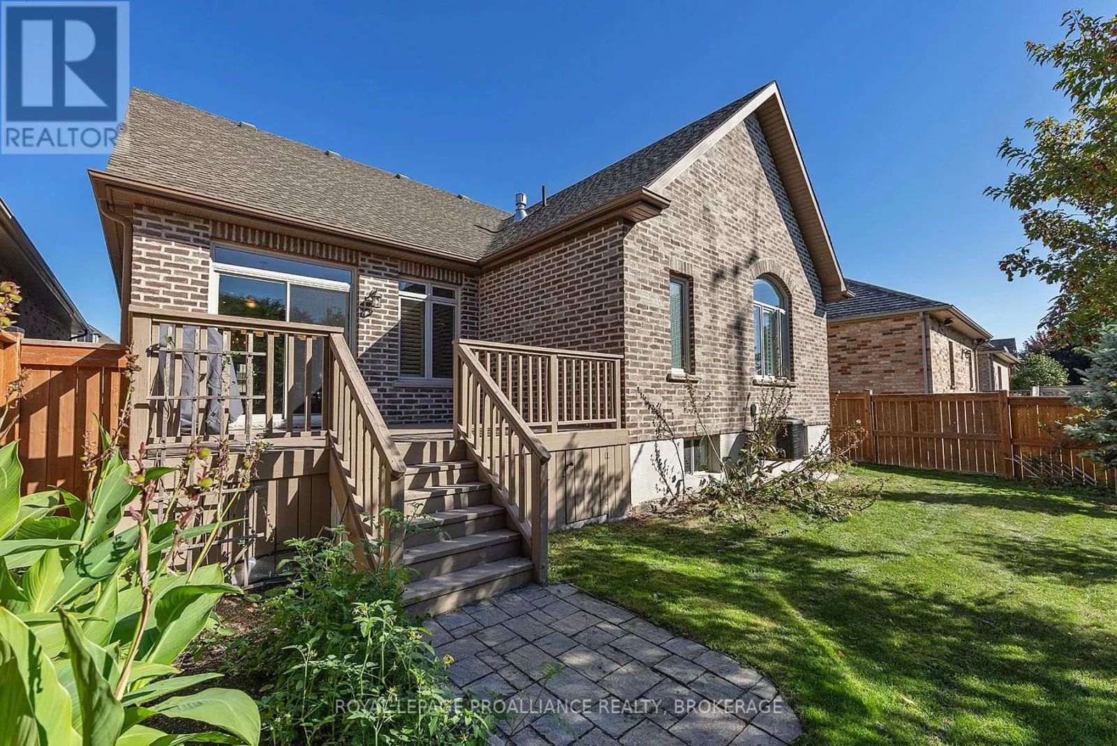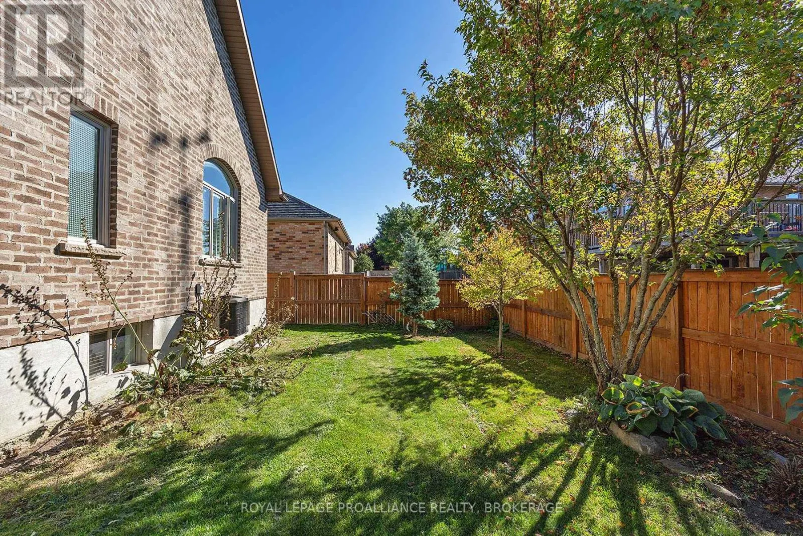Cross Streets: Atkinson & Augusta. ** Directions: Centennial to Atkinson. Nestled on a beautifully landscaped lot in the coveted Lyndenwood neighbourhood, 1213Atkinson Street blends timeless curb appeal with custom craftsmanship and thoughtful modern updates. This Haynes-built home is a rare gem-designed to impress while delivering everyday comfort. From the all-brick, stone, and stucco exterior to the stunning new stone walkway and lush front gardens, this home makes a striking first impression. Step inside to soaring ceilings, elegant pillars, and rich hardwood floors. A formal dining room with vaulted ceilings serves as an elegant lounge-a perfect space to unwind with guests, enjoy evening cocktails, or curl up with a good book. This room's versatility allows it to easily convert to a formal dining function or continue as a cozy yet upscale entertaining area. The heart of the home is the spacious open-concept kitchen, living, and dining area. Granite countertops, warm custom cabinetry, and a large island invite gathering, while the gas fireplace and coffered ceilings add charm and character. Walk out to the private, fenced backyard where the lilac blooms and the carefully curated landscaping frame the natural gas BBQ area and deck-ideal for summer evenings at home. The main level offers a serene primary bedroom with a walk-in closet and convenient ensuite, plus a second bedroom and full bath; these are separated from the living room by a custom pocket door for added privacy. Main-floor laundry adds everyday convenience. Downstairs, the fully finished lower level is its own retreat-featuring a massive rec room, two additional bedrooms, a workout area, and another full bathroom, perfect for guests or teens. With approximately 2,500 sqft of finished living space, recent upgrades include designer lighting and enhanced landscaping in both front and back yards. This home offers upscale comfort in one of Kingston's most central and convenient communities. (id:27476)