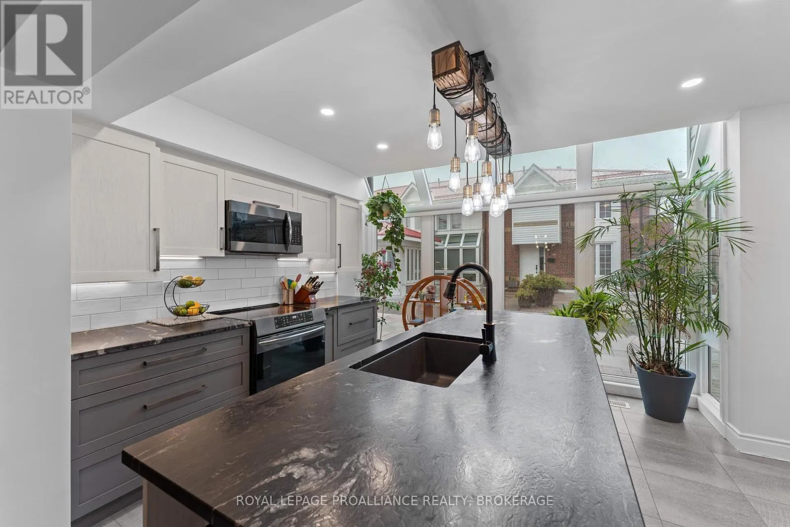 King Street to Place D'Armes Beautifully updated multi-level townhome in Kingston's sought-after Frontenac Village, nestled in the heart of historic downtown. This exceptional and modernized residence is one of the largest in the community, offering over 2,000 sq. ft. of luxurious living space spanning across seven levels. Meticulously maintained and thoughtfully designed, this three-bedroom, three-bathroom residence features numerous high-quality updates, including a stunning open-concept custom kitchen with premium cabinetry and leathered granite counters, a serene primary suite with a loft-style renovated bath and private sitting or fitness area, and a rare three parking spaces. Offering two exceptional outdoor living areas - a front interlocking patio off the sun-filled kitchen and a private rear terrace from the lower-level walkout - this home is perfect for entertaining guests or simply enjoying the best of both morning and afternoon light. Built in 1985, Frontenac Village offers residents a rare and unique downtown lifestyle with its modern construction and impressive amenities, including outdoor pool and patio, exercise room and sauna, library, meeting room, and secure underground parking, all within a beautifully landscaped setting. Enjoy an unparalleled location where the Rideau River and Lake Ontario meet the St. Lawrence, just steps from Kingston's finest dining, shops, live entertainment, Kingston Marina and Confederation Basin, and Queen's University. (id:27476)