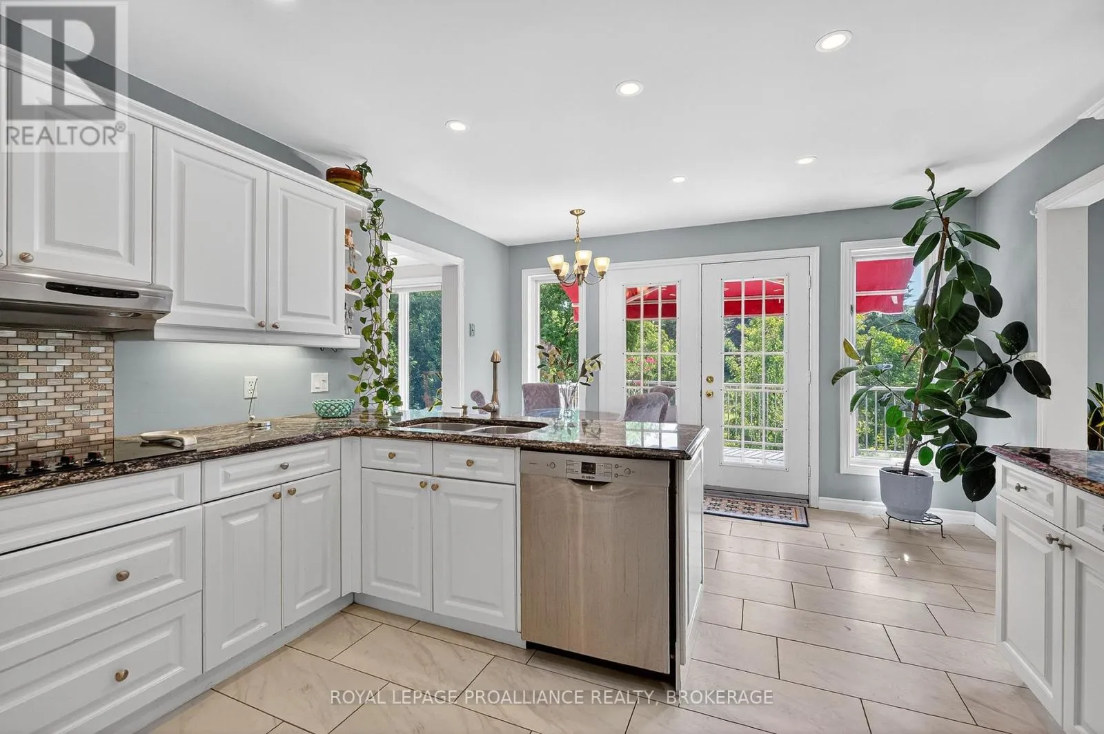 Cross Streets: Caitlin Crescent off Lancaster Drive. ** Directions: Princess Street to Mona Drive to Lancaster Drive to Caitlin Crescent (#1098). Beautifully updated 2 storey family home on a serene 0.5-acre lot backing onto a tranquil ravine. Offering nearly 3,500 sq. ft. of well-designed living space, this home features 5 spacious bedrooms and 3 updated baths. The bright eat in kitchen includes granite countertops, tile flooring, and large windows overlooking the patio and lush backyard. A warm main floor living/sitting room with a gas fireplace complements the generous dining area, ideal for gatherings. The walkout lower level provides direct backyard access and features a charming wood burning stove, fresh paint, new flooring, and a renovated bathroom with new shower and granite topped vanity. A dedicated wine storage and cold room add excellent utility for entertainers. A 2-car attached garage, extensive updates, and the peaceful ravine backdrop create a rare combination of privacy, space, and modern comfort-an ideal retreat close to all amenities. (id:27476)