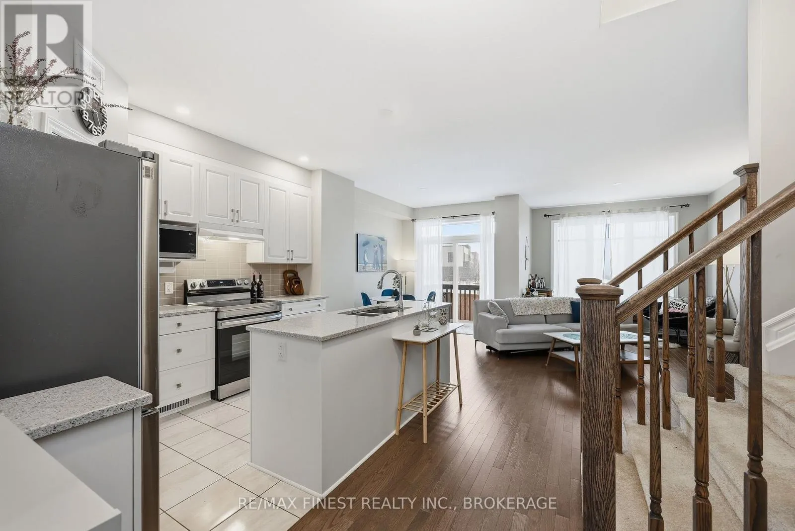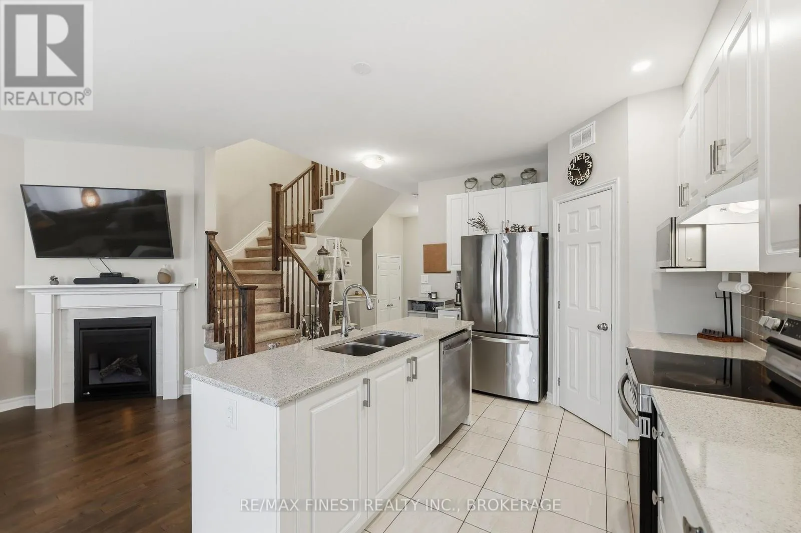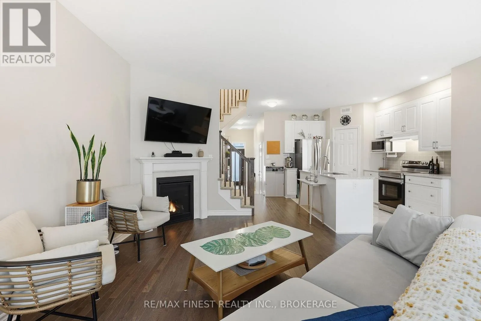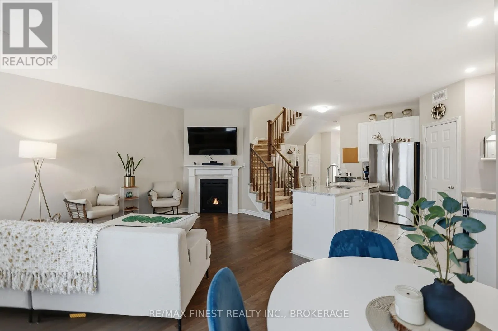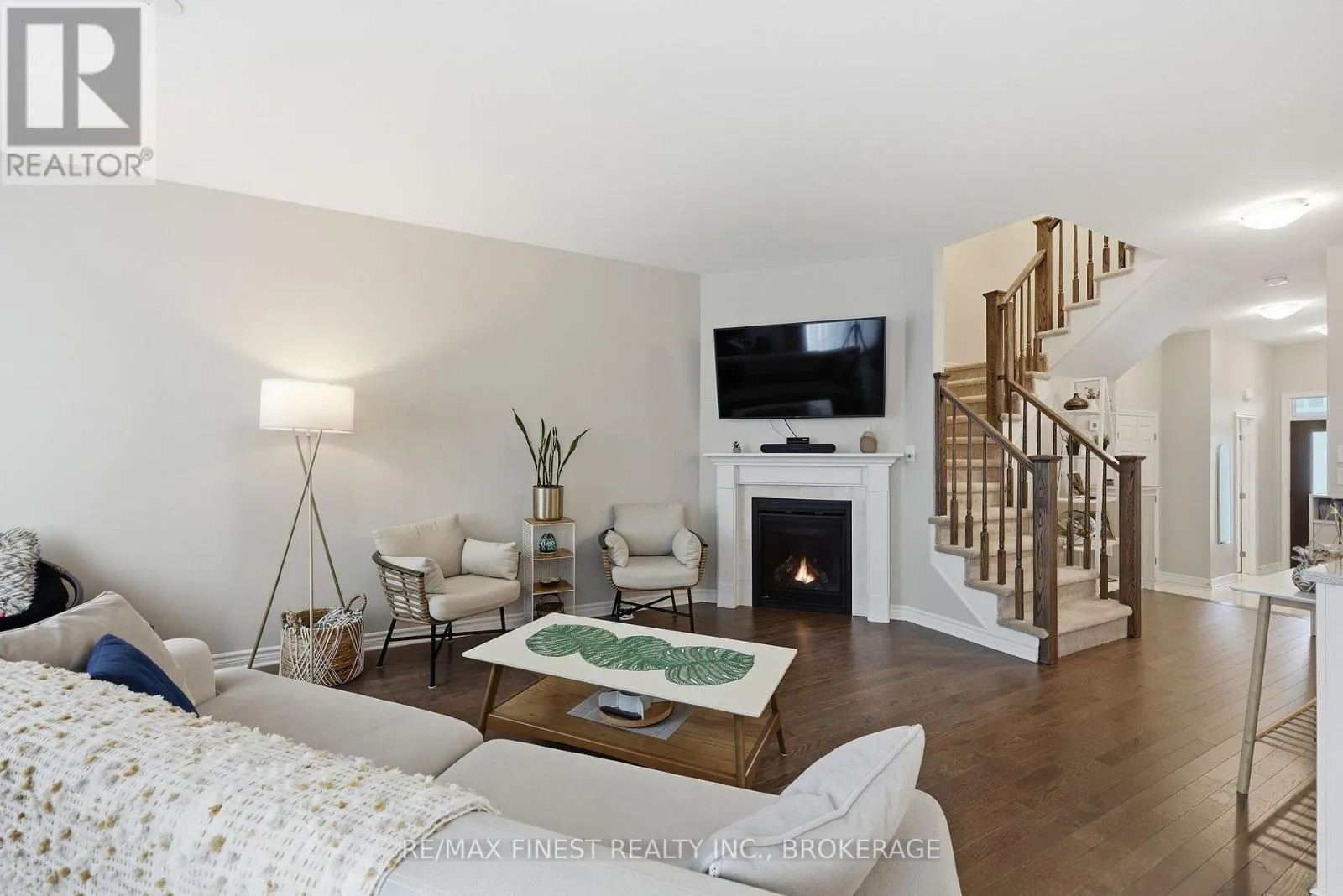 Cross Streets: Cataraqui Woods Drive. ** Directions: Cataraqui Woods Drive to Tenley Drive. Welcome to this beautifully appointed 3-bedroom, 3-bathroom townhouse located in Kingston's west end. Designed with modern living in mind, this home offers high ceilings and an open-concept layout that's both spacious and inviting. The kitchen features quartz countertops, stainless steel appliances, and a stylish tile backsplash - perfect for everyday cooking or entertaining guests. Hardwood flooring spans the main level, while ceramic tile in all wet areas adds durability and easy maintenance. Relax by the cozy fireplace in the living room, framed by large transom windows and a patio door that flood the space with natural light. Upstairs, you'll find three comfortable bedrooms, including the primary bedroom with 4-piece ensuite, plus you'll enjoy the convenience of upper-level laundry. The finished rec room in the lower level provides added living space ideal for a family room, home gym, or office. Located close to schools, walking paths, west-end shops, and everyday amenities, this home combines comfort, style, and an excellent location. (id:27476)