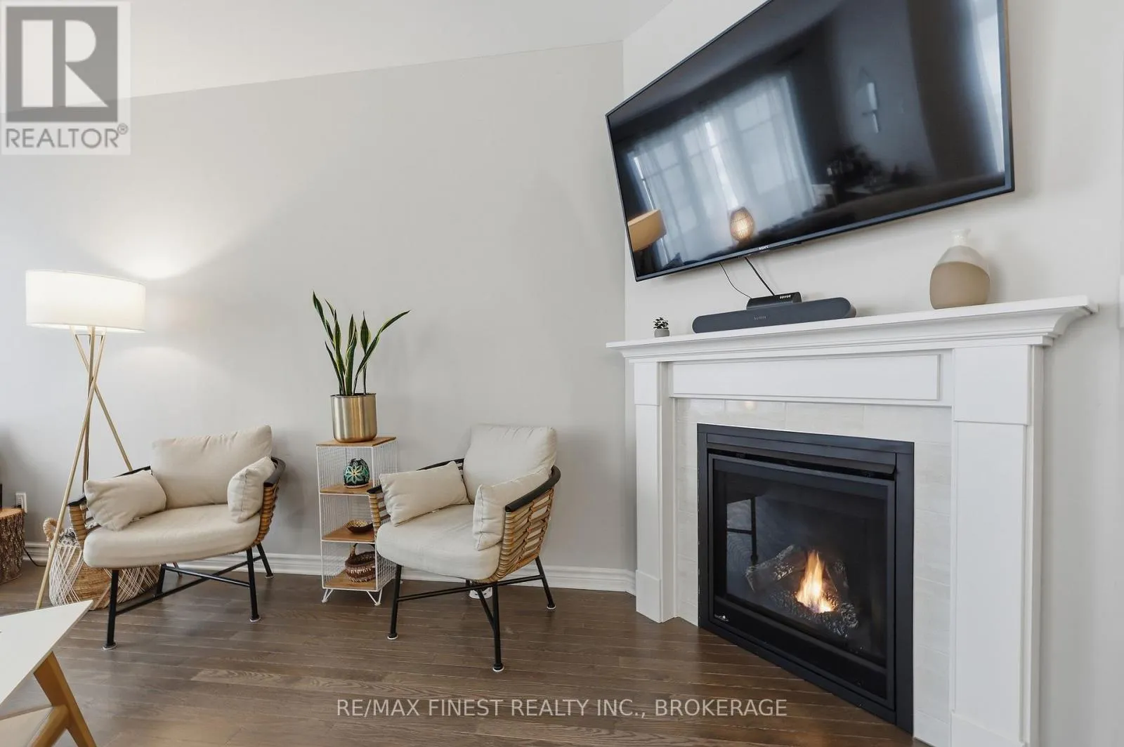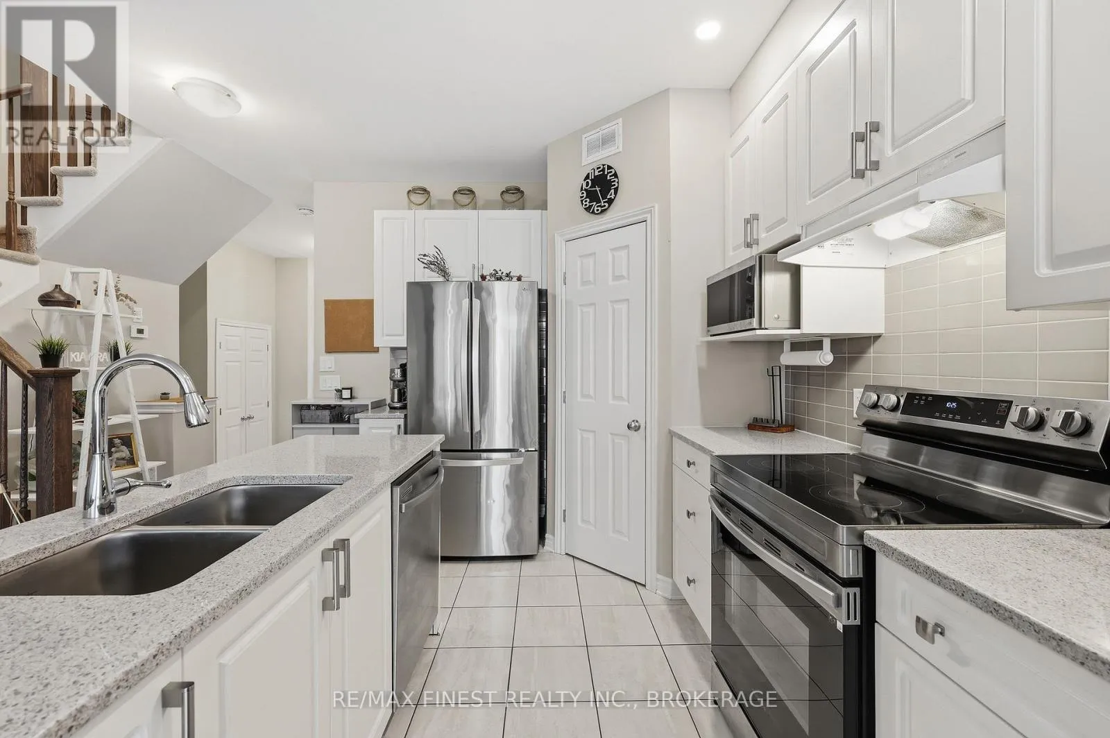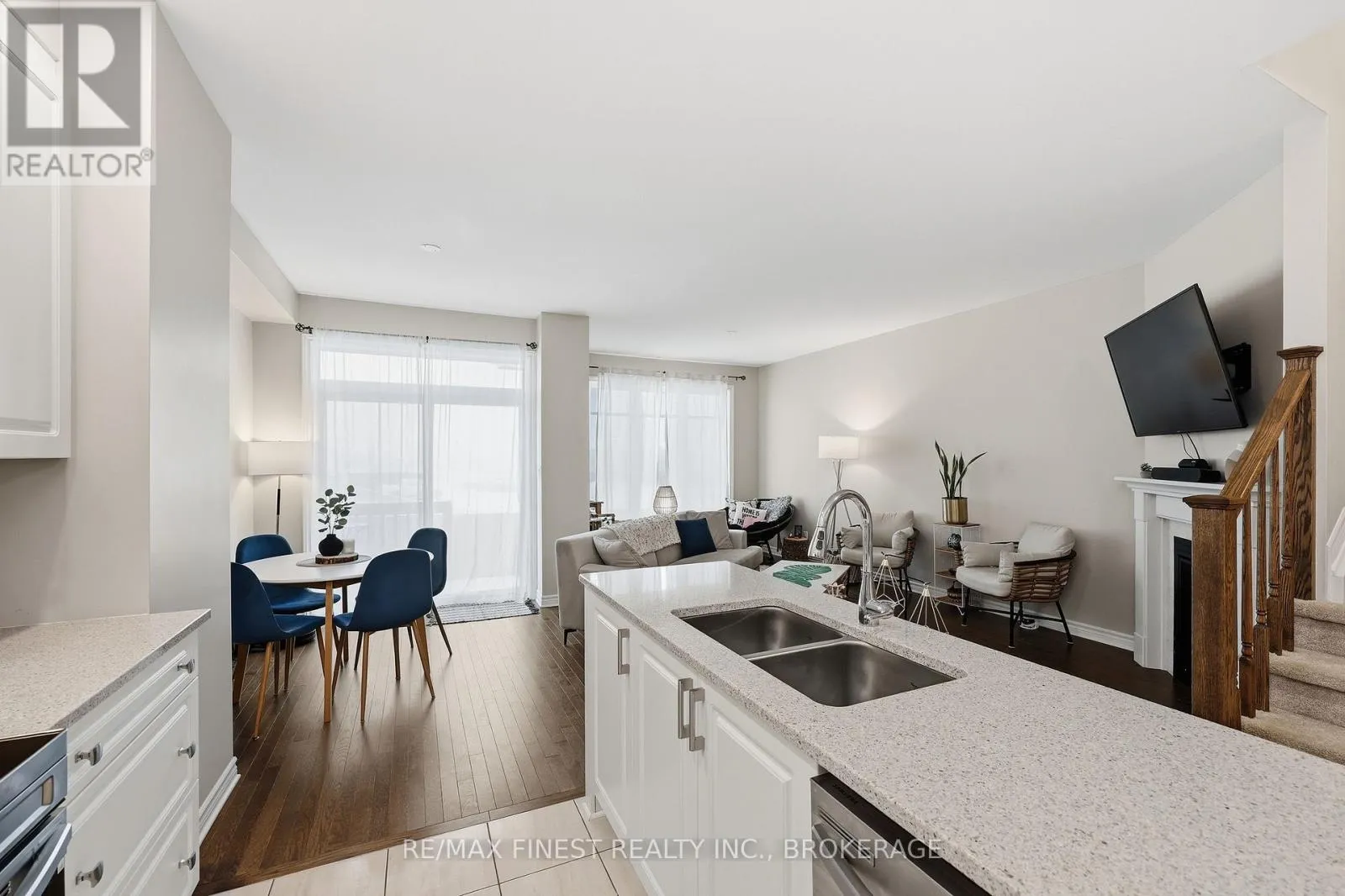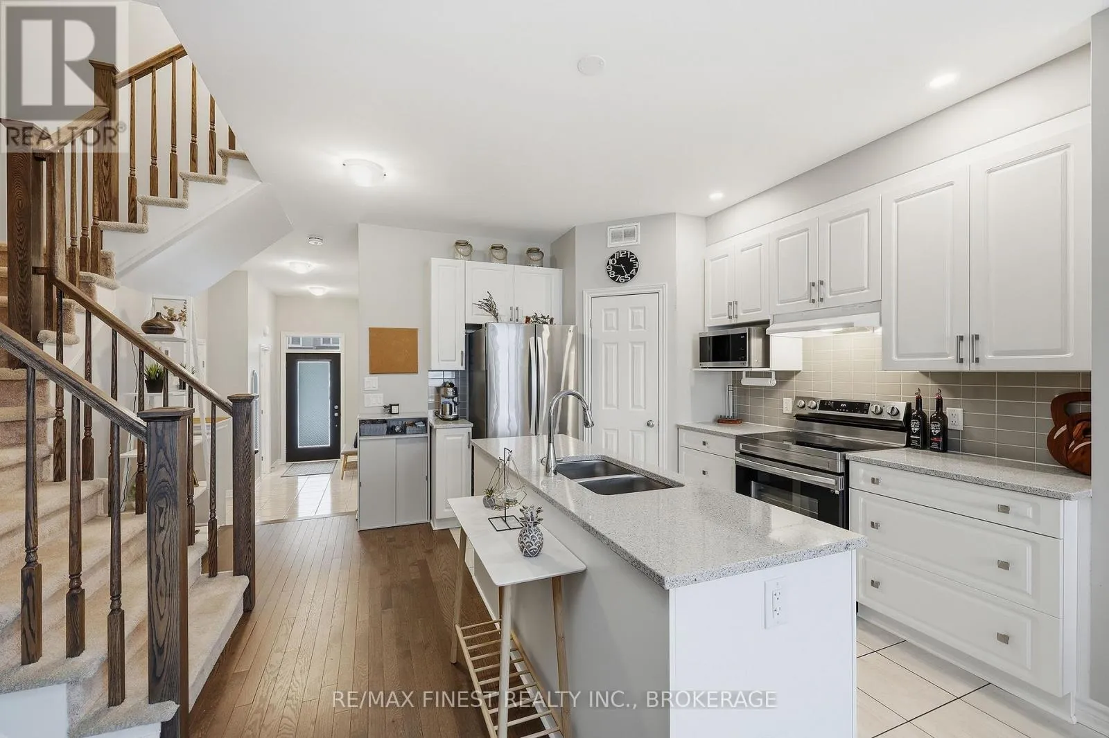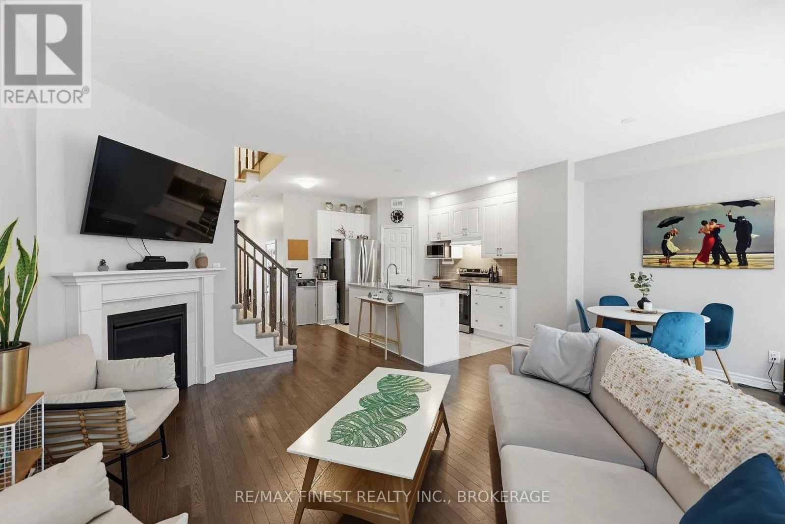 Cross Streets: Cataraqui Woods Drive. ** Directions: Cataraqui Woods Drive to Tenley Drive. Welcome to this beautifully appointed 3-bedroom, 3-bathroom townhouse located in Kingston's west end. Designed with modern living in mind, this home offers high ceilings and an open-concept layout that's both spacious and inviting. The kitchen features quartz countertops, stainless steel appliances, and a stylish tile backsplash - perfect for everyday cooking or entertaining guests. Hardwood flooring spans the main level, while ceramic tile in all wet areas adds durability and easy maintenance. Relax by the cozy fireplace in the living room, framed by large transom windows and a patio door that flood the space with natural light. Upstairs, you'll find three comfortable bedrooms, including the primary bedroom with 4-piece ensuite, plus you'll enjoy the convenience of upper-level laundry. The finished rec room in the lower level provides added living space ideal for a family room, home gym, or office. Located close to schools, walking paths, west-end shops, and everyday amenities, this home combines comfort, style, and an excellent location. (id:27476)