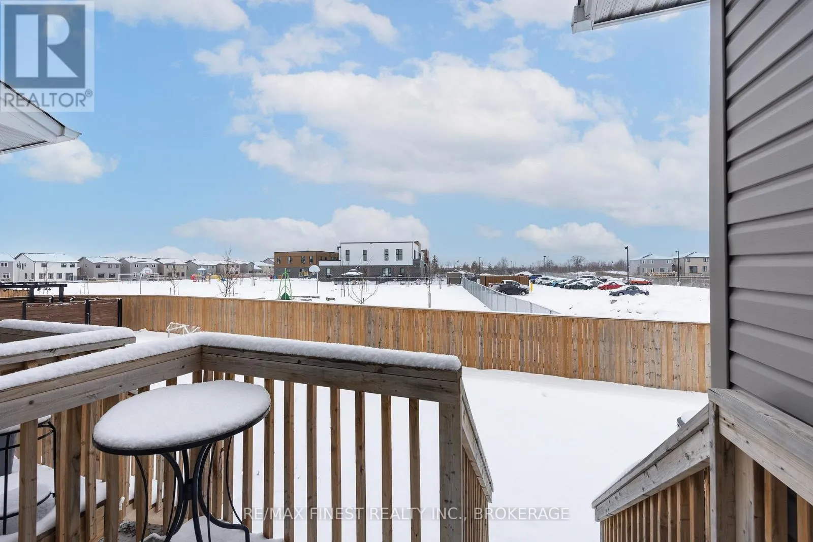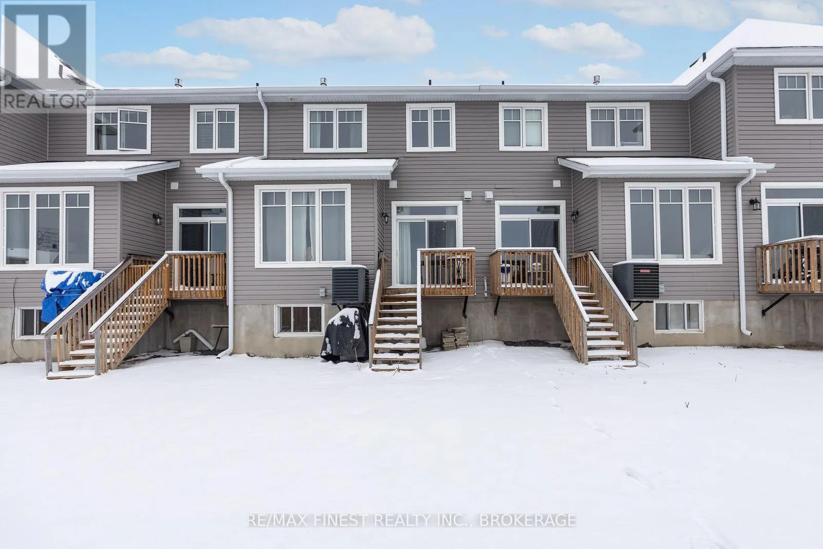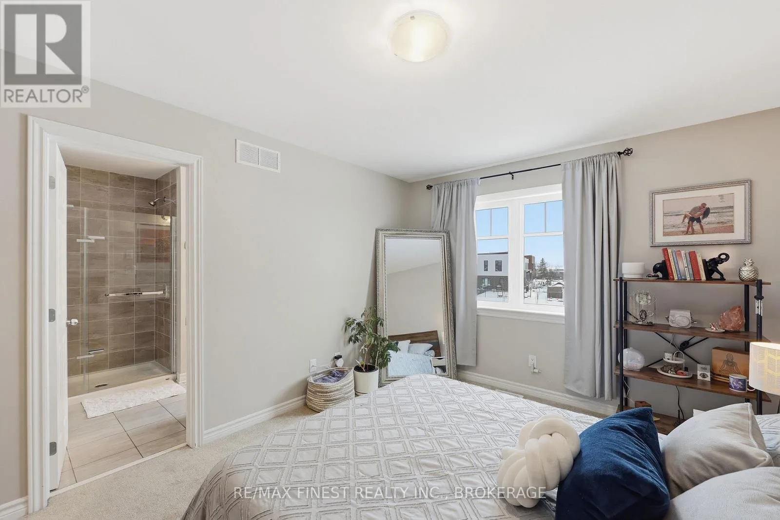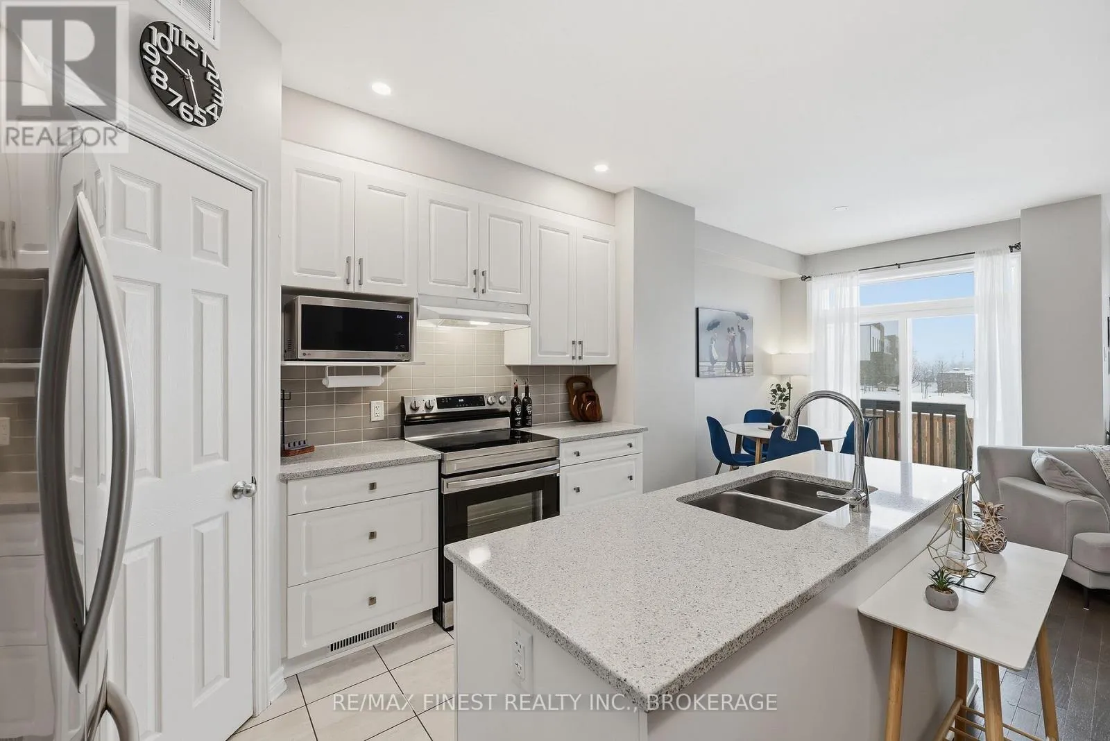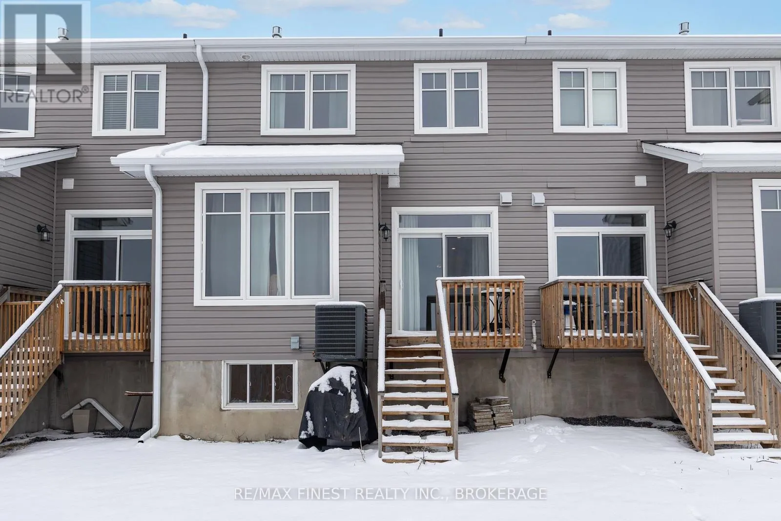 Cross Streets: Cataraqui Woods Drive. ** Directions: Cataraqui Woods Drive to Tenley Drive. Welcome to this beautifully appointed 3-bedroom, 3-bathroom townhouse located in Kingston's west end. Designed with modern living in mind, this home offers high ceilings and an open-concept layout that's both spacious and inviting. The kitchen features quartz countertops, stainless steel appliances, and a stylish tile backsplash - perfect for everyday cooking or entertaining guests. Hardwood flooring spans the main level, while ceramic tile in all wet areas adds durability and easy maintenance. Relax by the cozy fireplace in the living room, framed by large transom windows and a patio door that flood the space with natural light. Upstairs, you'll find three comfortable bedrooms, including the primary bedroom with 4-piece ensuite, plus you'll enjoy the convenience of upper-level laundry. The finished rec room in the lower level provides added living space ideal for a family room, home gym, or office. Located close to schools, walking paths, west-end shops, and everyday amenities, this home combines comfort, style, and an excellent location. (id:27476)