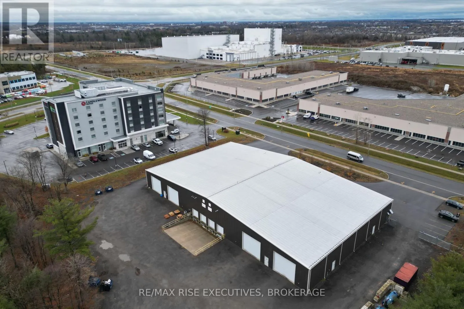 Cross Streets: Centennial Dr or Fortune Cres. ** Directions: Centennial Dr or Fortune Cres to Resource Rd. Exceptional West End Kingston opportunity to locate your business within Kingston's Cataraqui Business Park, offering convenient access to Highway 401. Clear-span building features four 18 ft high by 16 ft wide drive-in doors, with two at the front and two at the rear for full drive-through capability, plus two 8 ft wide dock-level loading doors. Ceiling height ranges from approximately 19 ft at the beam lines to 22 ft plus at the centre. Approximate space configuration includes 10,500 sq ft of warehouse, 1,500 sq ft of office area (offices, reception, washrooms including rear access washroom with shower, lunchroom, utility, and air conditioning for the office area), plus a bonus second-floor mezzanine of approximately 1,500 sq ft with stair access. The property offers 600-volt, 3-phase service and is situated on a 2.5-acre lot with a full rear yard and gated front access. There is only one adjacent tenant in the building, with shared use of the rear lot area allocated based on the building midline between units. Unit 1 is the left-hand, front-facing unit. Convenient access, proximity to the city core, and nearby services including bus routes, trails, the Holiday Inn Express, and the Invista Centre further enhance this location. The lease is triple net on the landlord's form of lease, with TMI estimated at $5.55 per sq ft per annum. The landlord may also consider subleasing a portion of the premises, subject to suitability of use and the landlord retaining a portion of the unit. (id:27476)