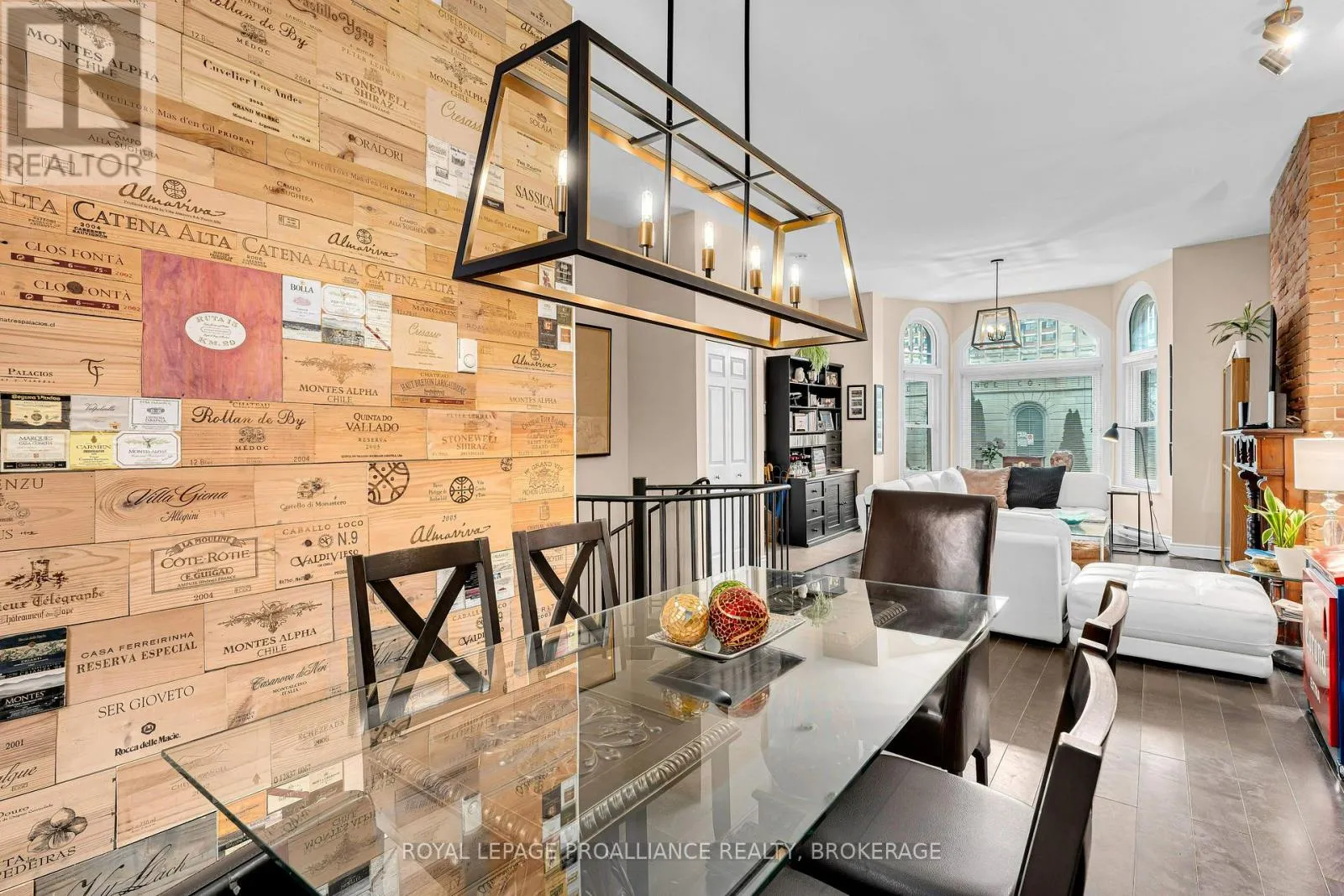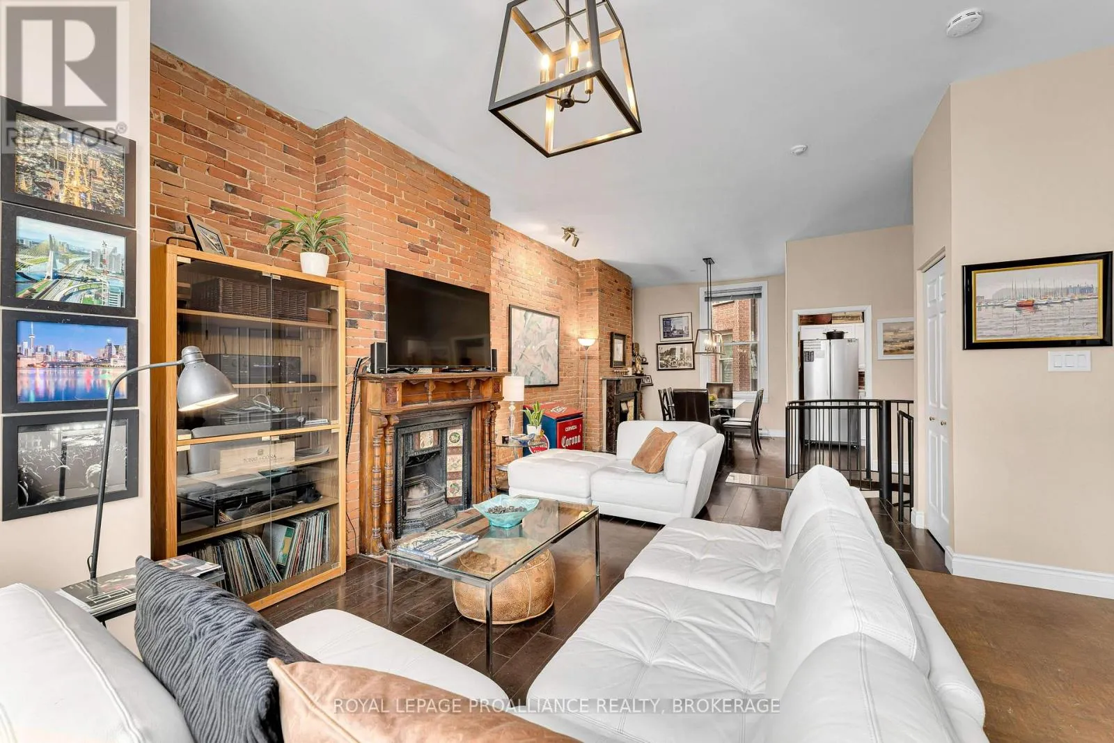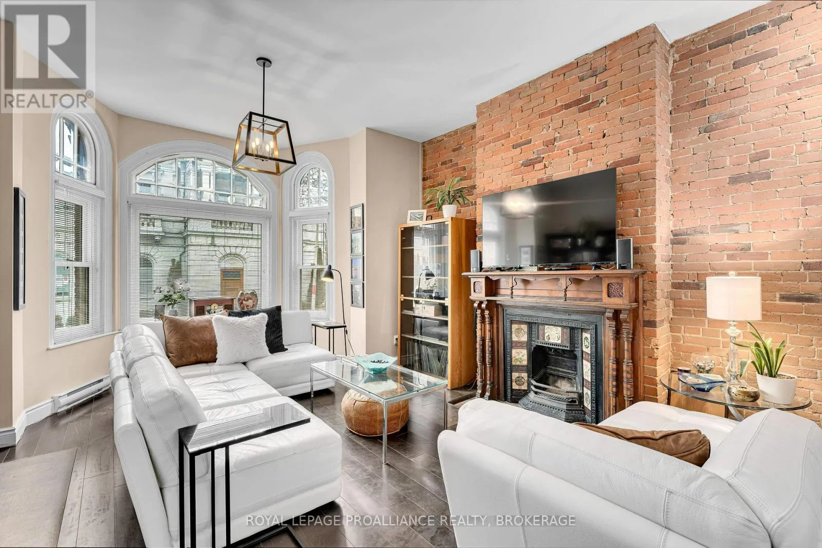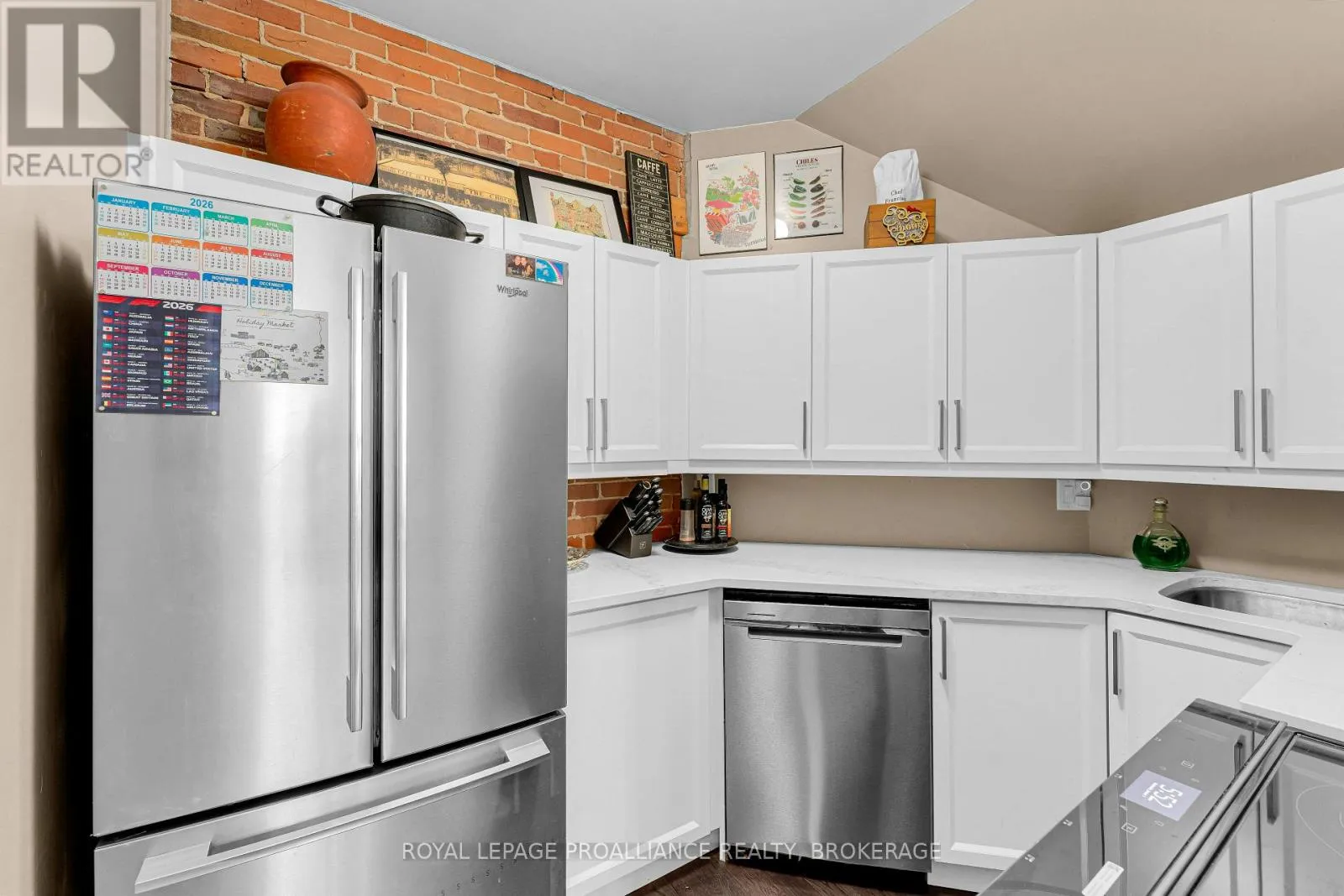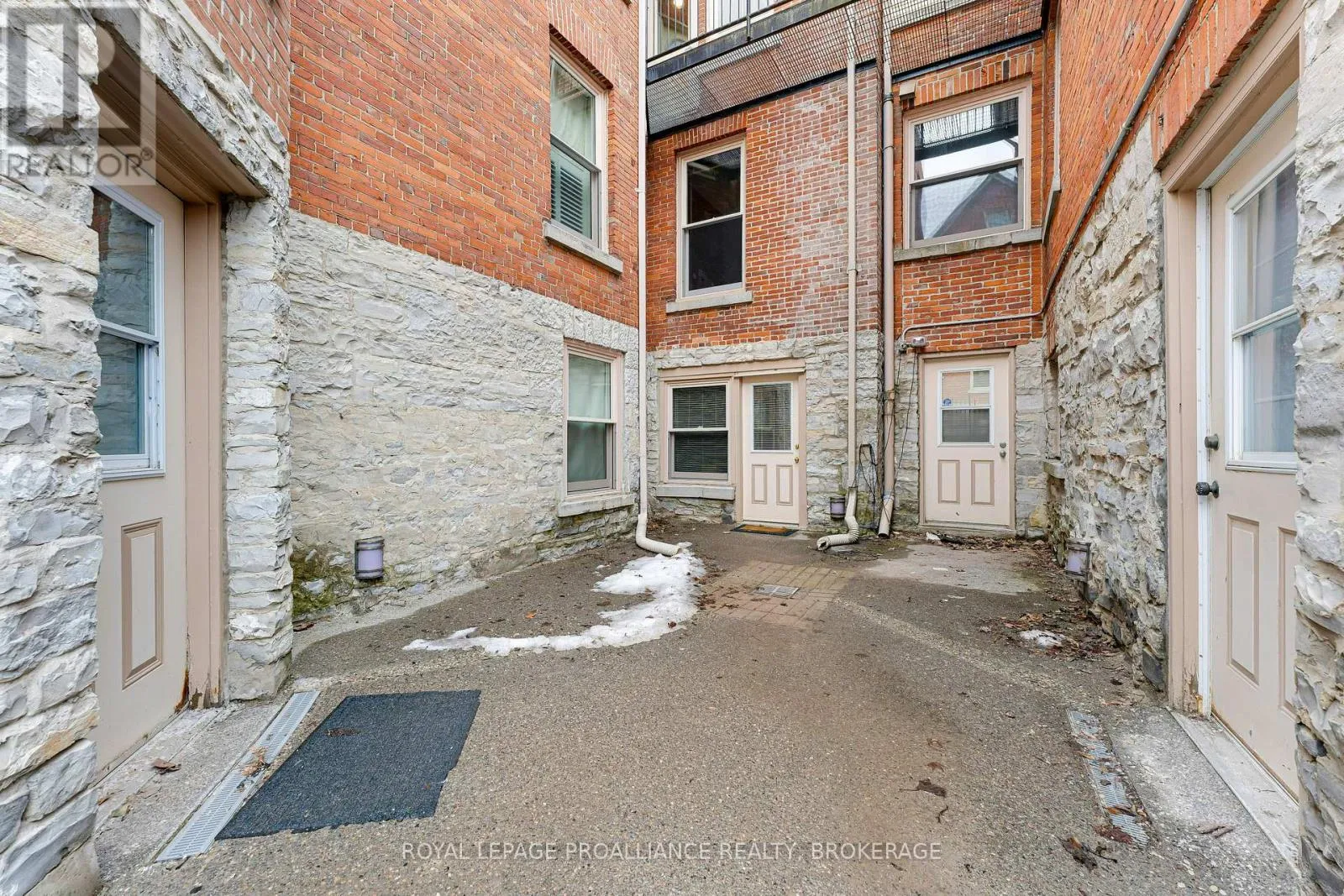 Cross Streets: Johnson Street. ** Directions: King Street between Johnson Street & William Street. Welcome to the Kilborn Building, ideally located in the heart of Kingston's historic Sydenham Ward. This charming two-bedroom condominium blends character and comfort with exposed brick and limestone accents that highlight the building's heritage. The thoughtfully updated kitchen is functional and just off of the bright living and dining area framed large windows, creating an inviting space for everyday living and entertaining. The layout offers in-suite laundry, two bedrooms, a full bathroom, and a convenient powder room, with the second bedroom providing access to a private patio area just outside the door. Complete with one dedicated parking space, this home is ideally situated within walking distance to Queen's University, Kingston General Hospital, and downtown shops and restaurants, offering a wonderful balance of historic charm and urban convenience. (id:27476)