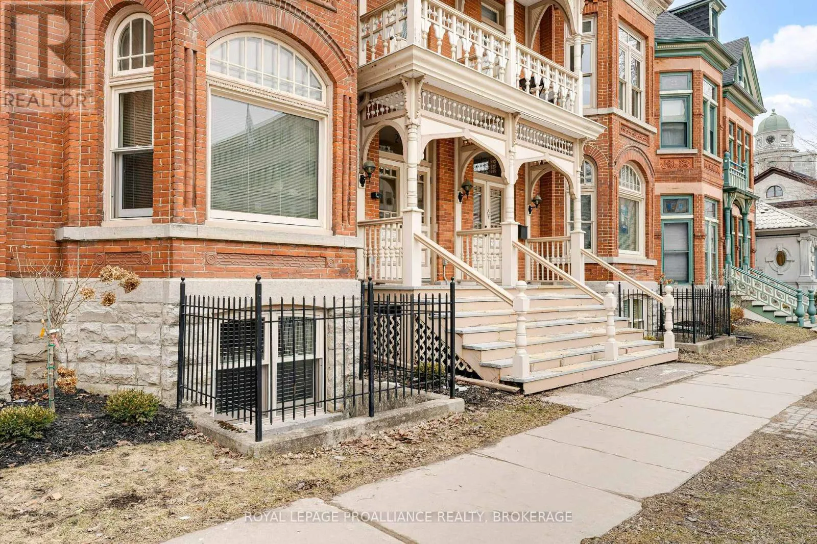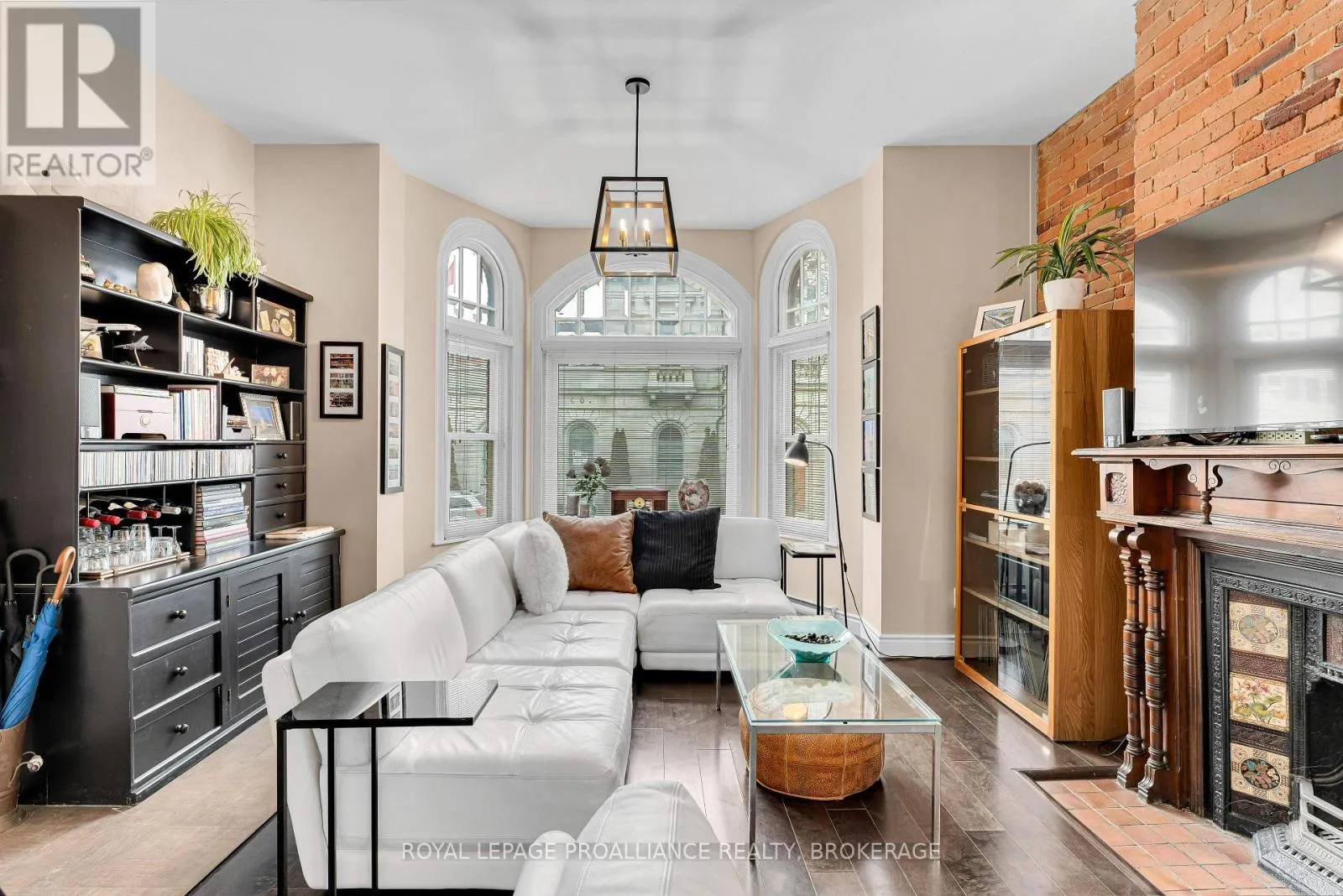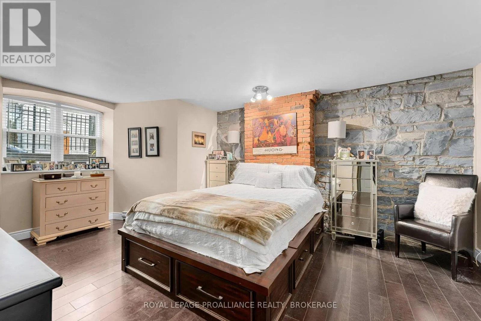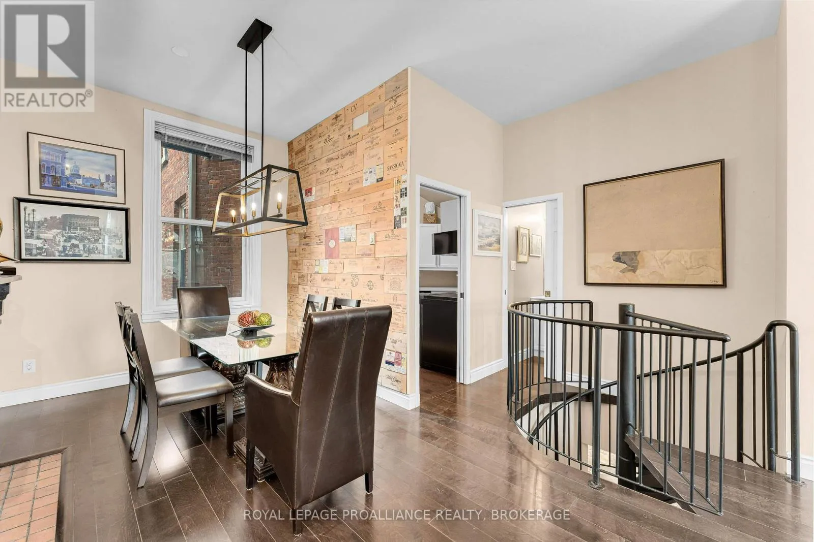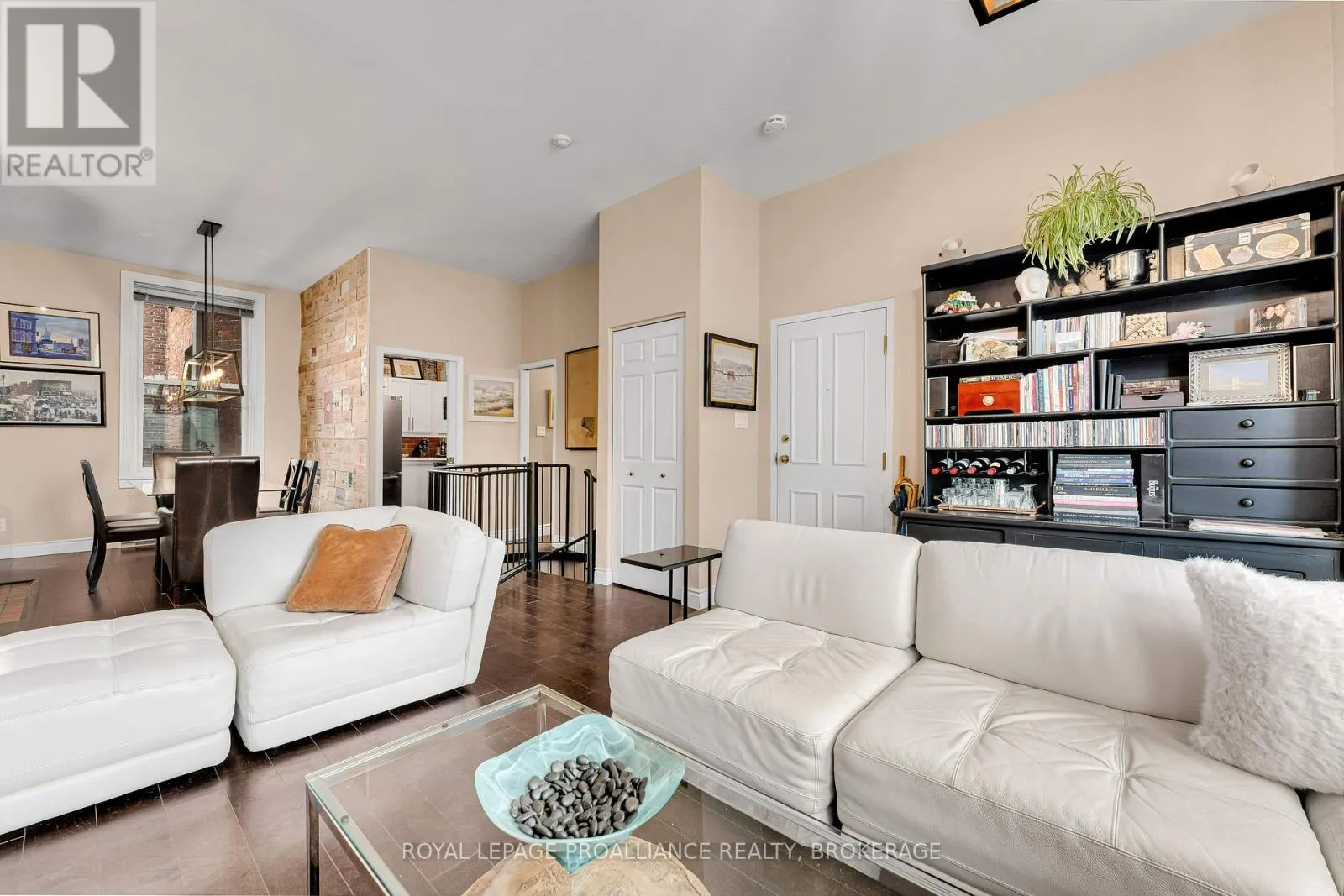 Cross Streets: Johnson Street. ** Directions: King Street between Johnson Street & William Street. Welcome to the Kilborn Building, ideally located in the heart of Kingston's historic Sydenham Ward. This charming two-bedroom condominium blends character and comfort with exposed brick and limestone accents that highlight the building's heritage. The thoughtfully updated kitchen is functional and just off of the bright living and dining area framed large windows, creating an inviting space for everyday living and entertaining. The layout offers in-suite laundry, two bedrooms, a full bathroom, and a convenient powder room, with the second bedroom providing access to a private patio area just outside the door. Complete with one dedicated parking space, this home is ideally situated within walking distance to Queen's University, Kingston General Hospital, and downtown shops and restaurants, offering a wonderful balance of historic charm and urban convenience. (id:27476)