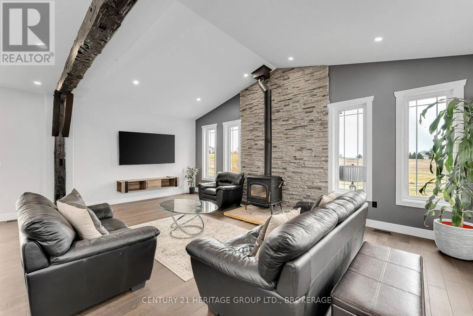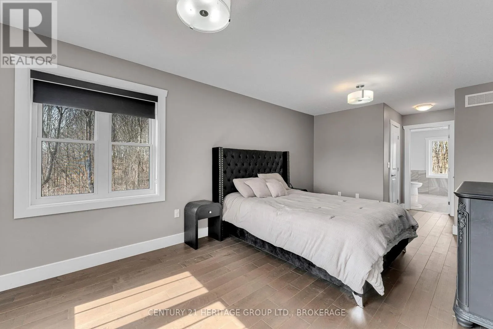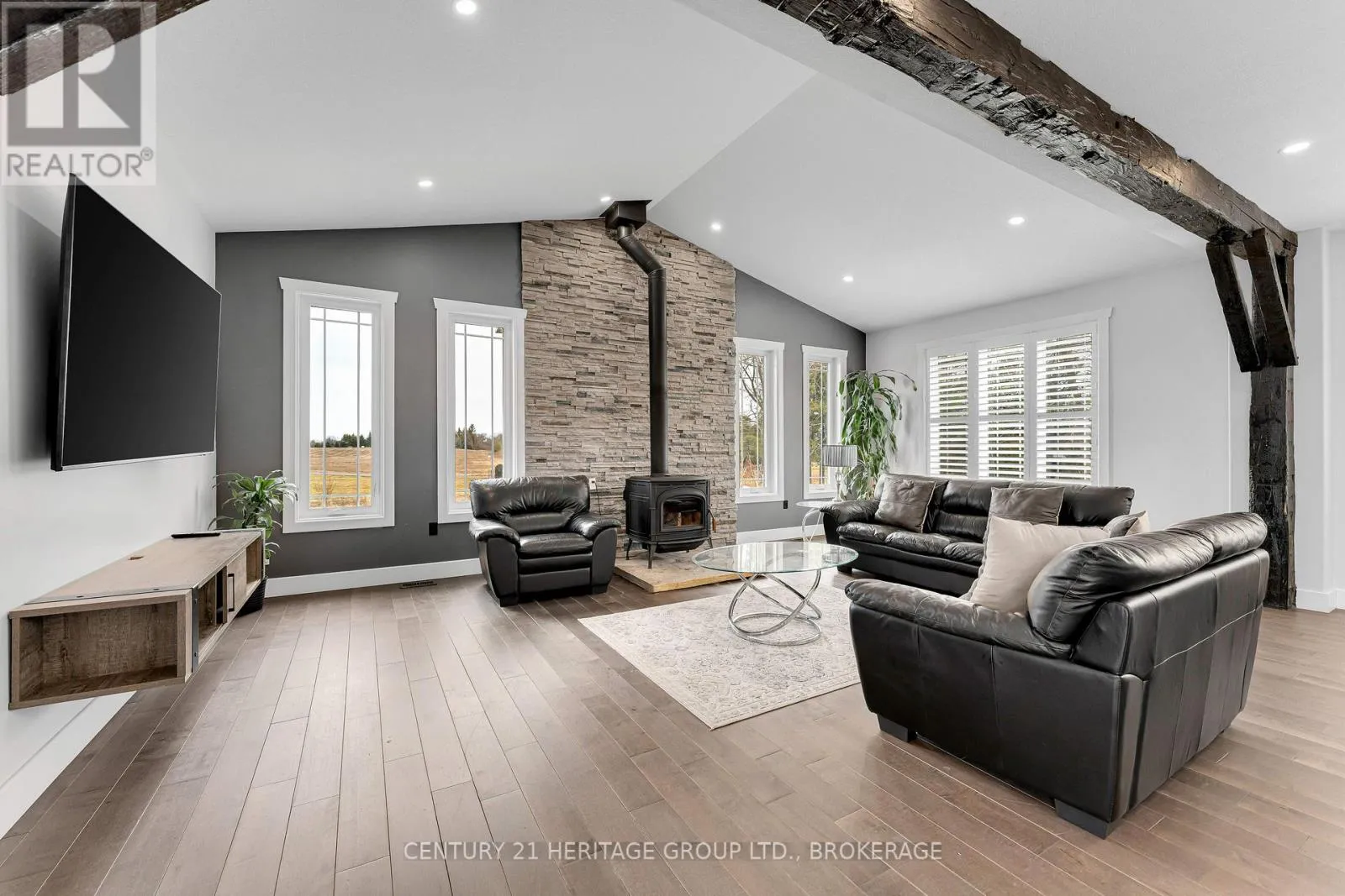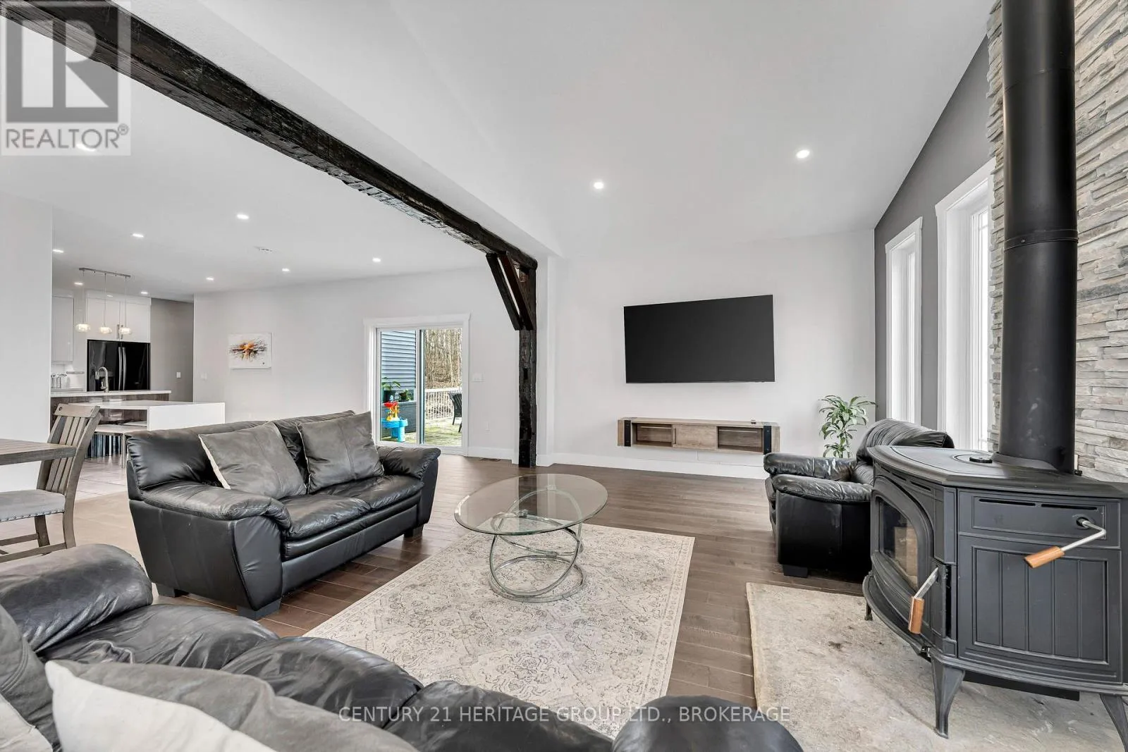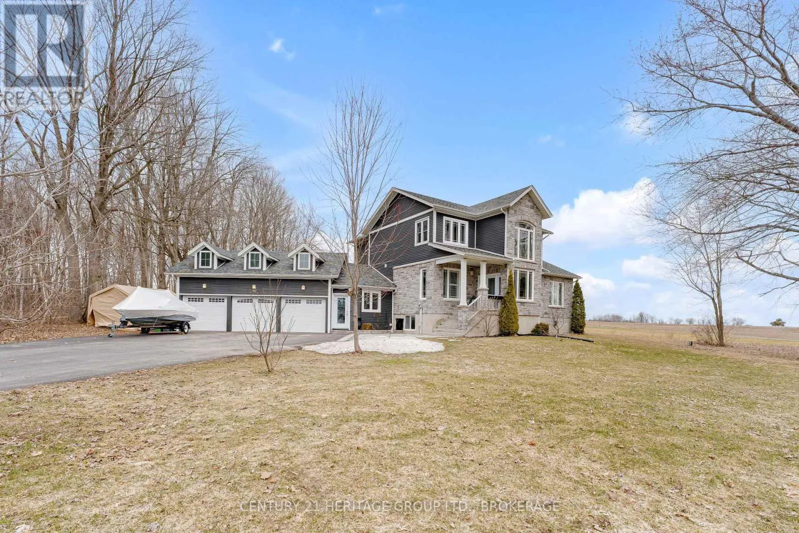 Montreal St to Aragon Rd Set on a picturesque three-acre property just minutes from downtown and the 401, this exceptional residence offers a rare blend of privacy, space, and refined living. Thoughtfully designed with four bedrooms and four bathrooms, the home showcases quality craftsmanship and a layout that balances everyday comfort with elevated style. A welcoming mudroom entry leads into a beautifully appointed main floor featuring a dedicated office, convenient laundry, and elegant living spaces. At the heart of the home is a stunning, light-filled kitchen with quartz countertops, flowing seamlessly into the dining area and an impressive family room with soaring vaulted ceilings and a wood-burning fireplace. Hardwood flooring throughout adds warmth and sophistication. The primary suite is a true retreat, complete with a well-appointed ensuite and generous closet space. The fully finished lower level offers exceptional flexibility with a spacious rec room, additional bedroom, bathroom, and ample storage-ideal for guests or multi-generational living. The expansive grounds provide endless opportunities for outdoor enjoyment, complemented by a three-car garage. Planned enhancements to nearby Cecil and Wilma Graham Park, including a boat ramp, picnic areas, and walking paths, are expected by 2027, adding even more lifestyle value to this already desirable location. A rare opportunity to enjoy the best of country living with city convenience. (id:27476)