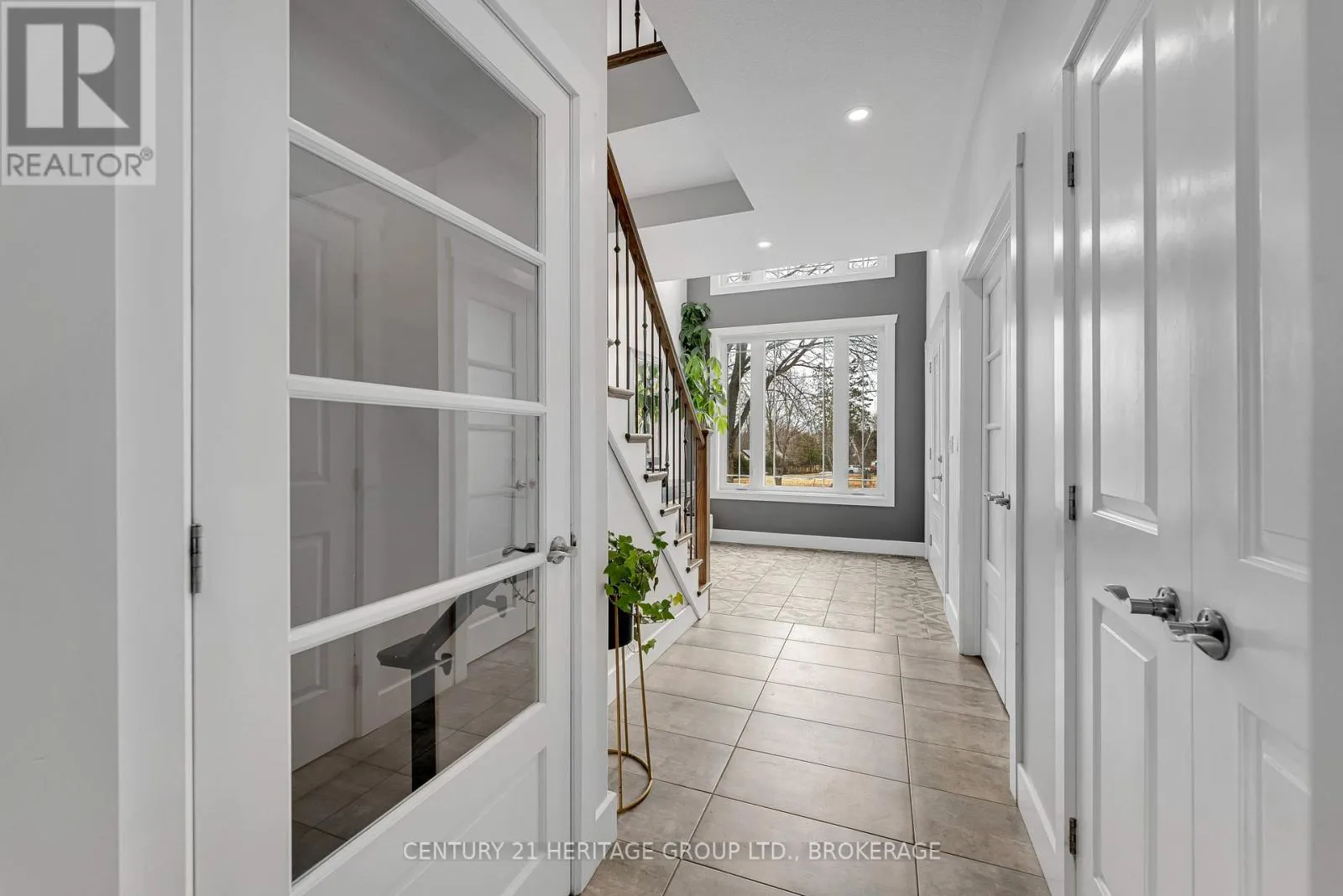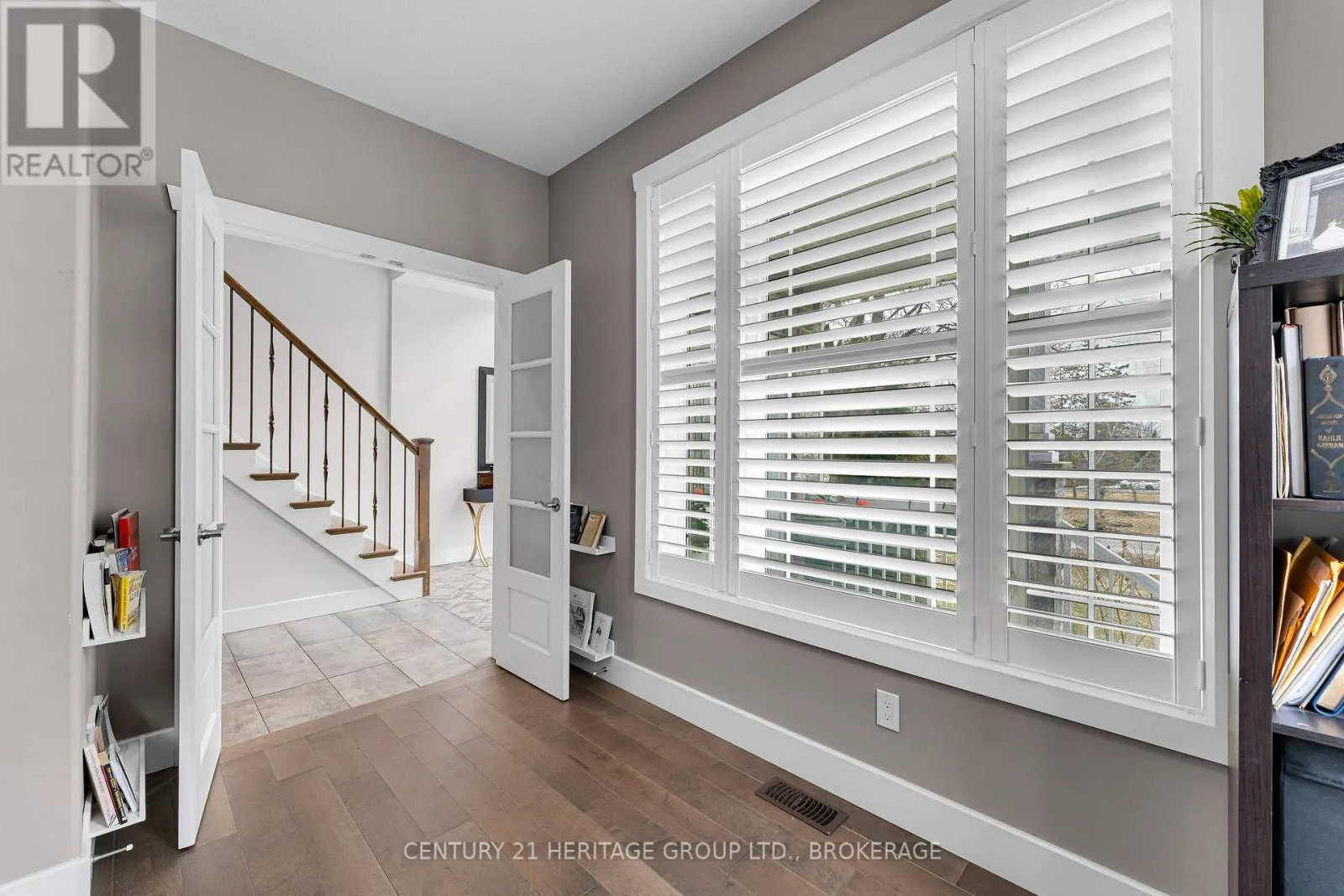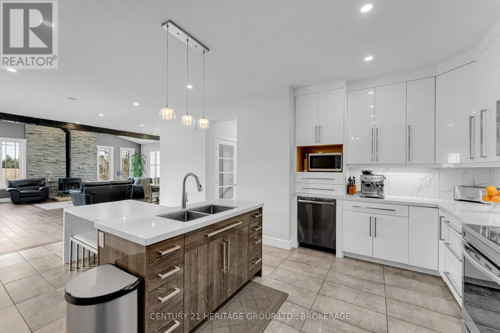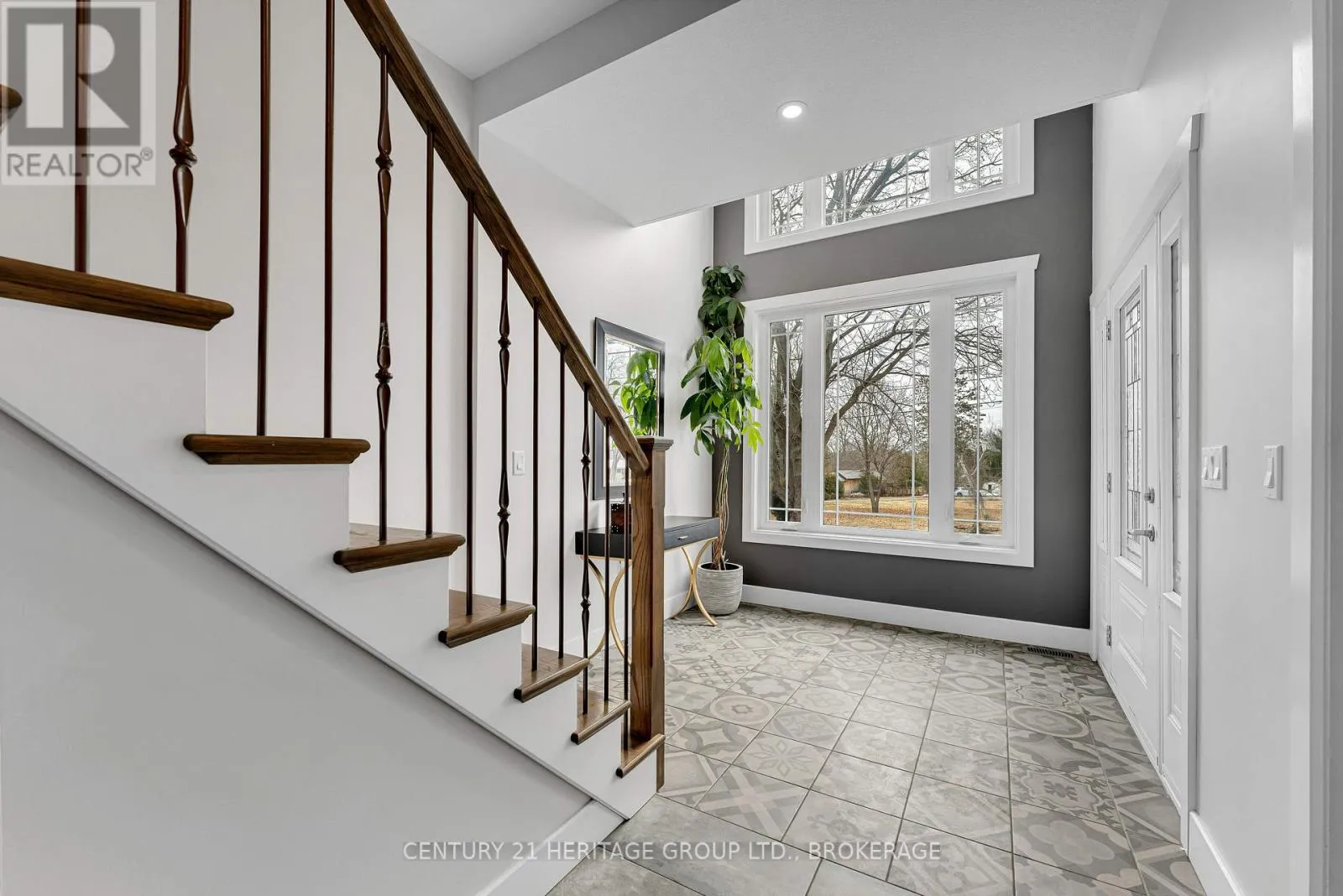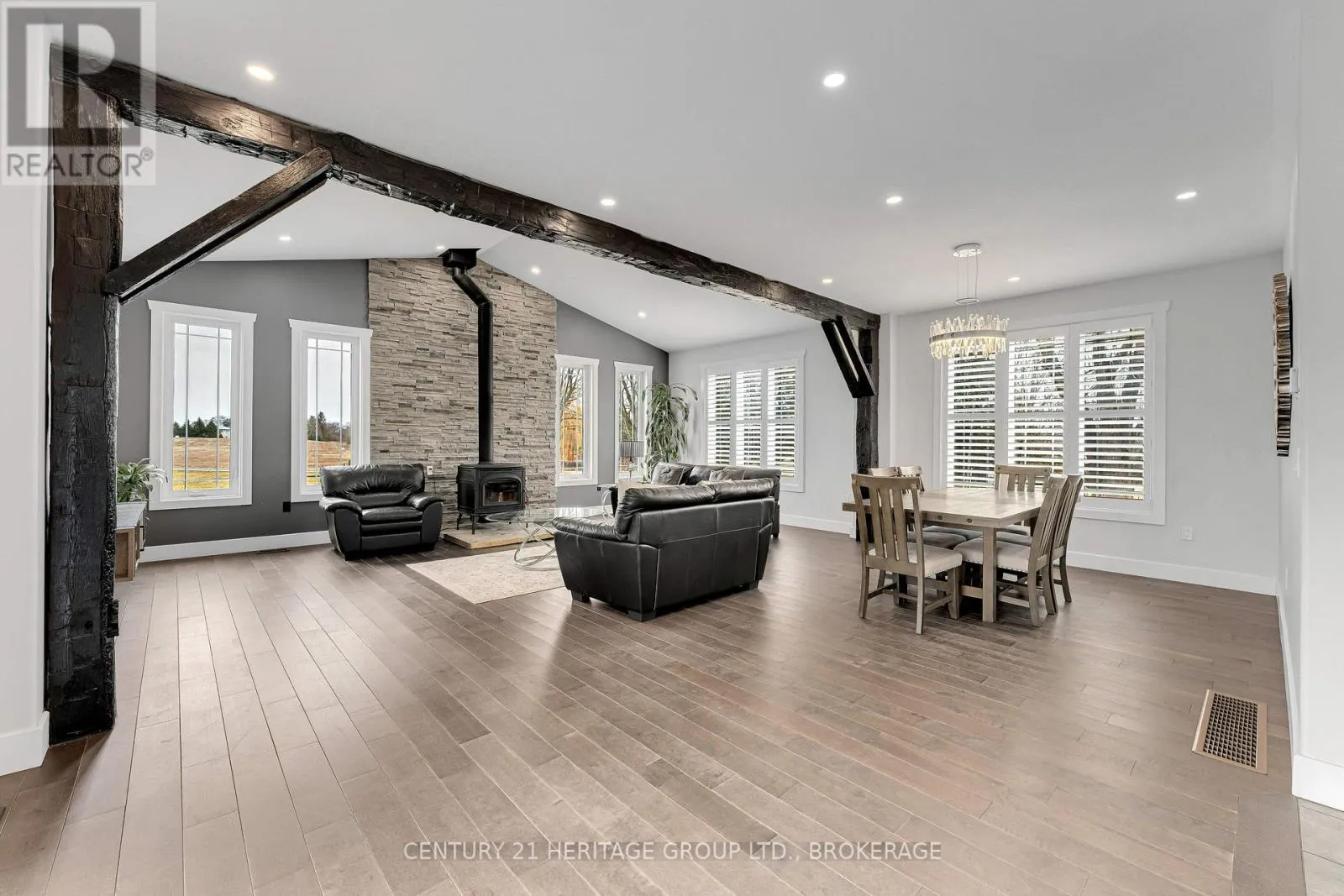 Montreal St to Aragon Rd Set on a picturesque three-acre property just minutes from downtown and the 401, this exceptional residence offers a rare blend of privacy, space, and refined living. Thoughtfully designed with four bedrooms and four bathrooms, the home showcases quality craftsmanship and a layout that balances everyday comfort with elevated style. A welcoming mudroom entry leads into a beautifully appointed main floor featuring a dedicated office, convenient laundry, and elegant living spaces. At the heart of the home is a stunning, light-filled kitchen with quartz countertops, flowing seamlessly into the dining area and an impressive family room with soaring vaulted ceilings and a wood-burning fireplace. Hardwood flooring throughout adds warmth and sophistication. The primary suite is a true retreat, complete with a well-appointed ensuite and generous closet space. The fully finished lower level offers exceptional flexibility with a spacious rec room, additional bedroom, bathroom, and ample storage-ideal for guests or multi-generational living. The expansive grounds provide endless opportunities for outdoor enjoyment, complemented by a three-car garage. Planned enhancements to nearby Cecil and Wilma Graham Park, including a boat ramp, picnic areas, and walking paths, are expected by 2027, adding even more lifestyle value to this already desirable location. A rare opportunity to enjoy the best of country living with city convenience. (id:27476)