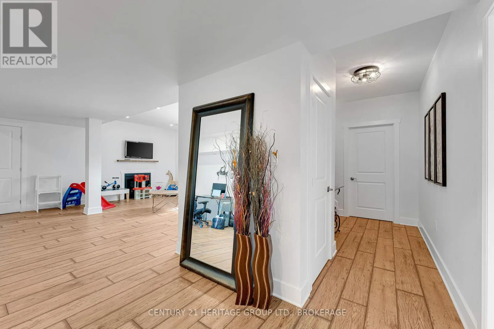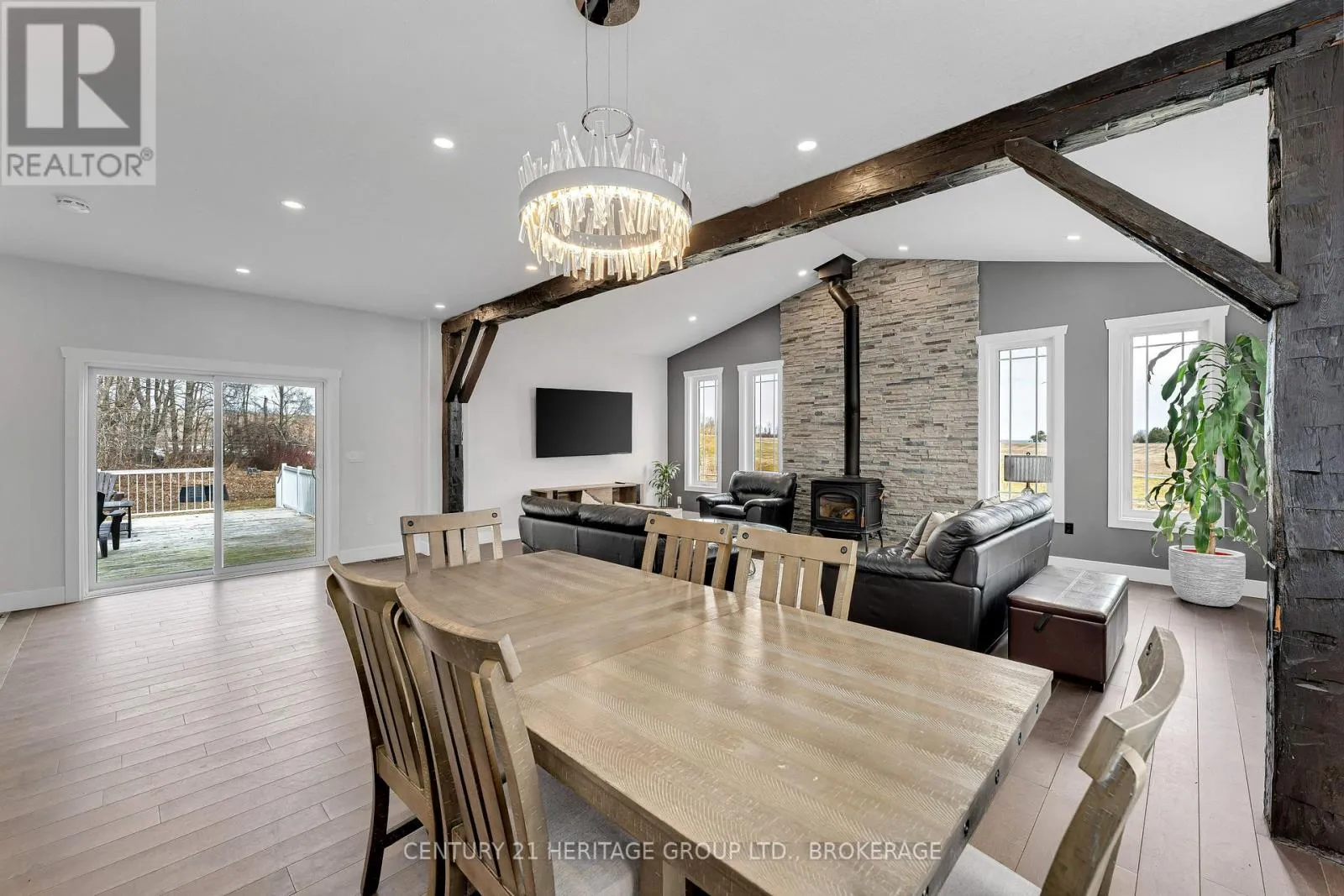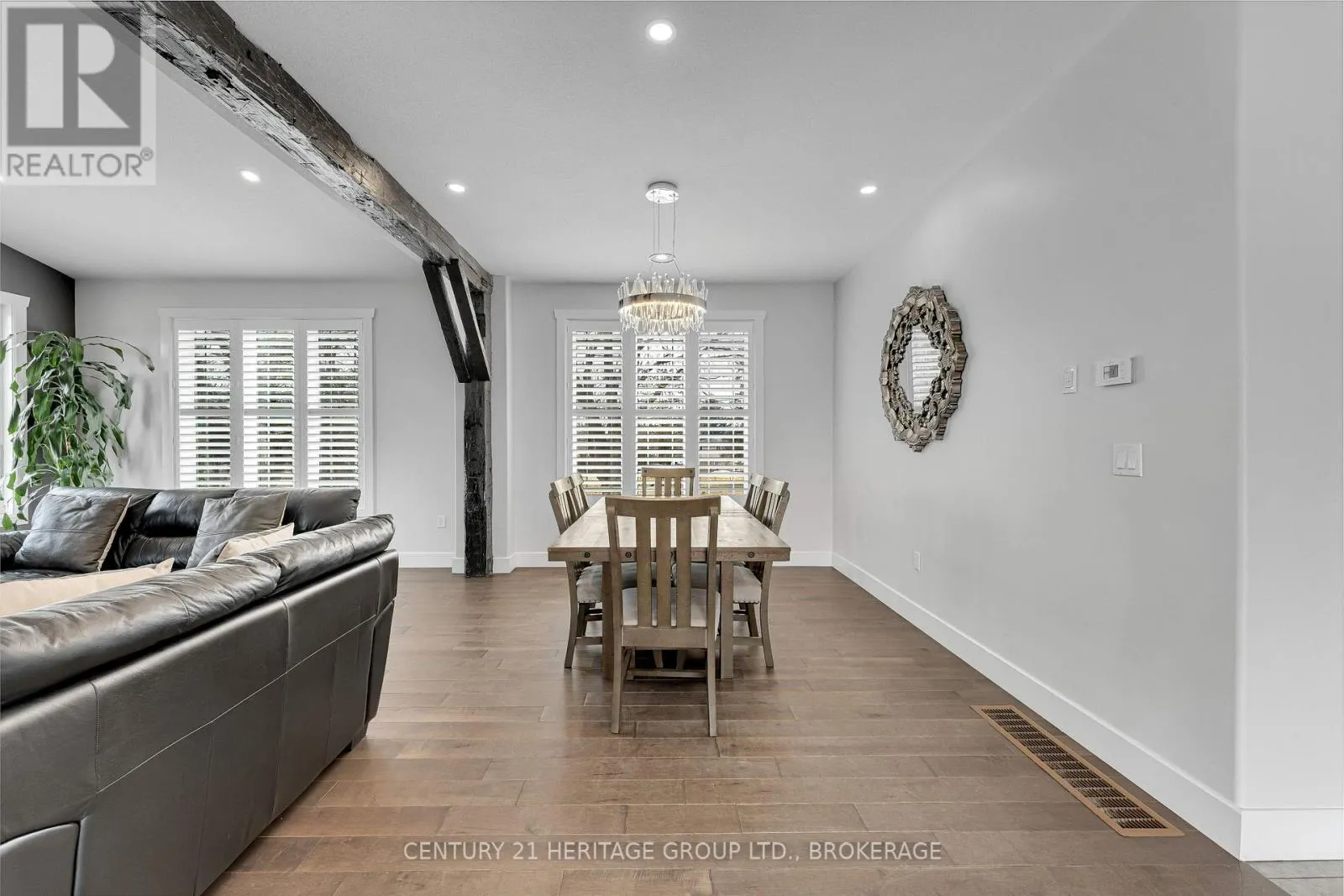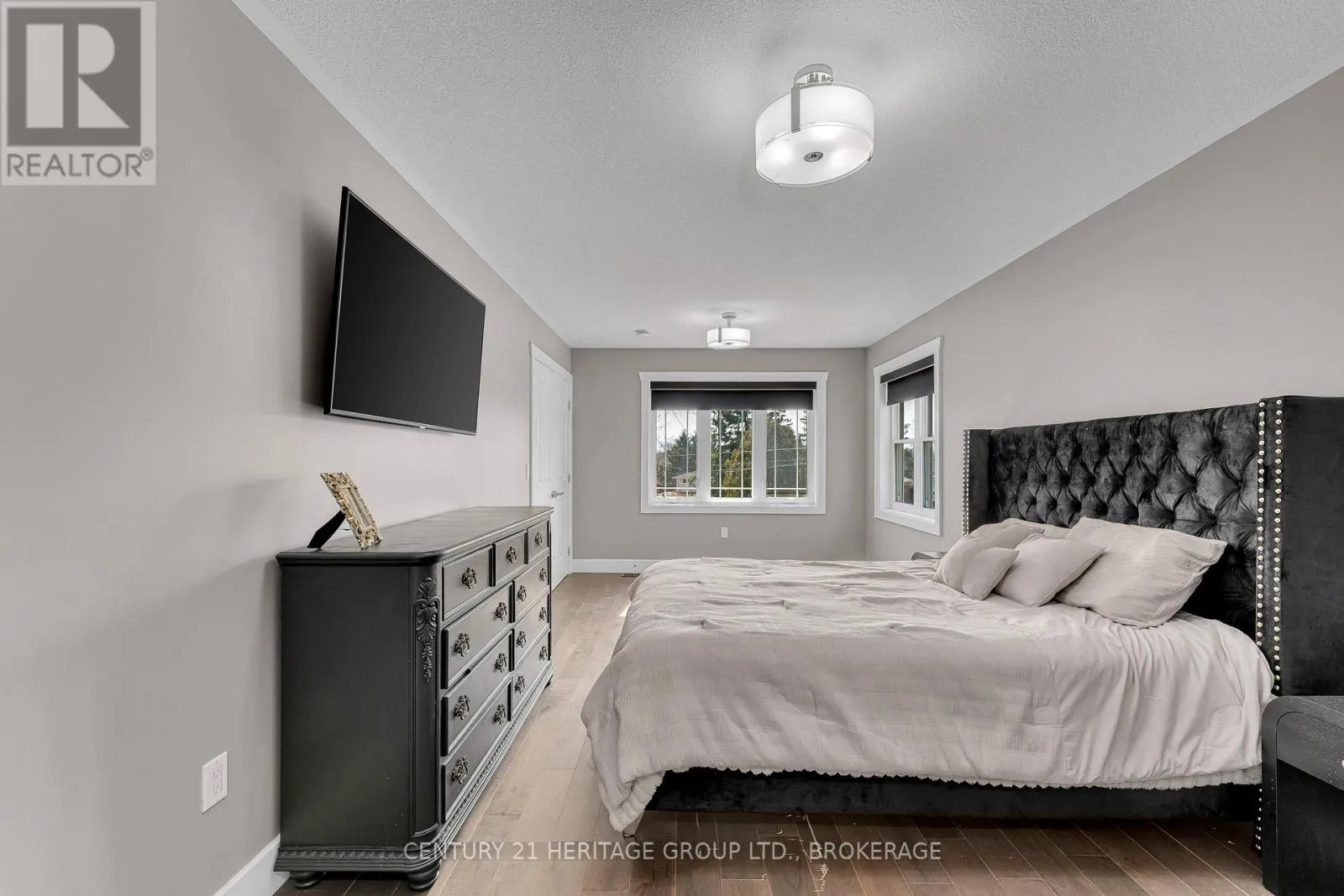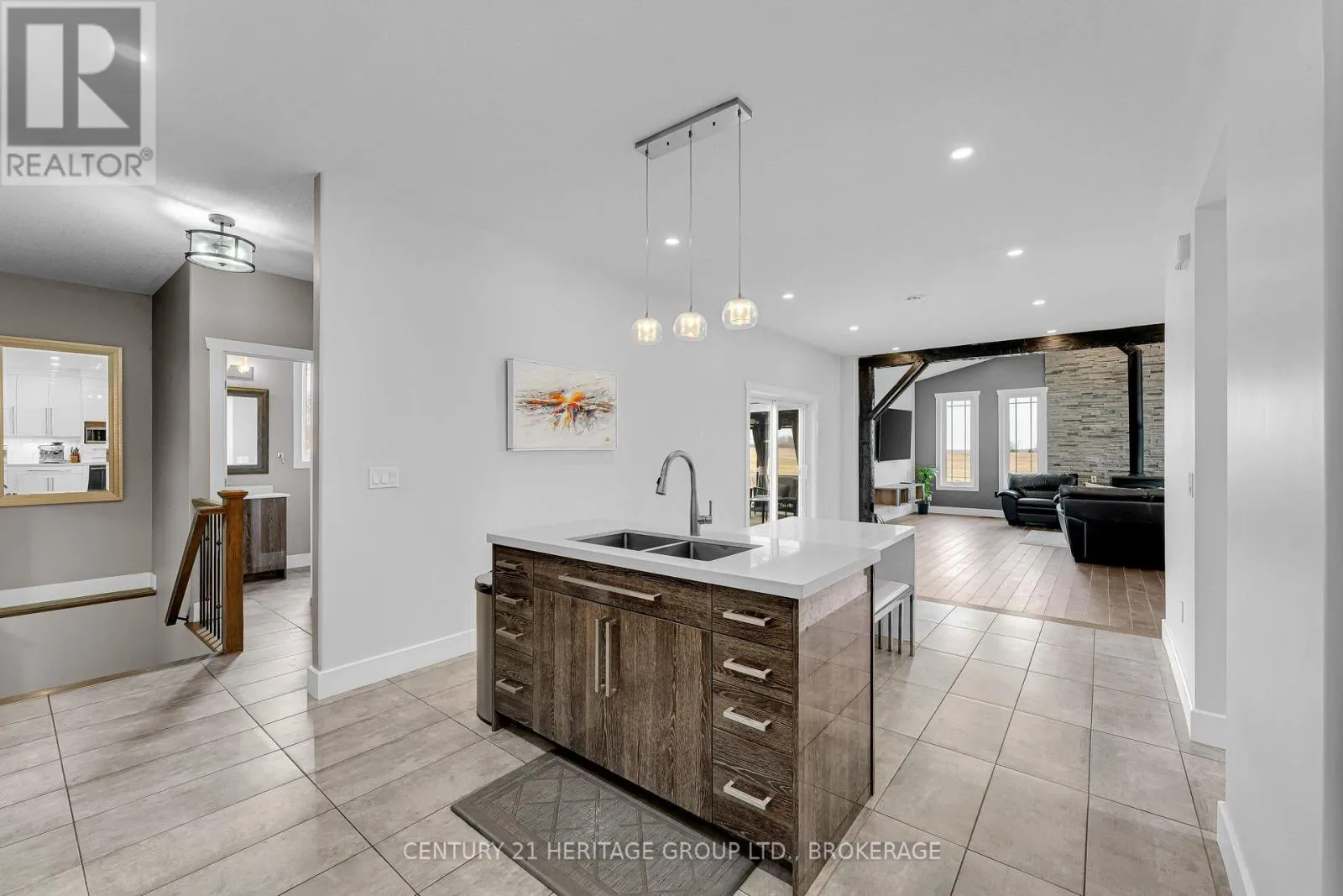 Montreal St to Aragon Rd Set on a picturesque three-acre property just minutes from downtown and the 401, this exceptional residence offers a rare blend of privacy, space, and refined living. Thoughtfully designed with four bedrooms and four bathrooms, the home showcases quality craftsmanship and a layout that balances everyday comfort with elevated style. A welcoming mudroom entry leads into a beautifully appointed main floor featuring a dedicated office, convenient laundry, and elegant living spaces. At the heart of the home is a stunning, light-filled kitchen with quartz countertops, flowing seamlessly into the dining area and an impressive family room with soaring vaulted ceilings and a wood-burning fireplace. Hardwood flooring throughout adds warmth and sophistication. The primary suite is a true retreat, complete with a well-appointed ensuite and generous closet space. The fully finished lower level offers exceptional flexibility with a spacious rec room, additional bedroom, bathroom, and ample storage-ideal for guests or multi-generational living. The expansive grounds provide endless opportunities for outdoor enjoyment, complemented by a three-car garage. Planned enhancements to nearby Cecil and Wilma Graham Park, including a boat ramp, picnic areas, and walking paths, are expected by 2027, adding even more lifestyle value to this already desirable location. A rare opportunity to enjoy the best of country living with city convenience. (id:27476)