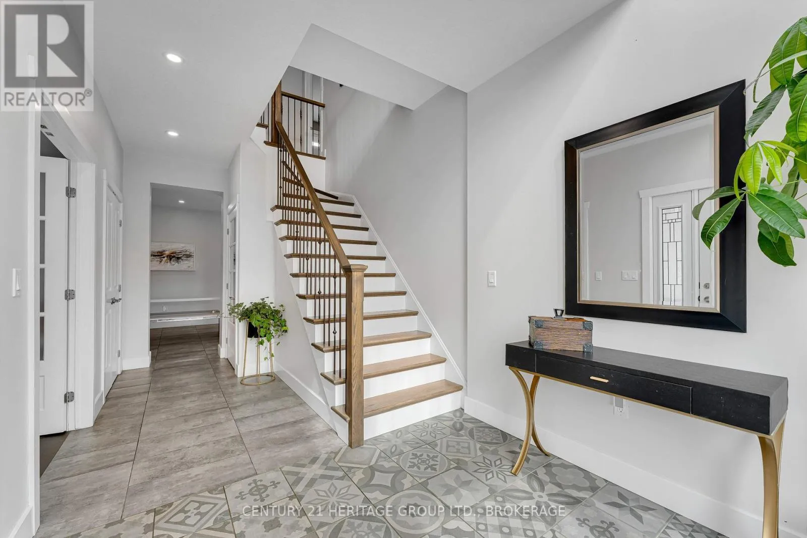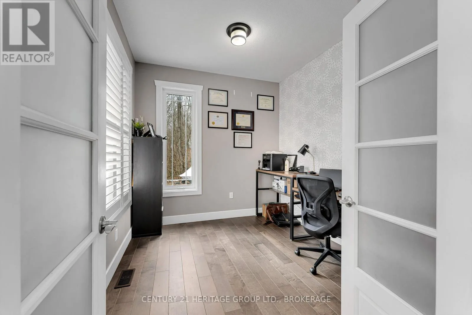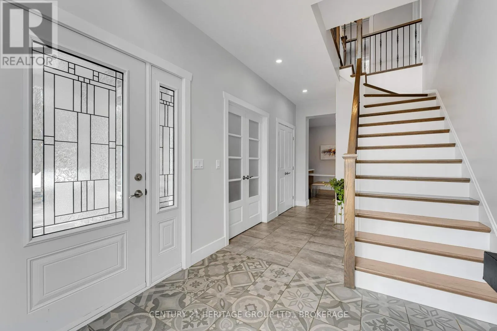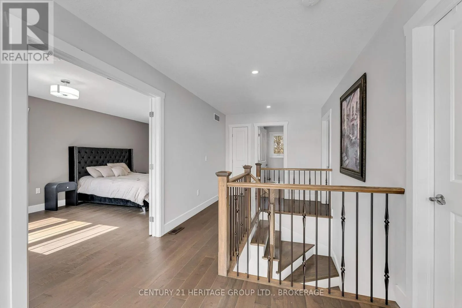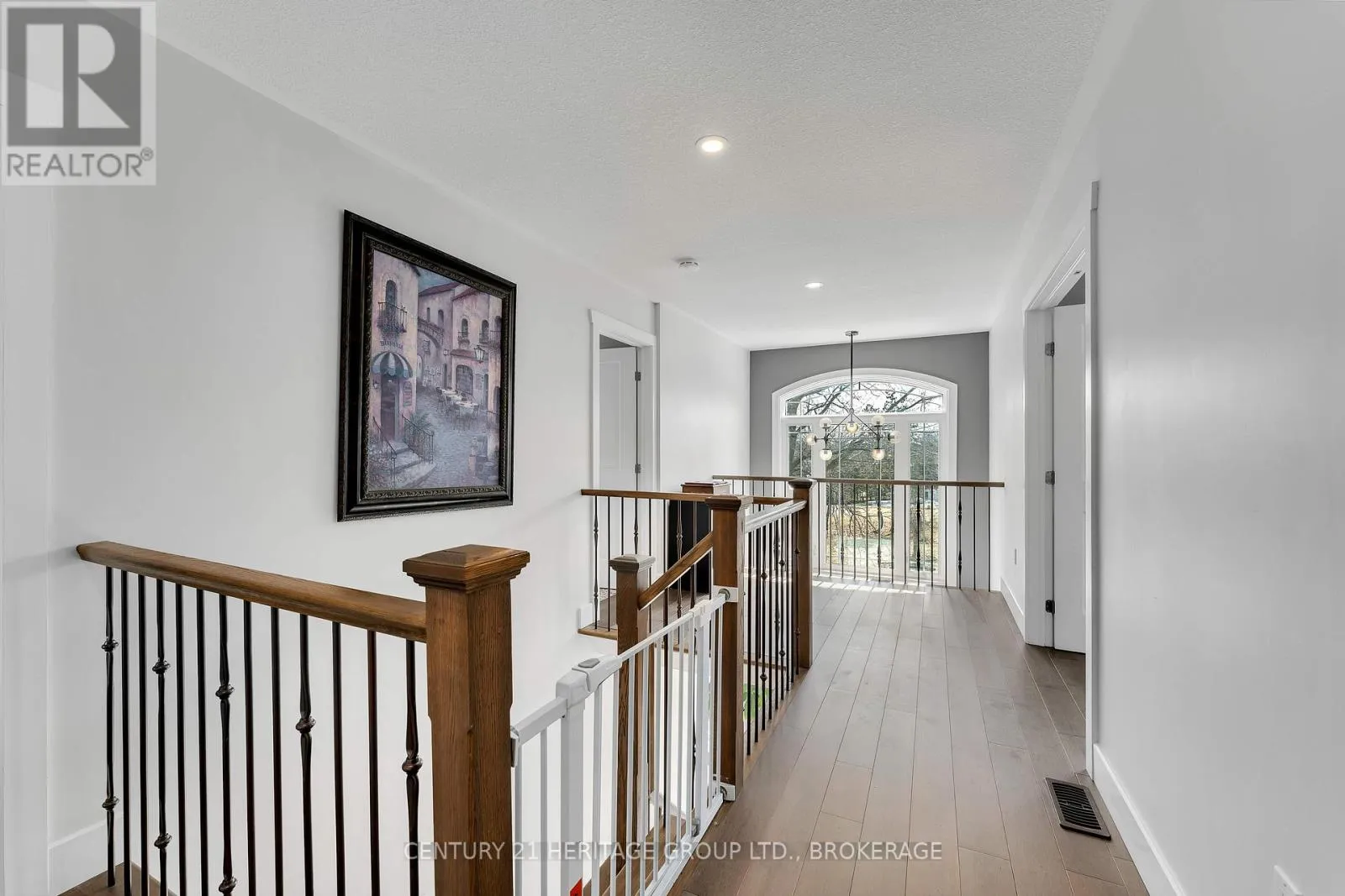 Montreal St to Aragon Rd Set on a picturesque three-acre property just minutes from downtown and the 401, this exceptional residence offers a rare blend of privacy, space, and refined living. Thoughtfully designed with four bedrooms and four bathrooms, the home showcases quality craftsmanship and a layout that balances everyday comfort with elevated style. A welcoming mudroom entry leads into a beautifully appointed main floor featuring a dedicated office, convenient laundry, and elegant living spaces. At the heart of the home is a stunning, light-filled kitchen with quartz countertops, flowing seamlessly into the dining area and an impressive family room with soaring vaulted ceilings and a wood-burning fireplace. Hardwood flooring throughout adds warmth and sophistication. The primary suite is a true retreat, complete with a well-appointed ensuite and generous closet space. The fully finished lower level offers exceptional flexibility with a spacious rec room, additional bedroom, bathroom, and ample storage-ideal for guests or multi-generational living. The expansive grounds provide endless opportunities for outdoor enjoyment, complemented by a three-car garage. Planned enhancements to nearby Cecil and Wilma Graham Park, including a boat ramp, picnic areas, and walking paths, are expected by 2027, adding even more lifestyle value to this already desirable location. A rare opportunity to enjoy the best of country living with city convenience. (id:27476)